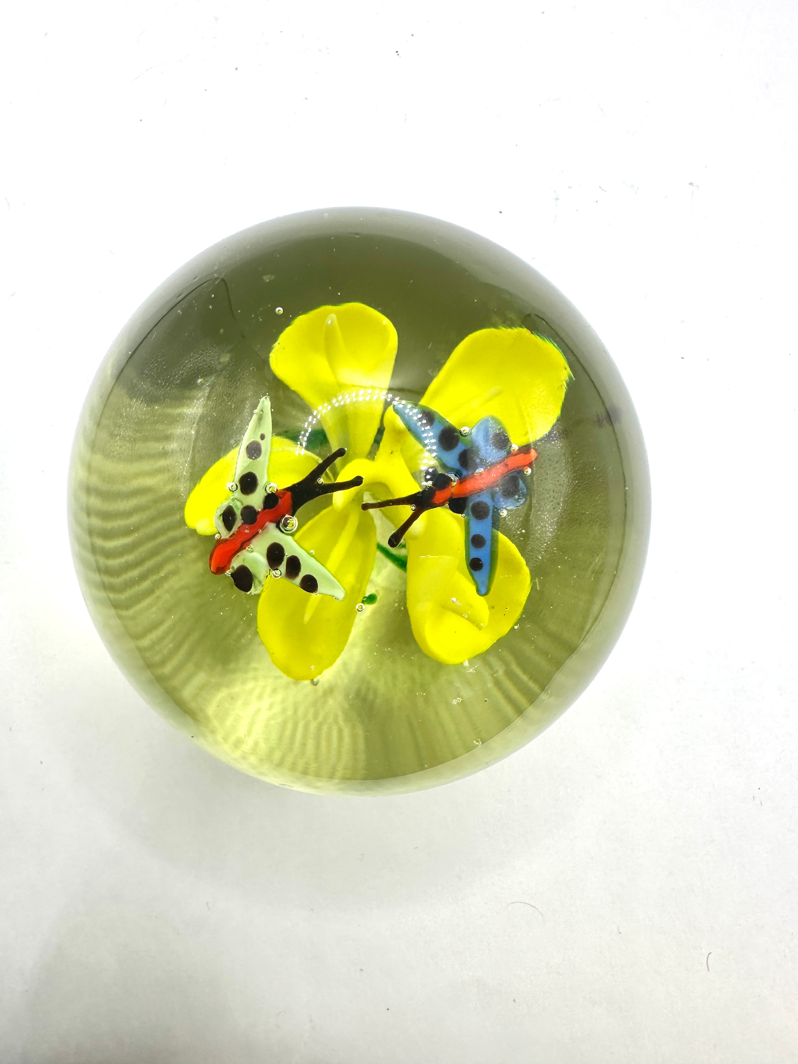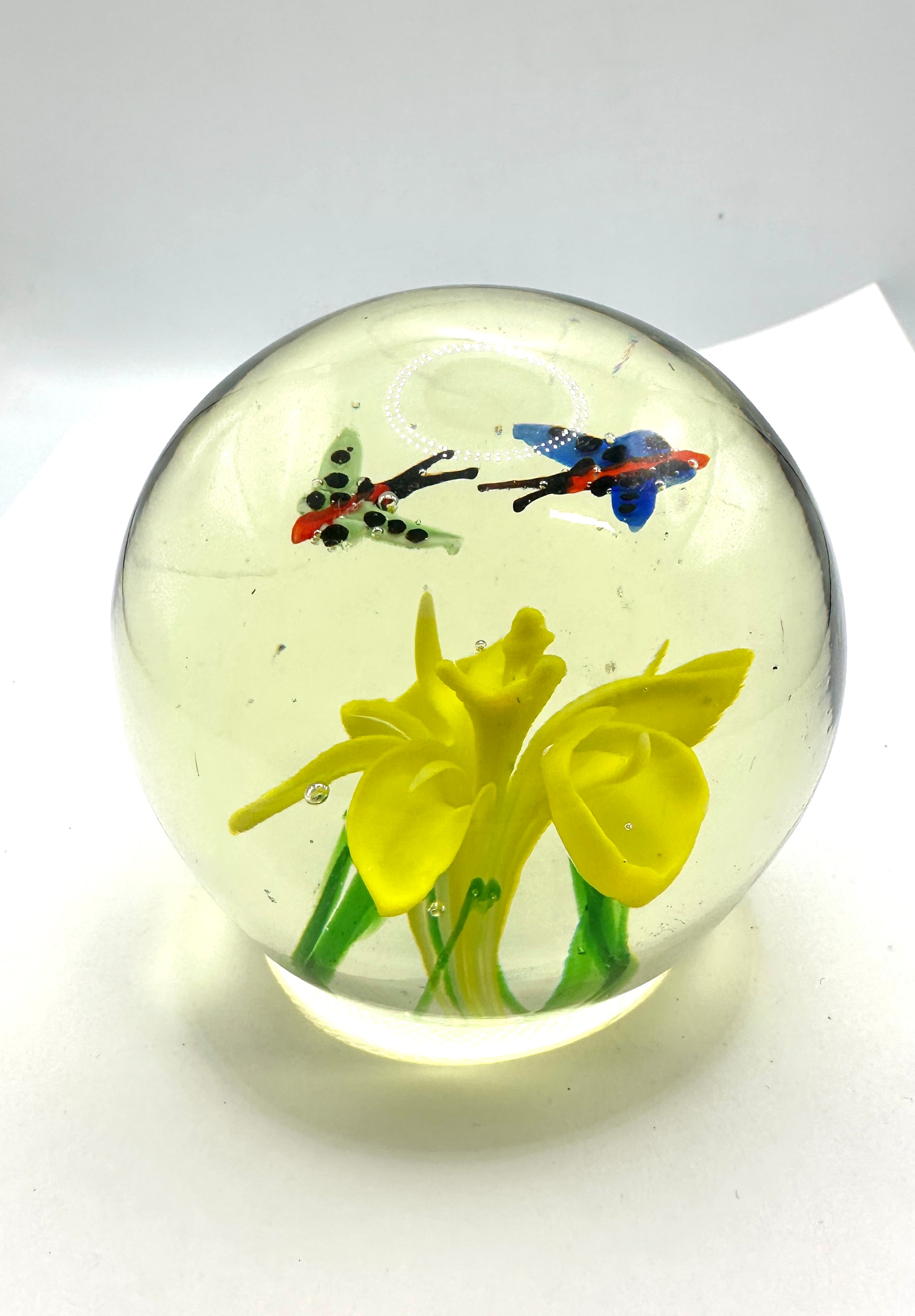A spherical clear glass paperweight, internally decorated with lampwork elements. The design features a cluster of yellow flowers with green stems, accompanied by two stylized insects resembling butterflies; one predominantly light green with black spots and red details, the other blue with black spots and red accents. Numerous small air bubbles are visible within the clear glass, some appearing intentionally placed around the floral inclusions. The clear glass exhibits a slight yellowish tint.