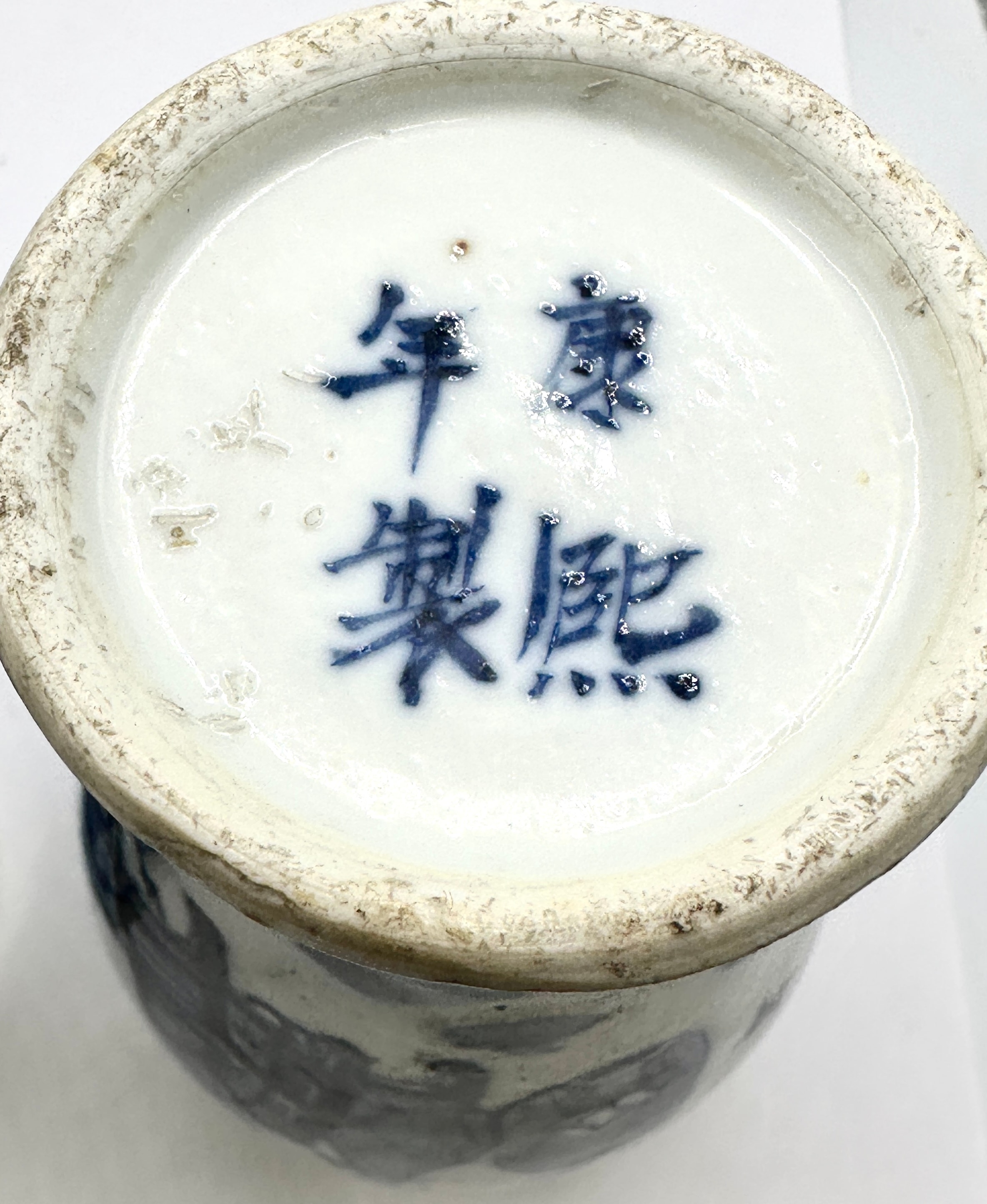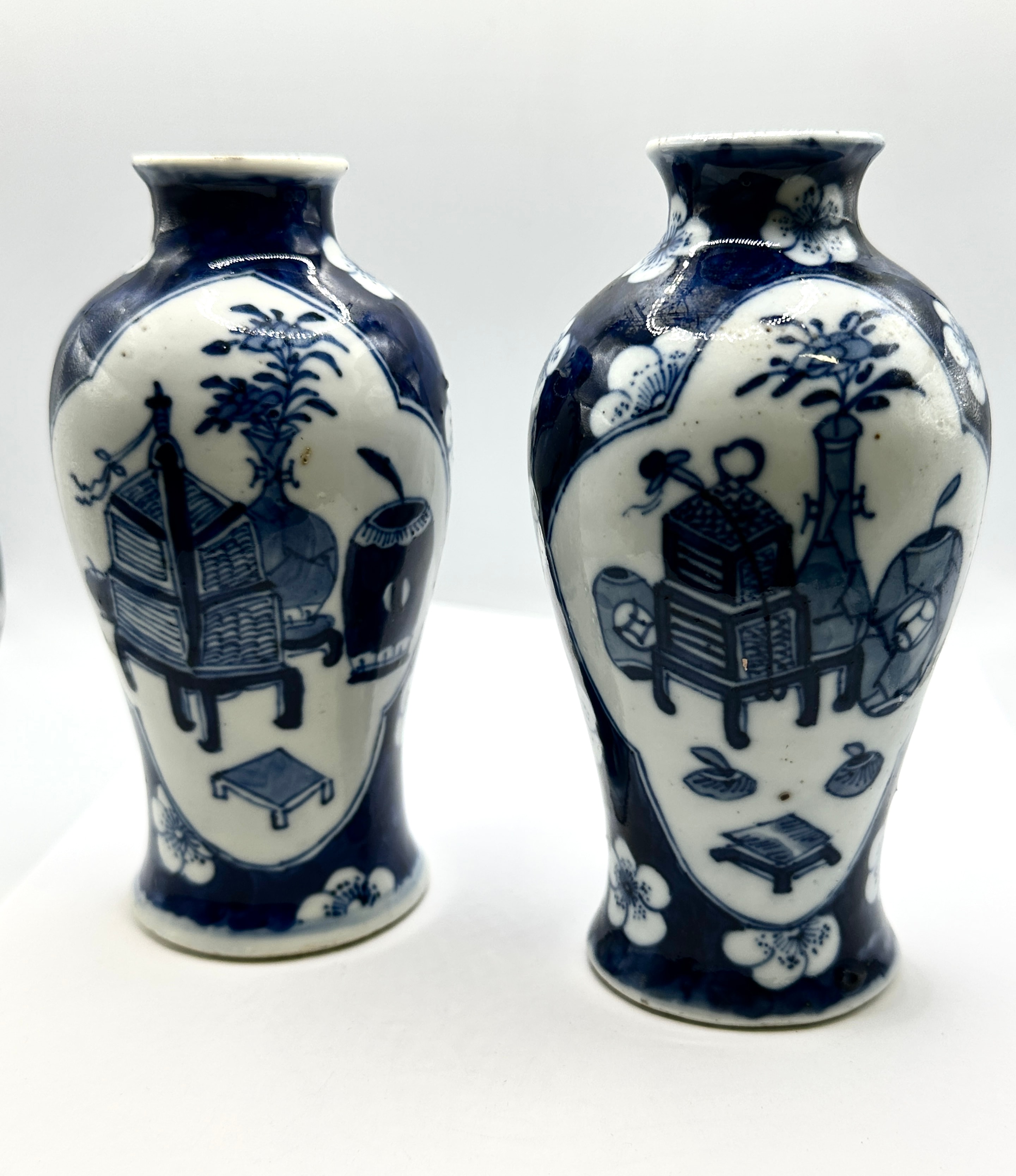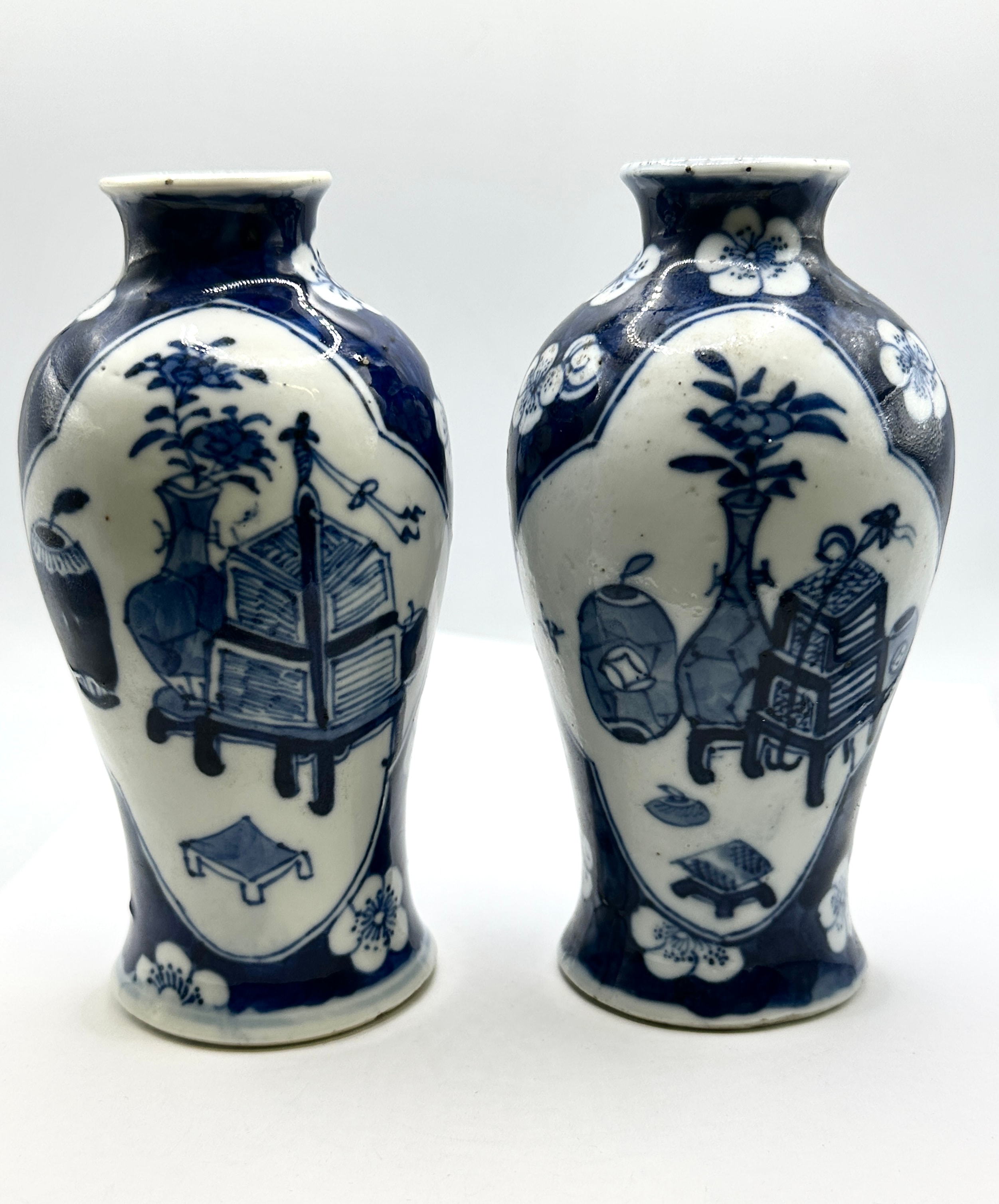 A pair of blue and white glazed porcelain vases, each featuring a classic baluster form with a slightly flared neck and rim, resting on a raised foot. The decoration is executed in underglaze blue on a white ground, depicting alternating cartouches that enclose various scholarly objects and antiquities, such as stacked books, vases with flowers, and scrolls, against a backdrop of stylized floral and cloud motifs. The base of one vase bears an underglaze blue four-character reign mark, reading ‘康熙年製’ (Kāngxī nián zhì), which translates to “Made in the Kangxi reign.”