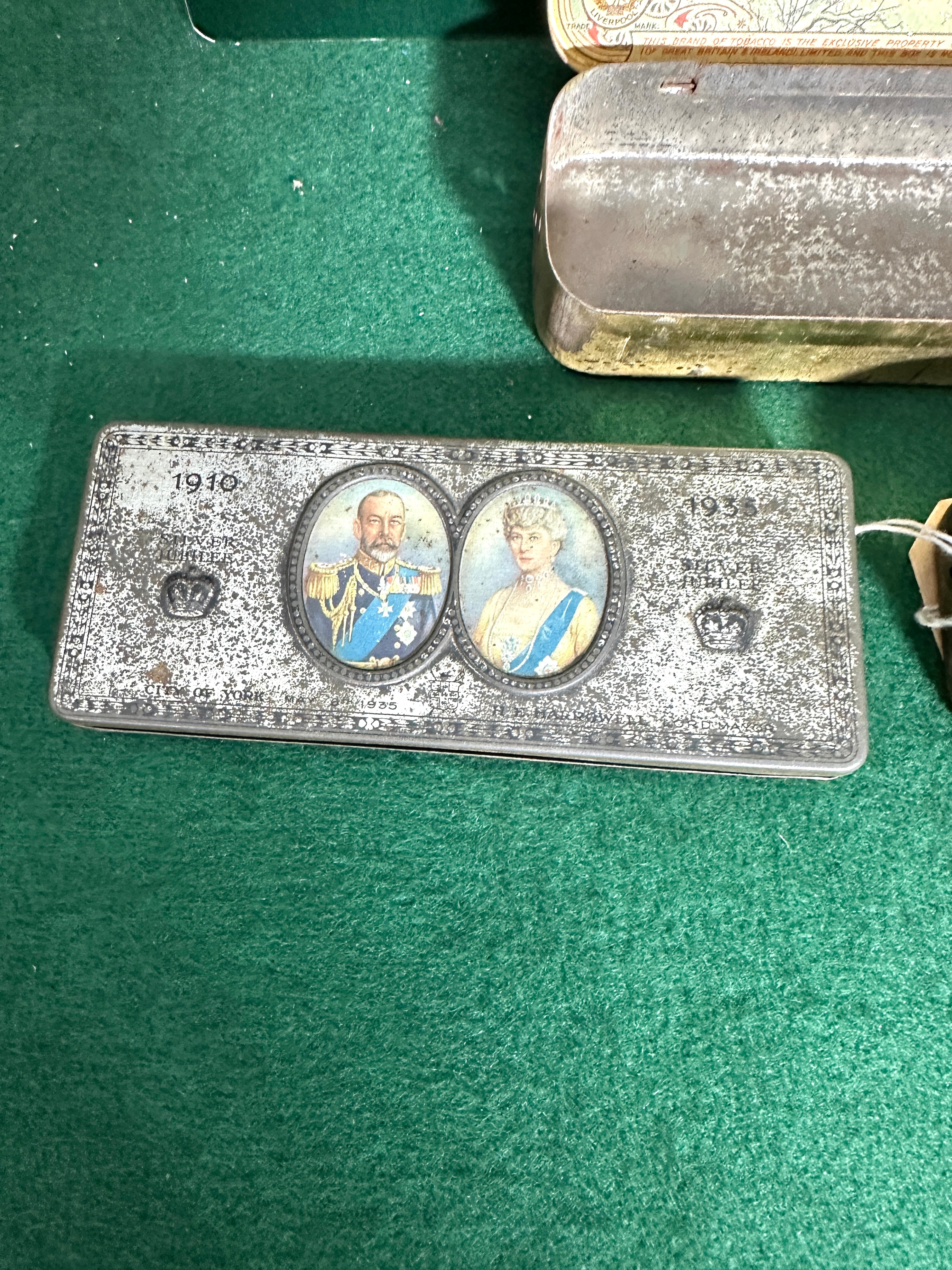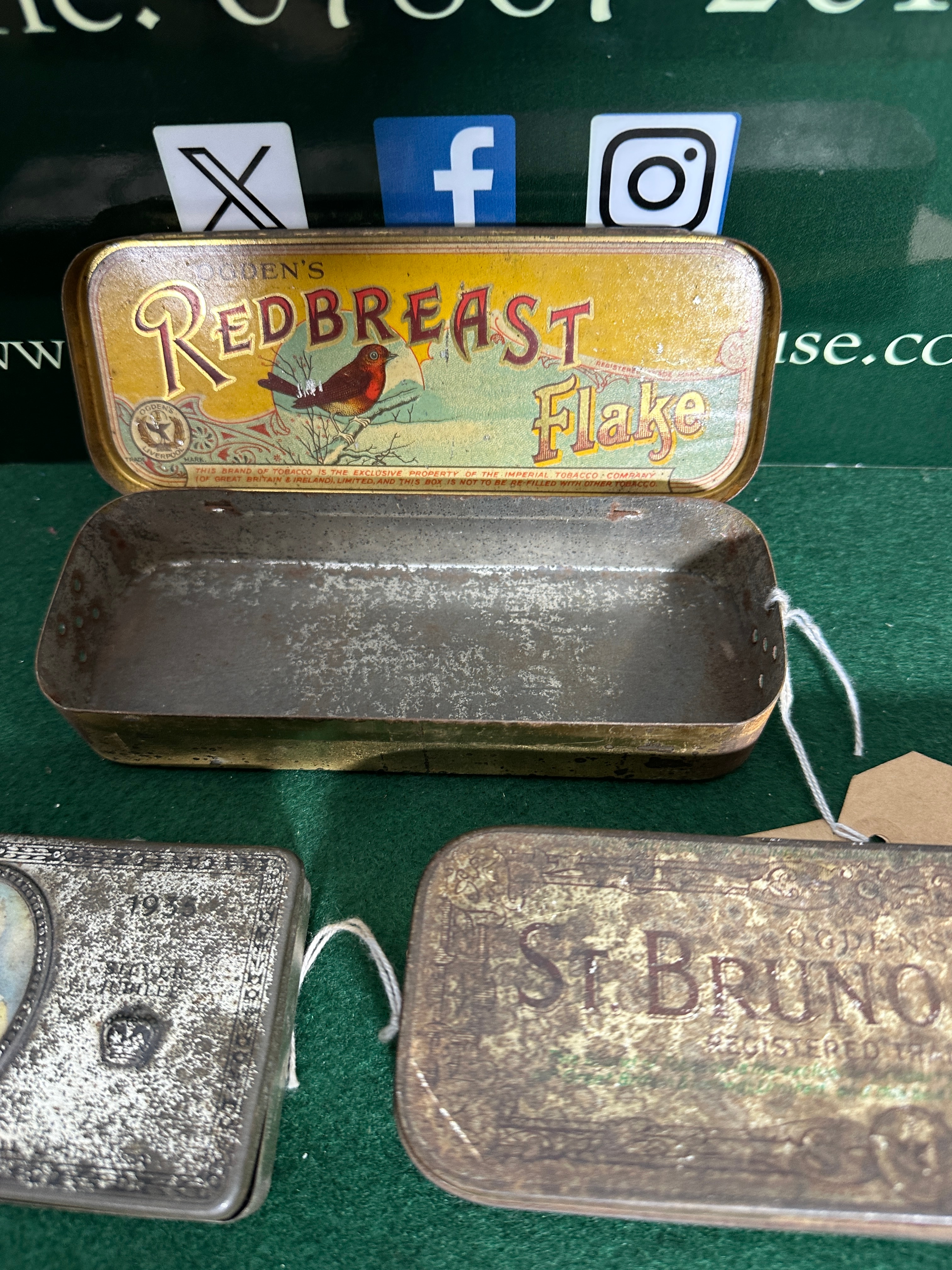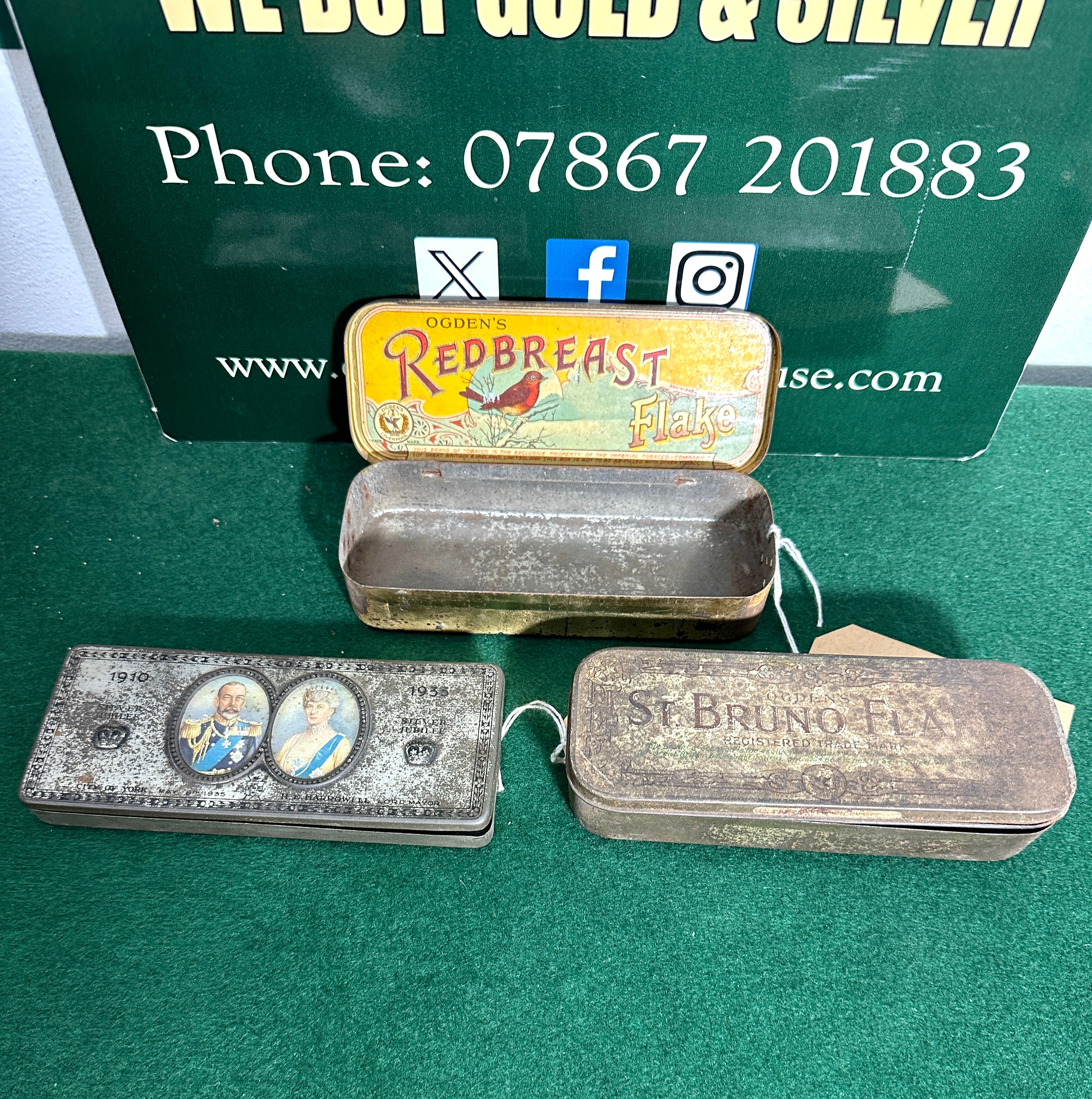 A collection of three rectangular tinplate containers, dating from the early to mid-20th century. The group includes an “OGDEN’S REDBREAST Flake” tobacco tin, featuring a robin illustration, marked as made by “GODFREY PHILLIPS LTD LONDON” for the “IMPERIAL TOBACCO COMPANY”. Also present is a commemorative tin, explicitly dated “1910” to “1935” and bearing the text “SILVER JUBILEE,” adorned with oval portraits of “KING GEORGE V” and “QUEEN MARY,” along with crown motifs and faint “IMPERIAL TOBACCO COMPANY” branding. The third tin is branded “St BRUNO FLAKE,” with “REGISTERED TRADE MARK” partially visible.