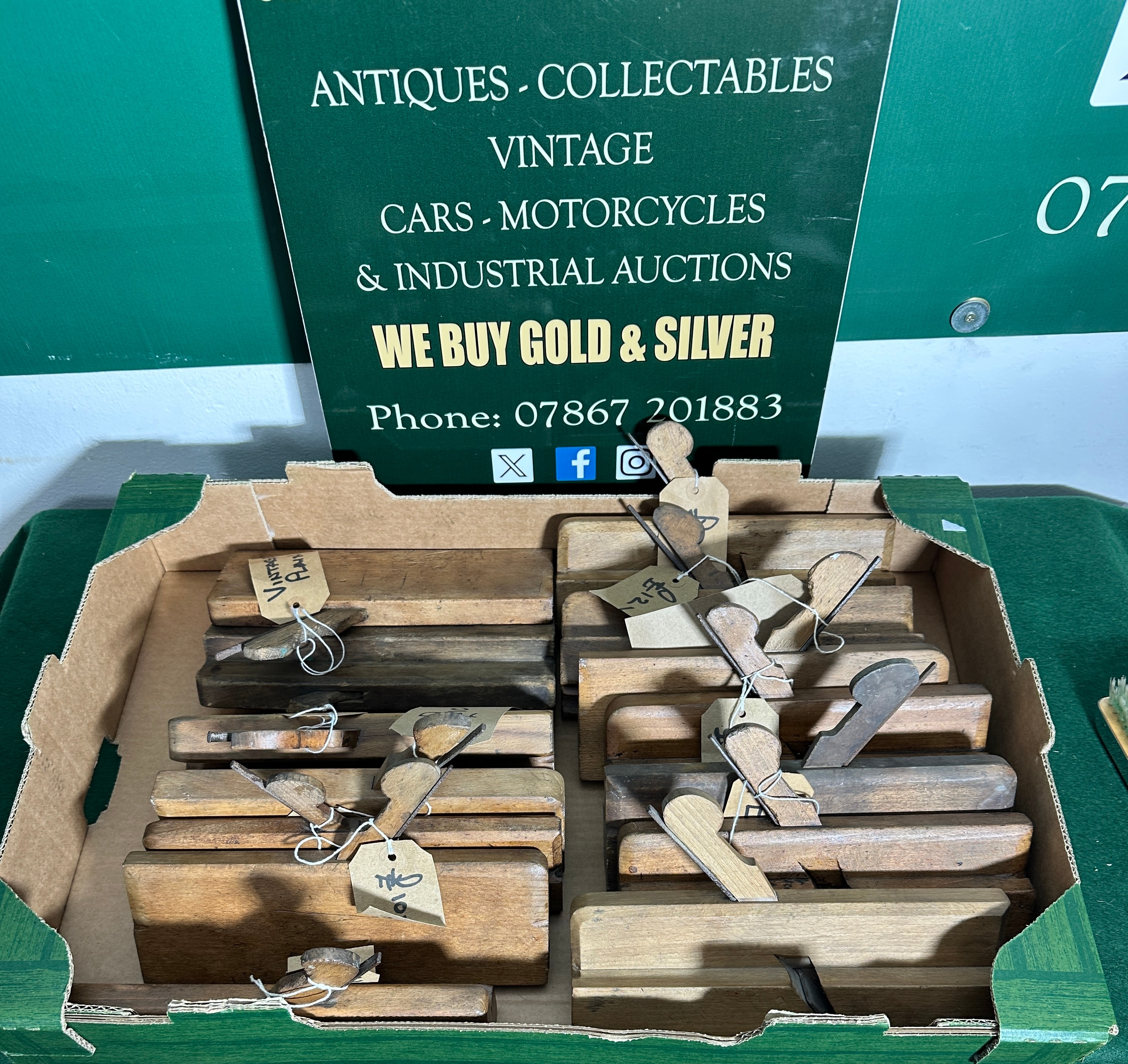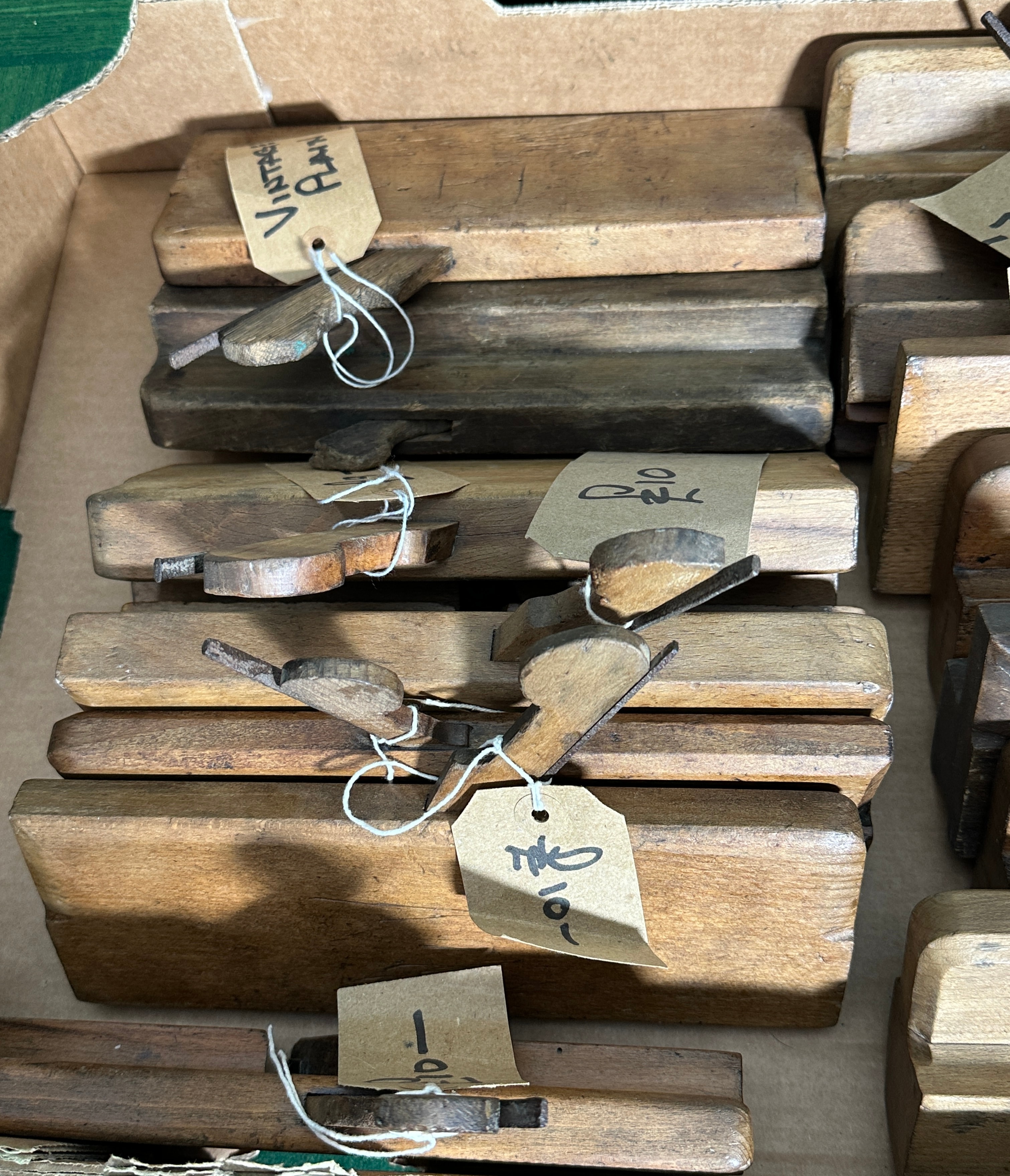 A collection of approximately two dozen antique or vintage wooden hand planes, primarily appearing to be specialized moulding or shaping planes, housed within a cardboard box. Each plane is constructed from various hardwoods, featuring a metal cutting iron secured by a wooden wedge, consistent with traditional woodworking tools. Visible handwritten tags on individual items include “Vintage Plan” (likely referring to “Vintage Plane”), “No 10-“, “E12”, and other numerical markings.