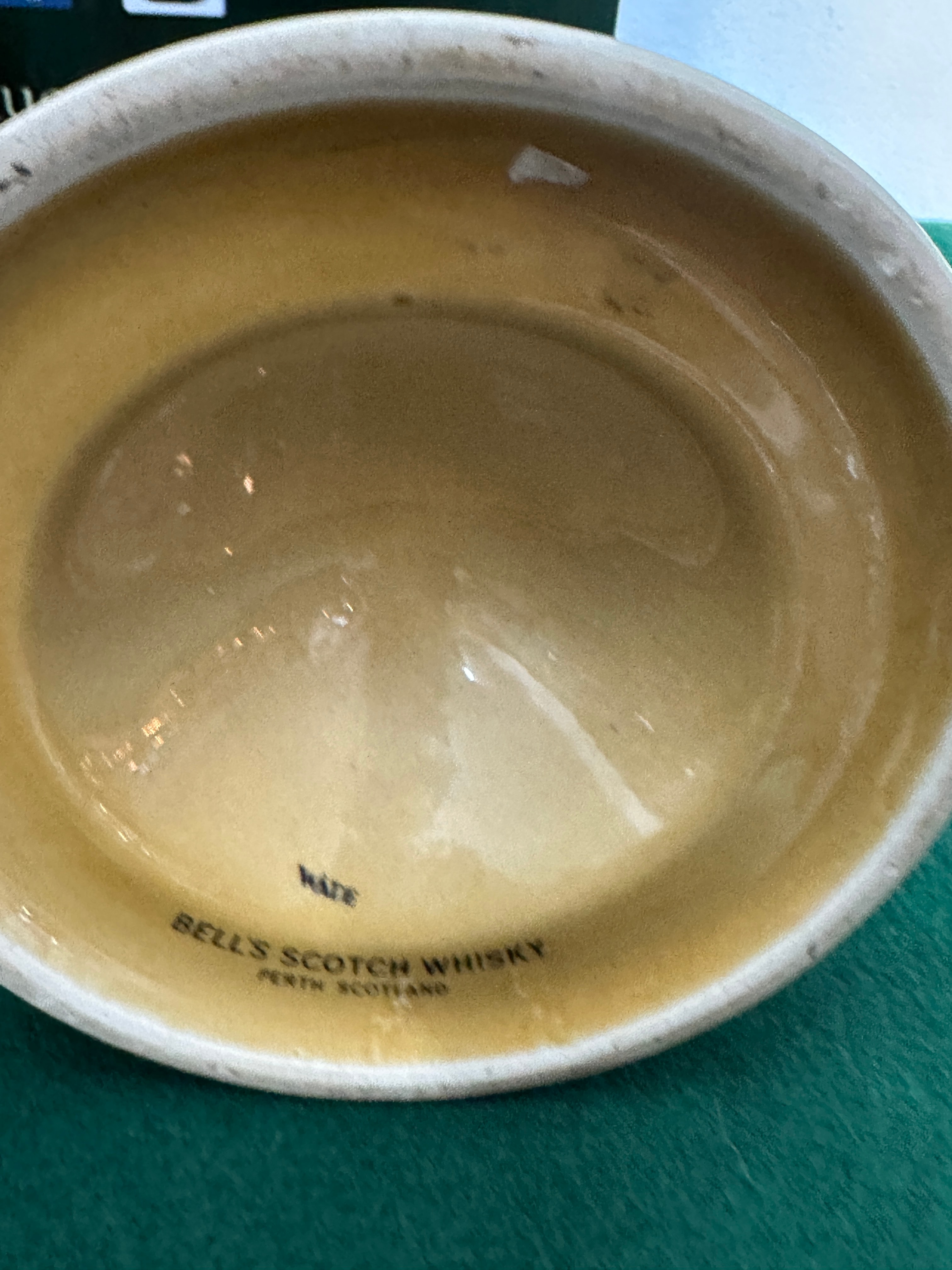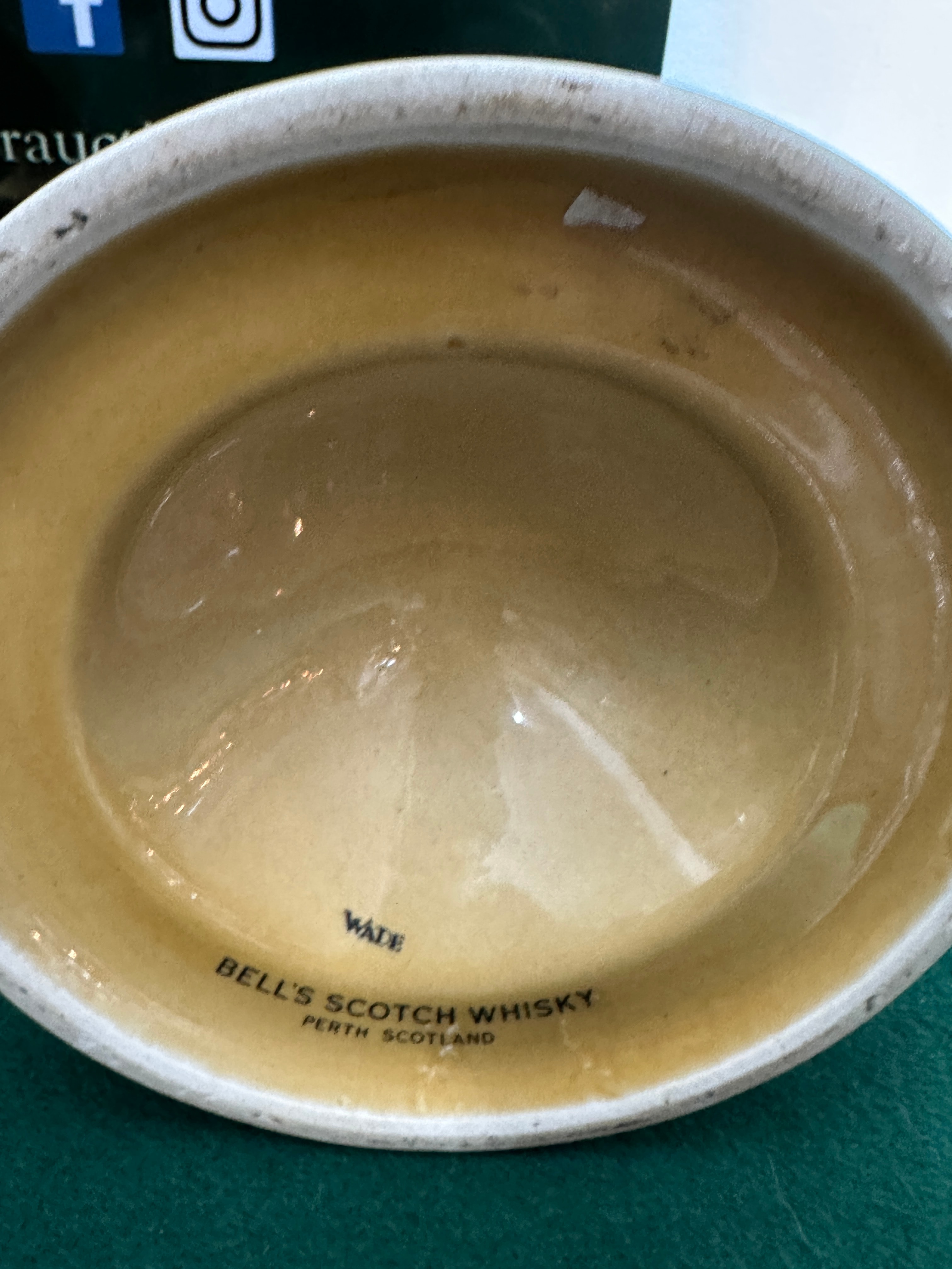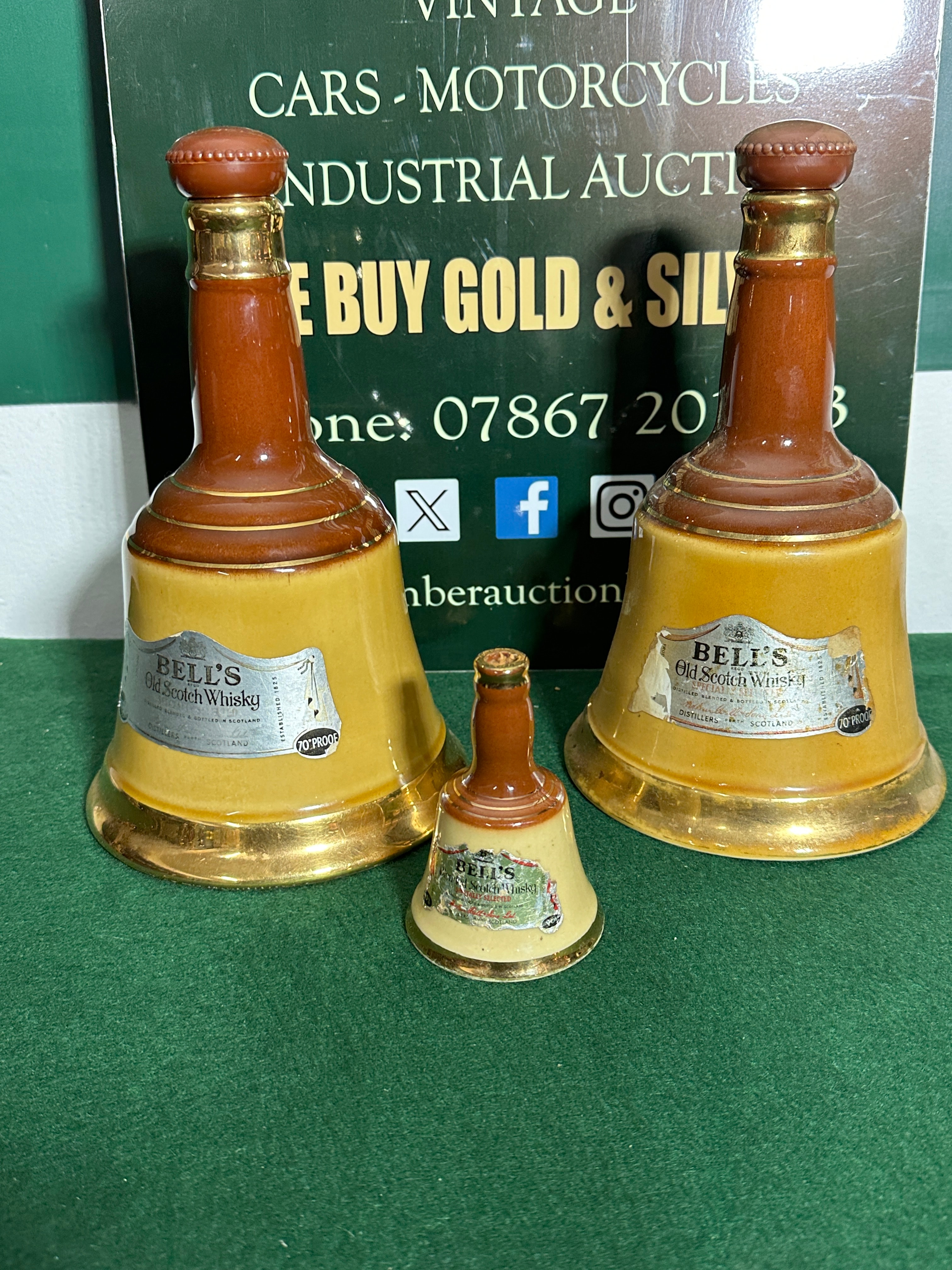 A collection of three Wade ceramic decanters for Bell’s Scotch Whisky, comprising two larger examples and one miniature. Each decanter is bell-shaped with a distinctive two-tone brown and yellow glazed finish, accented with gilt-painted details, and topped with a cork-stoppered ceramic cap. The two larger decanters feature metallic labels reading ‘BELL’S Old Scotch Whisky’, ‘A. BELL & SONS Perth Scotland’, ’70° PROOF’, and ‘PRODUCE OF SCOTLAND’. The smallest decanter has a decorative label depicting a Highlander scene with ‘BELL’S Scotch Whisky’. An impressed manufacturer’s mark ‘WADE’, ‘BELL’S SCOTCH WHISKY’, ‘PERTH SCOTLAND’ is visible on the base of one larger decanter.