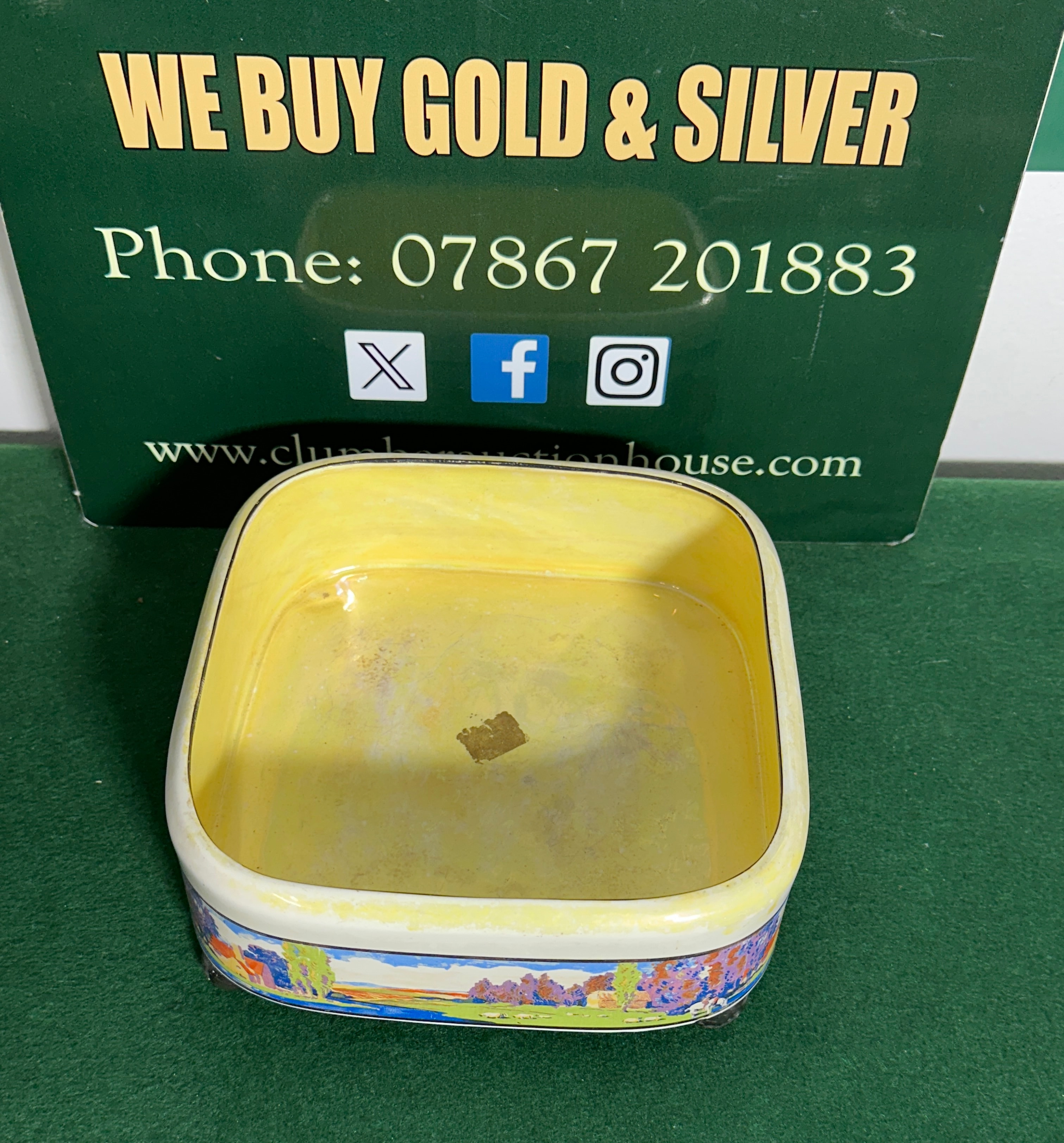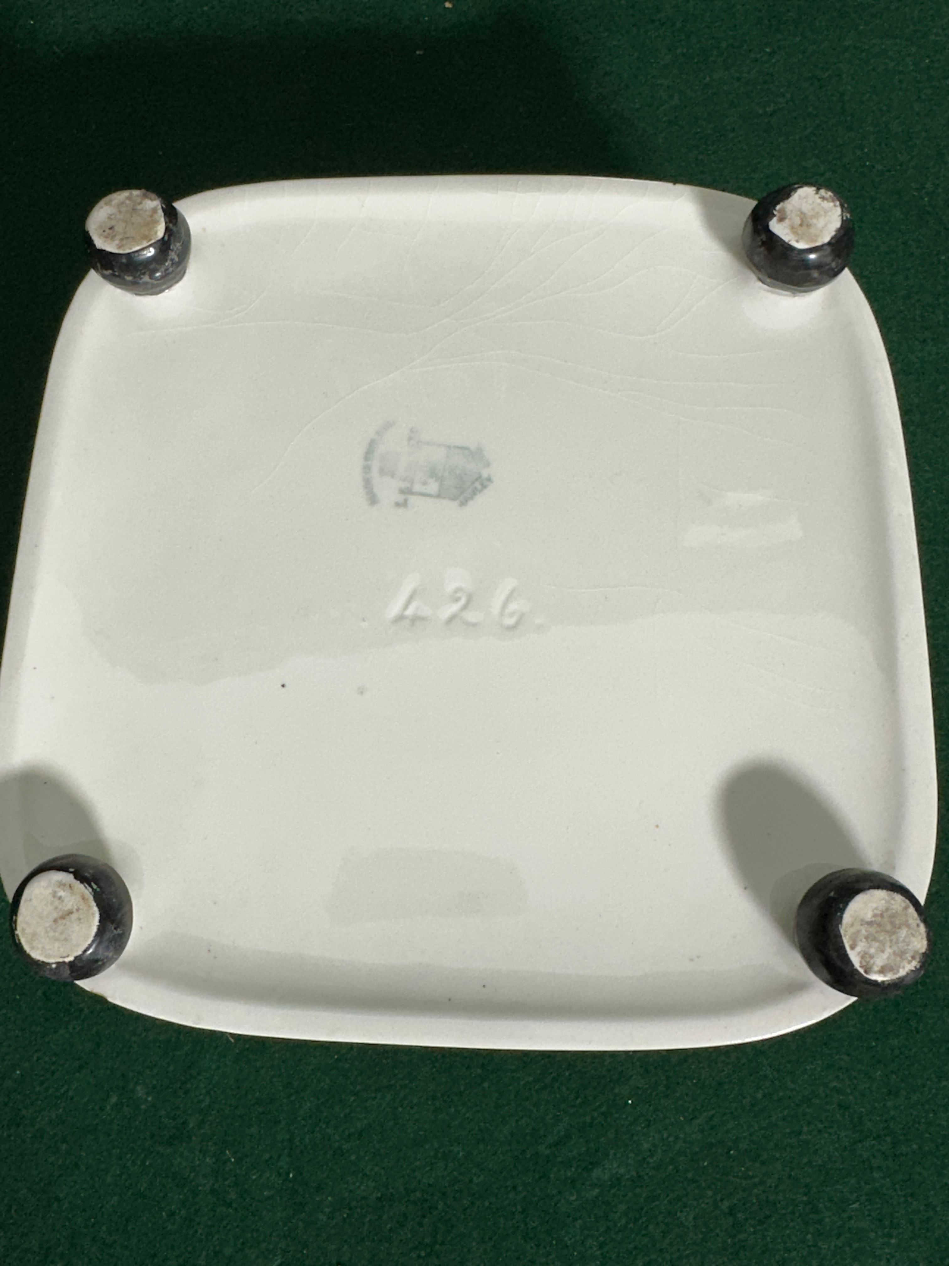 An Art Deco ceramic footed dish by Lancaster & Sons, Hanley. This small, rectangular, glazed ceramic dish features a brightly colored, stylized landscape band on its exterior, depicting trees, hills, and a river in blues, greens, oranges, and purples. This contrasts with an off-white rim and base, and a yellow interior. The item stands on four dark feet. The underside bears a faded, stylized factory or maker’s mark (resembling a building or shield) alongside the hand-painted or stamped number ‘426.’