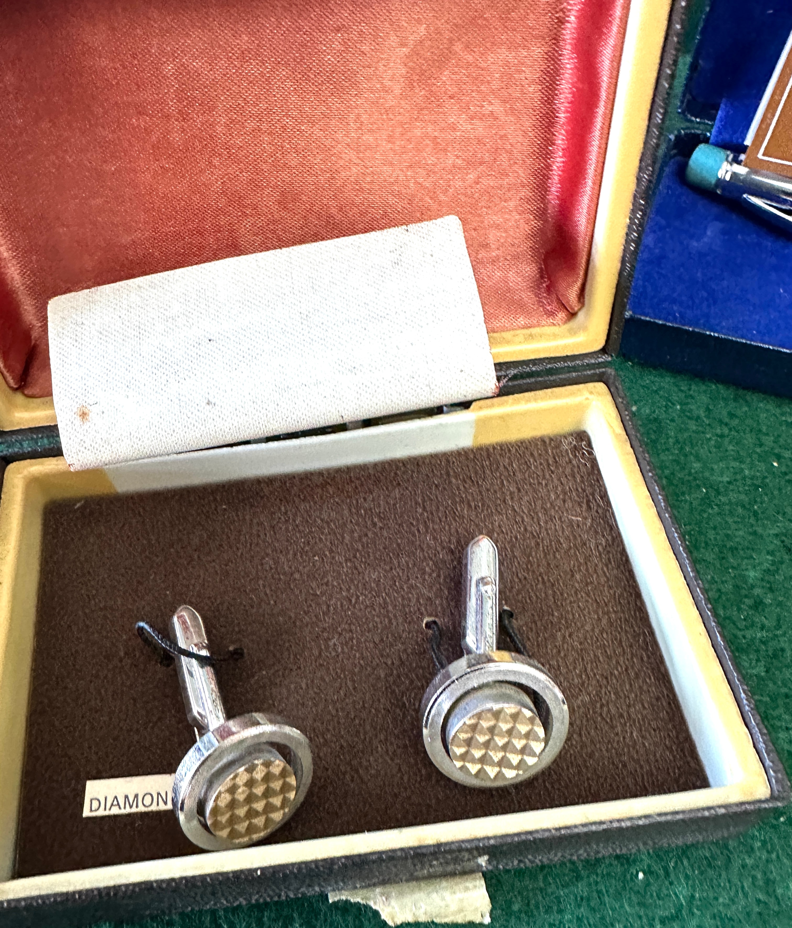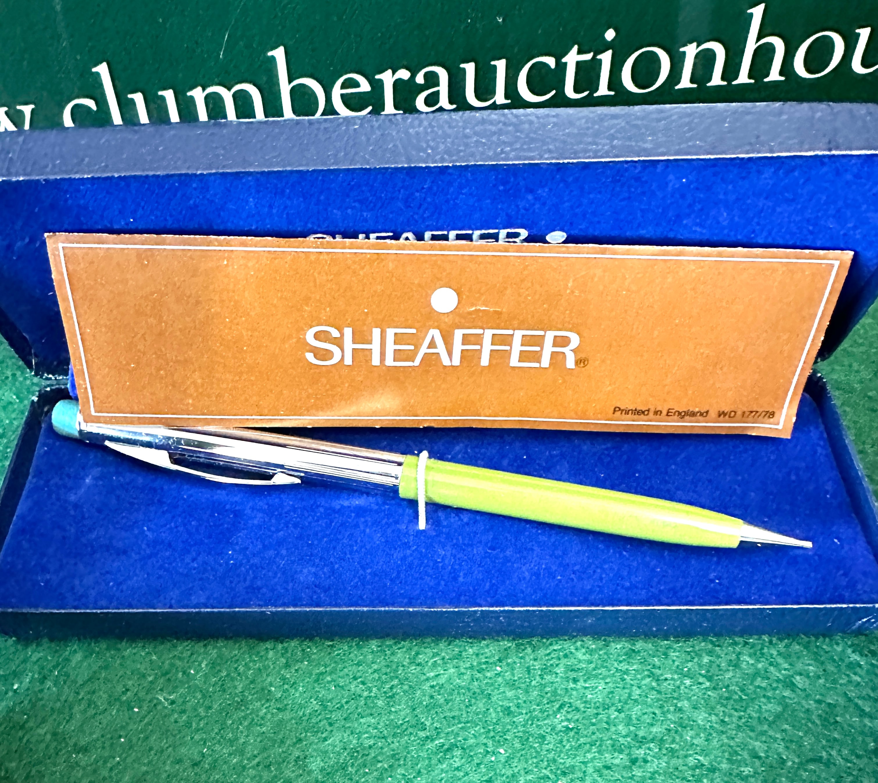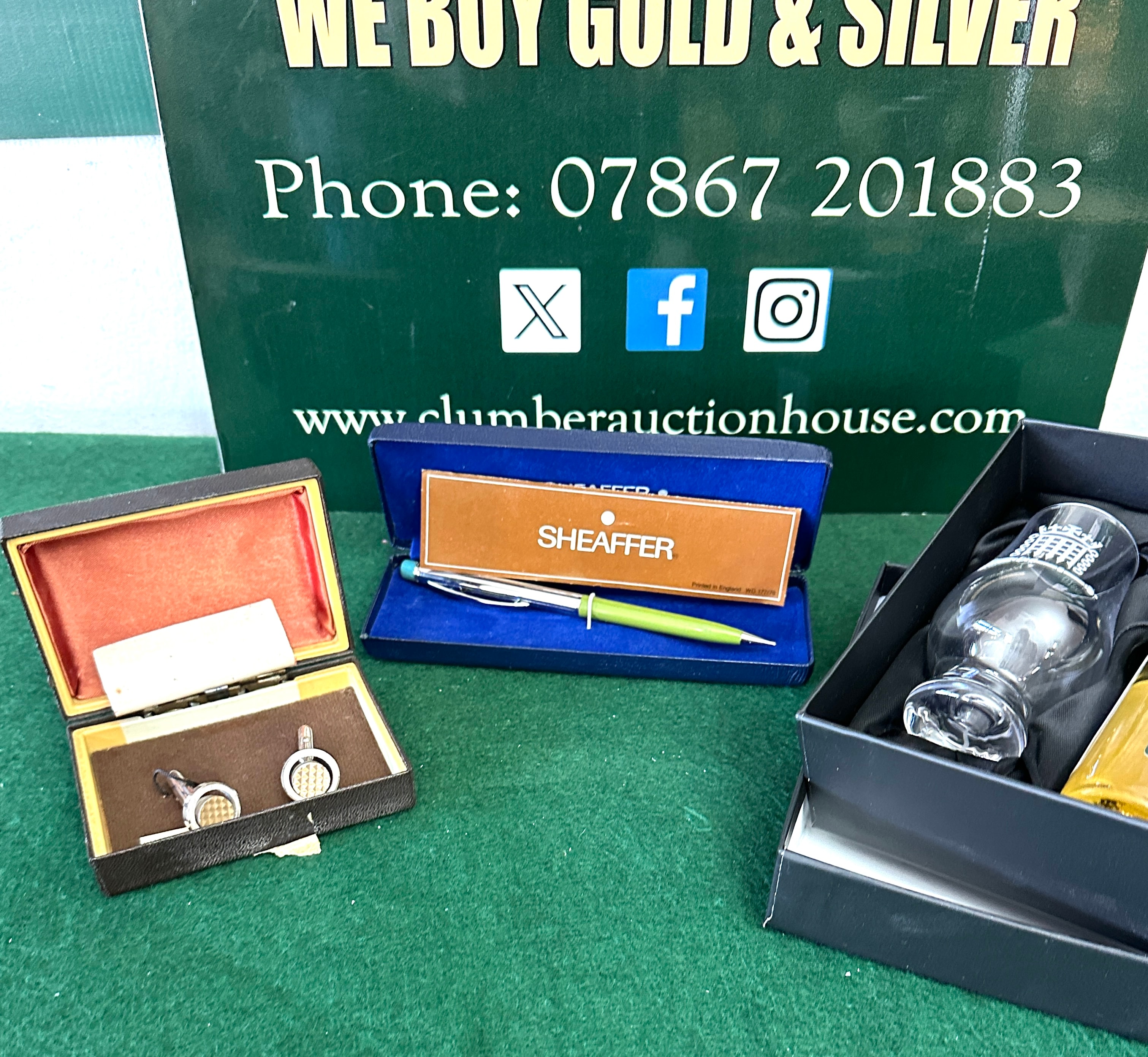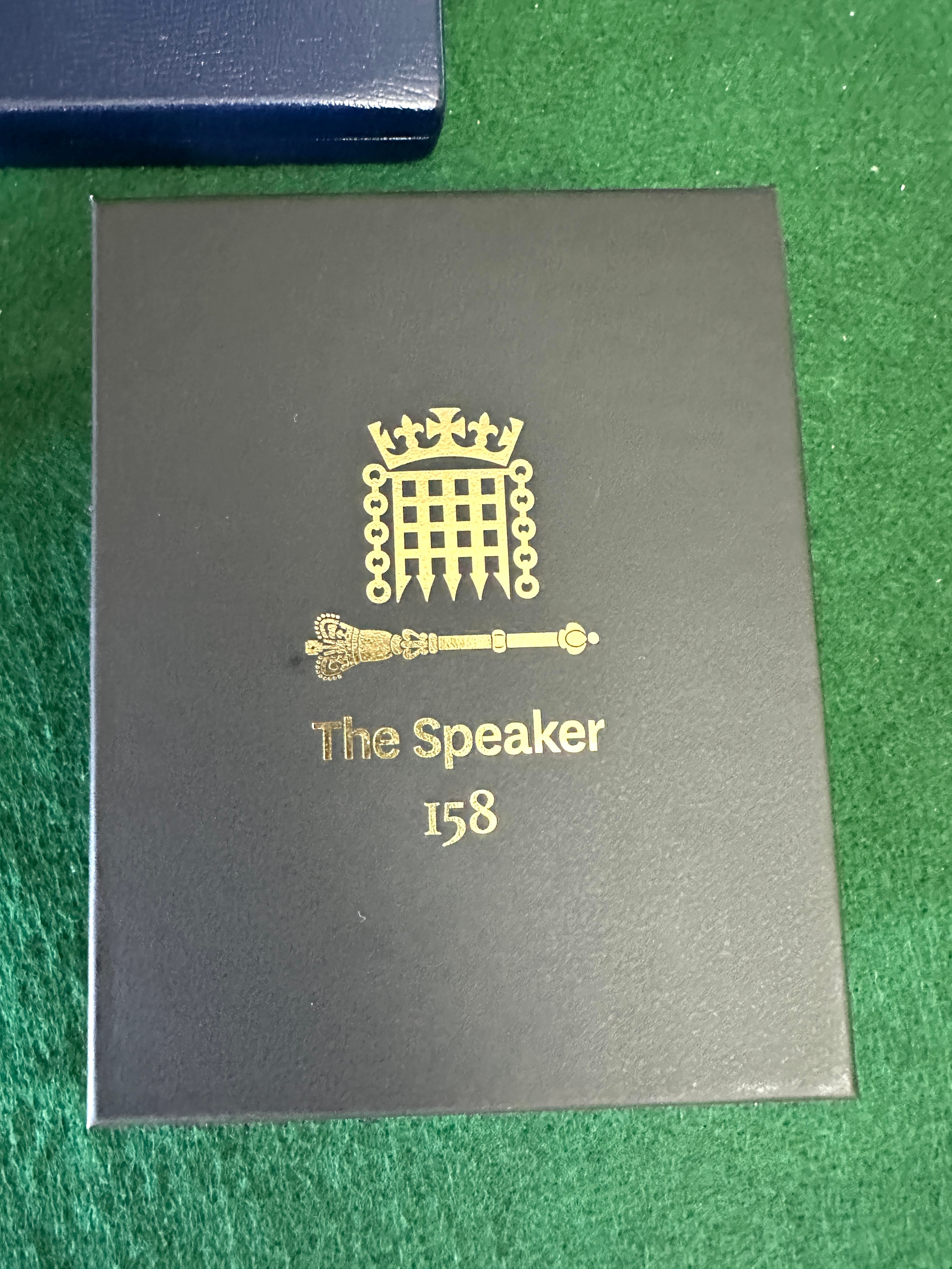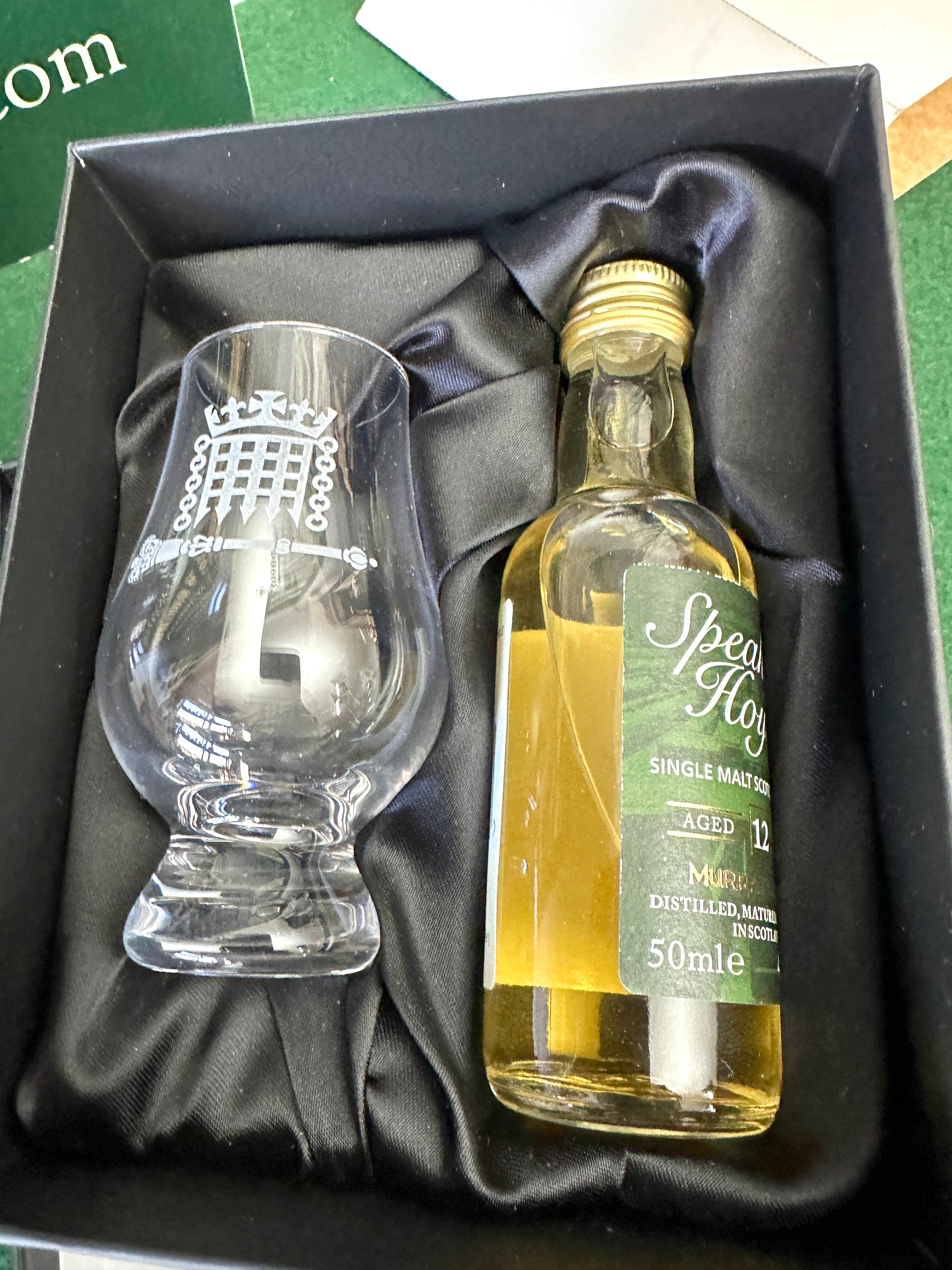 A Sheaffer pen with a silver-toned top and a bright lime green barrel, presented in its original blue velvet-lined box with a “Printed in England WO. 177/78” mark. Also included are a pair of silver-toned metal cufflinks featuring gold-toned textured circular faces, housed in a dark brown box with red velvet lining and a partial “DIAMON” label. Completing the lot is a “Speyburn Hoy SINGLE MALT SCOTCH AGED 12” whisky gift set, comprising a 50ml miniature bottle and a clear glass tumbler. Both are presented in a black satin-lined box, with the glass and box lid adorned with a gold embossed emblem of the Portcullis and a ceremonial mace, alongside the text “The Speaker” and “158”.