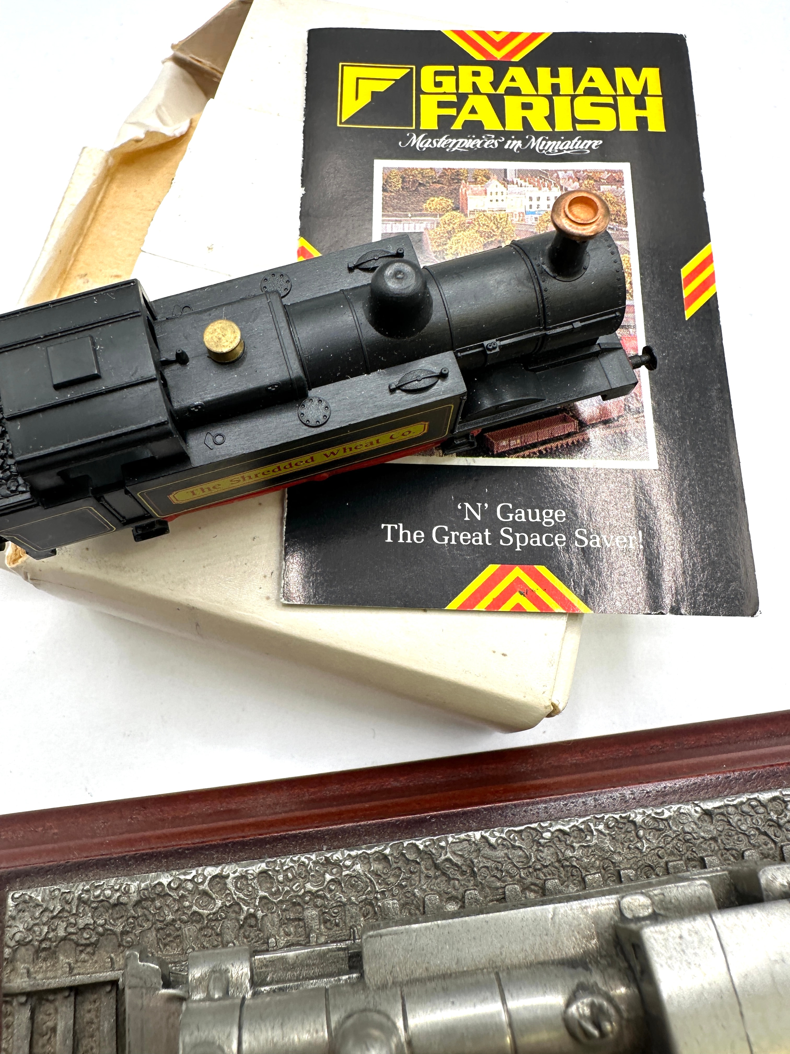 This lot features two distinct model locomotives. The first is an ‘N’ Gauge steam locomotive model, constructed from plastic and metal components, finished in black with “The Shredded Wheat Co.” clearly visible on its side. It is presented with a partially opened original cardboard box and a Graham Farish “Masterpieces in Miniature” brochure advertising “‘N’ Gauge The Great Space Saver!”. The second item is a static display model of a steam locomotive and tender, crafted from a silver-toned cast metal, possibly pewter or a similar alloy. This display model is mounted on a polished dark wood base and is marked “METROPOLITAN 26” on the locomotive and “GWR” on the tender. A small white label bearing the number “586” is affixed to the wooden base.