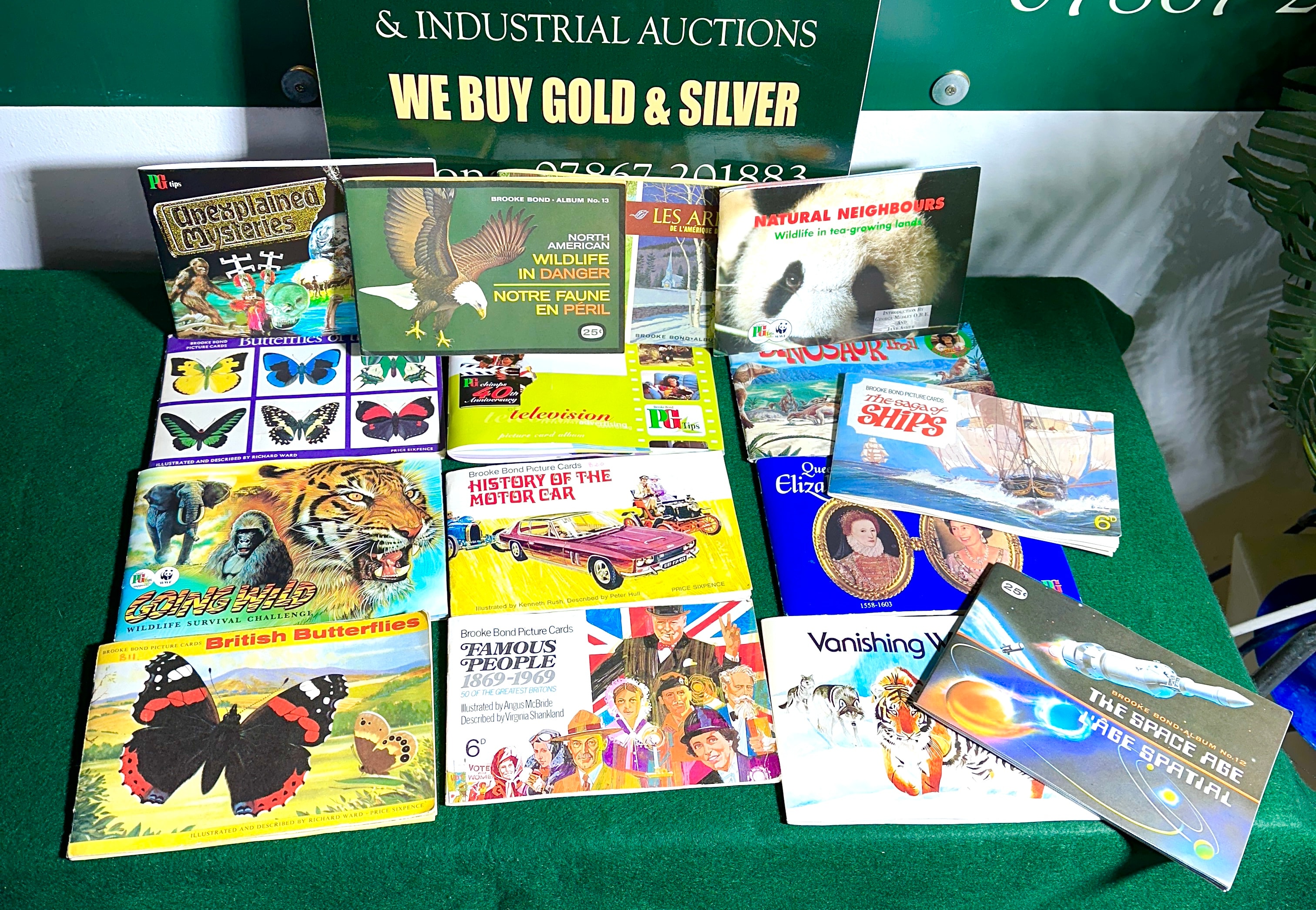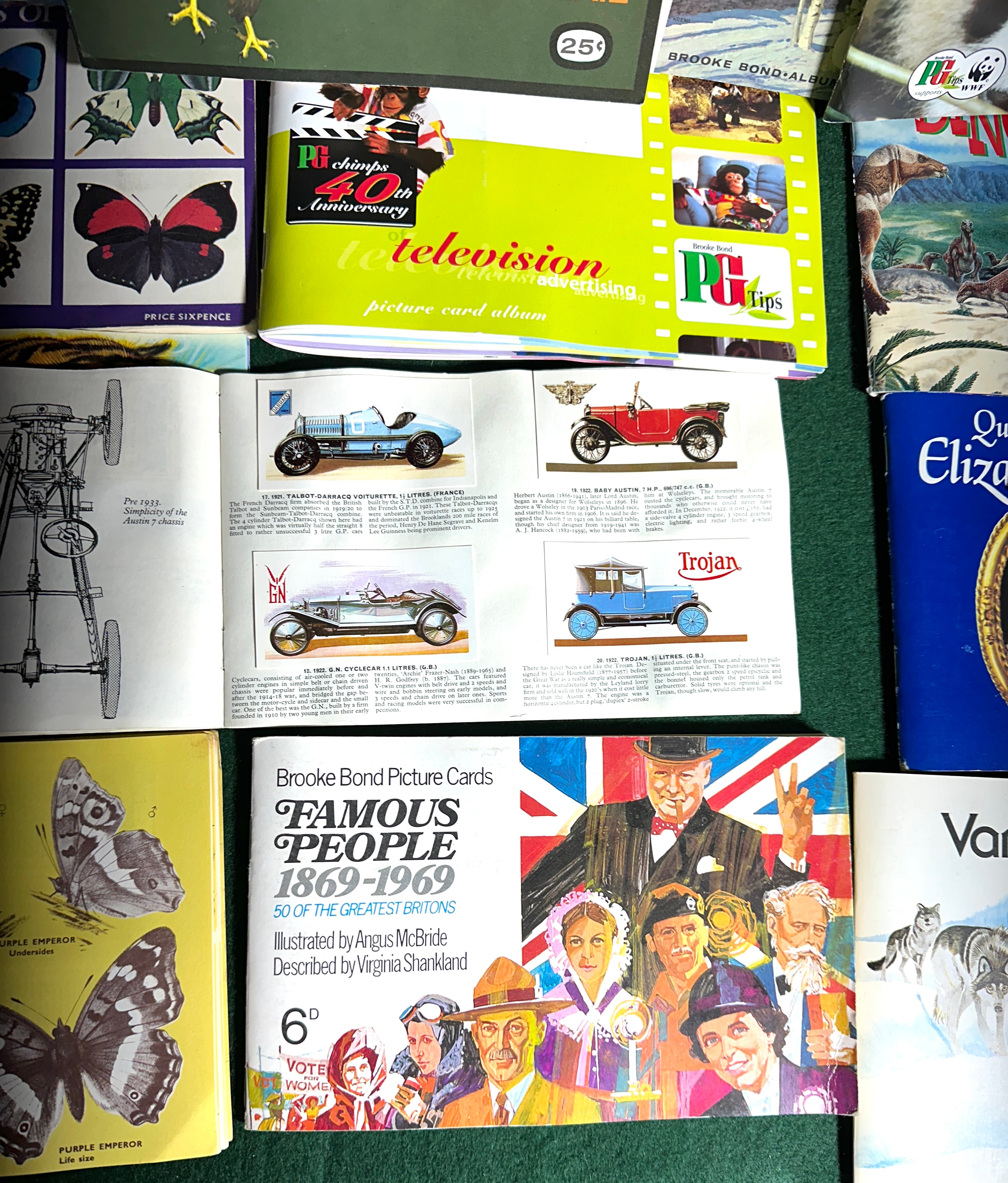 A collection of approximately two dozen vintage small-format booklets and softcover albums, predominantly identified as Brooke Bond Picture Cards publications. Dating from the mid-to-late 20th century, these items are constructed from paper and light cardboard. Visible titles include ‘Unexplained Mysteries,’ ‘Butterflies,’ ‘North American Wildlife In Danger’ (‘Notre Faune En Péril’), ‘History of the Motor Car,’ ‘Famous People 1869-1969,’ ‘The Space Age,’ and ‘The Saga of Ships.’ Branding such as ‘PG Tips’ and ‘WWF’ is also present. Historical pricing marks include pre-decimal currency (e.g., ‘PRICE SIXPENCE,’ ‘6d’) and early decimal currency (’25p’). Several titles feature French translations, notably ‘Notre Faune En Péril’ and ‘Les Animaux En Danger.’