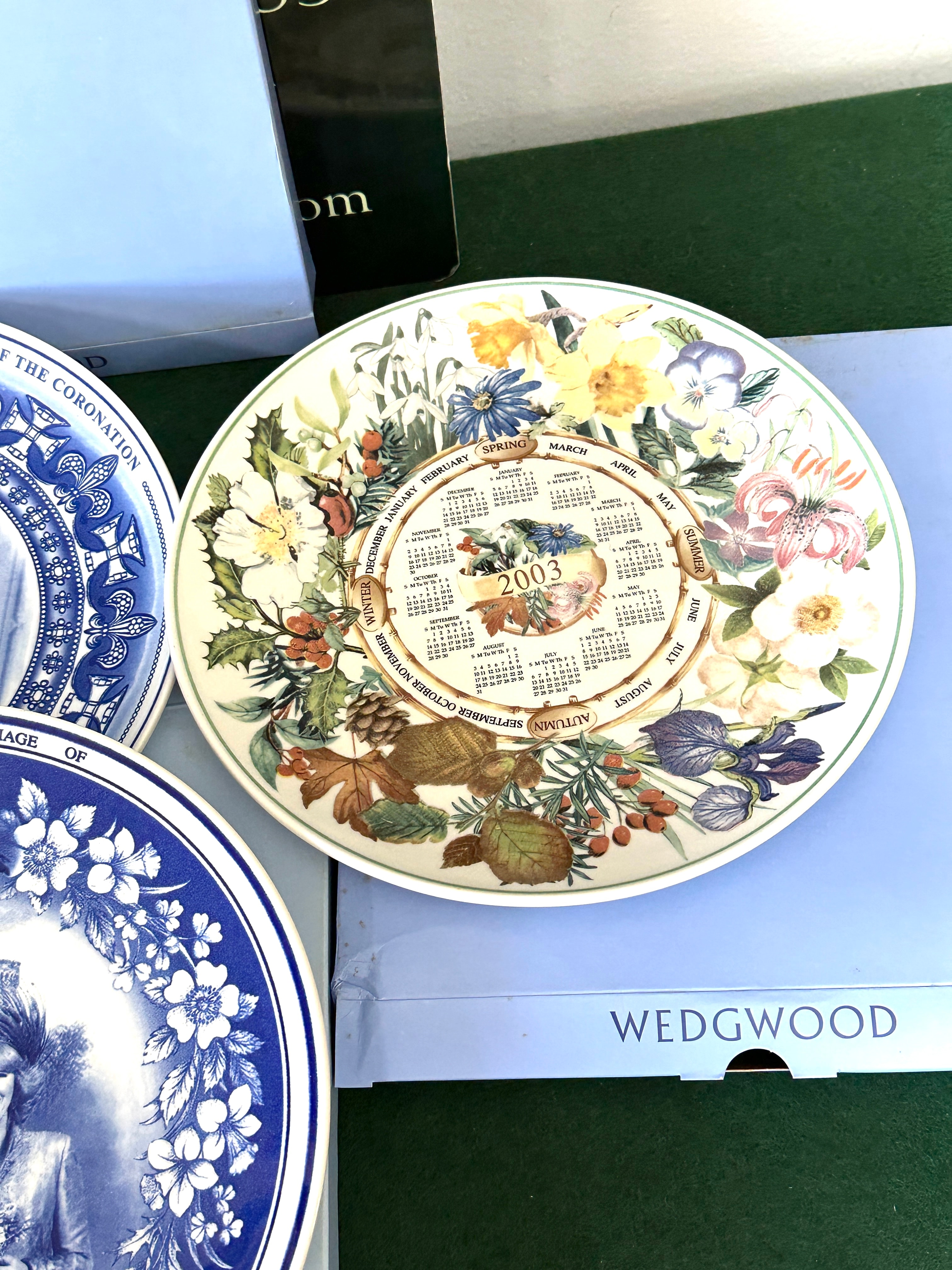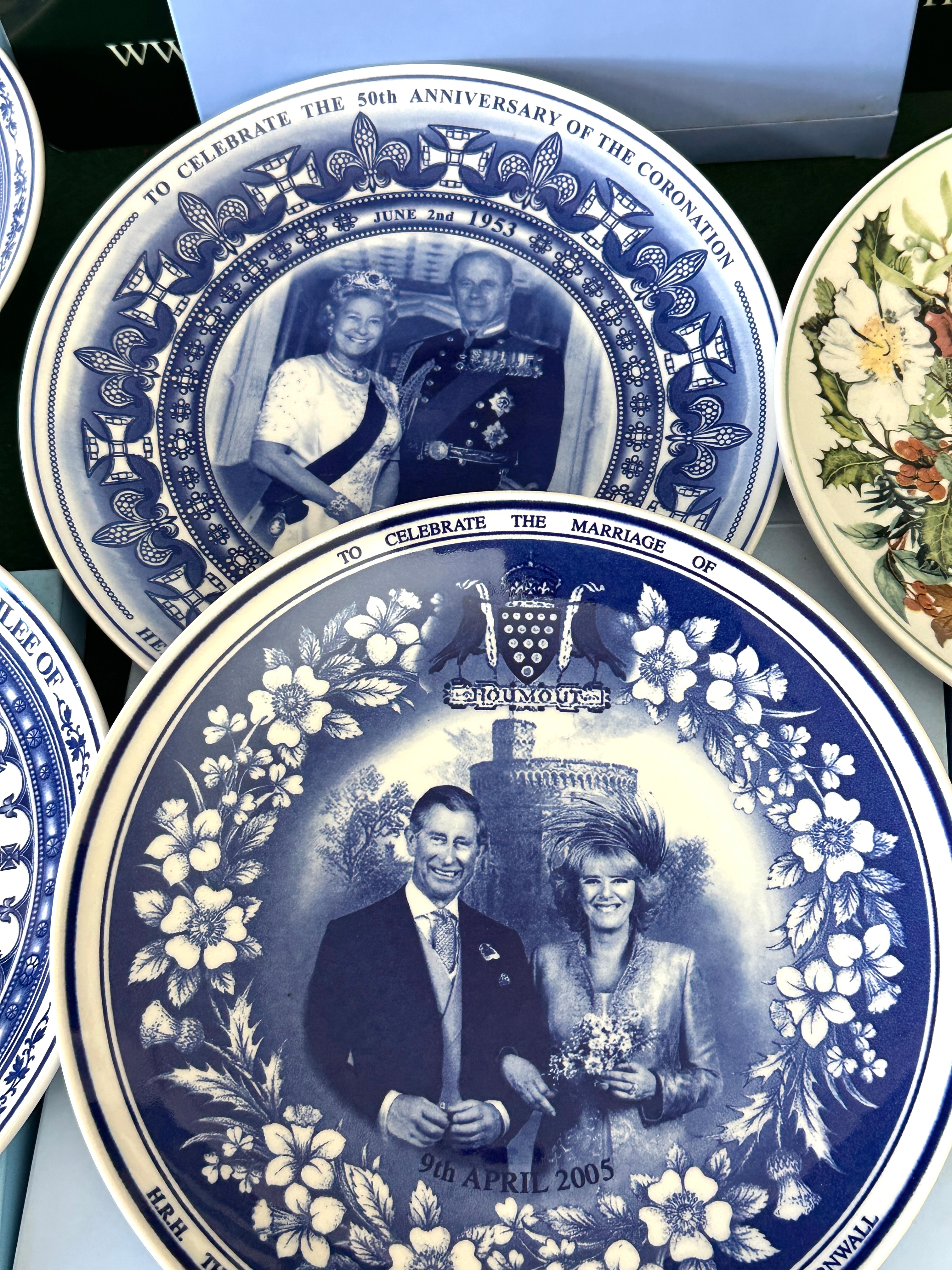 A collection of five Wedgwood fine china decorative plates. The group comprises four blue and white commemorative plates and one multi-colored botanical calendar plate. The commemorative plates celebrate British royalty, including one marking the life of Her Majesty Queen Elizabeth The Queen Mother (1900-2002), another for the 50th Anniversary of the Coronation of Her Majesty Queen Elizabeth II and Prince Philip (June 2nd, 1953-2003), a third for the Golden Jubilee of Her Majesty Queen Elizabeth II (1952-2002), and a fourth commemorating the marriage of H.R.H. The Prince of Wales and H.R.H. The Duchess of Cornwall (9th April 2005), which also features the German motto “ICH DIEN.” The fifth plate is a multi-colored botanical calendar plate for the year 2003, illustrating seasonal flora and clearly marking the months and seasons as “SPRING,” “SUMMER,” “AUTUMN,” and “WINTER.” Several plates are presented with their original light blue “WEDGWOOD” branded boxes, one large box explicitly stating “WEDGWOOD ENGLAND 1759.”