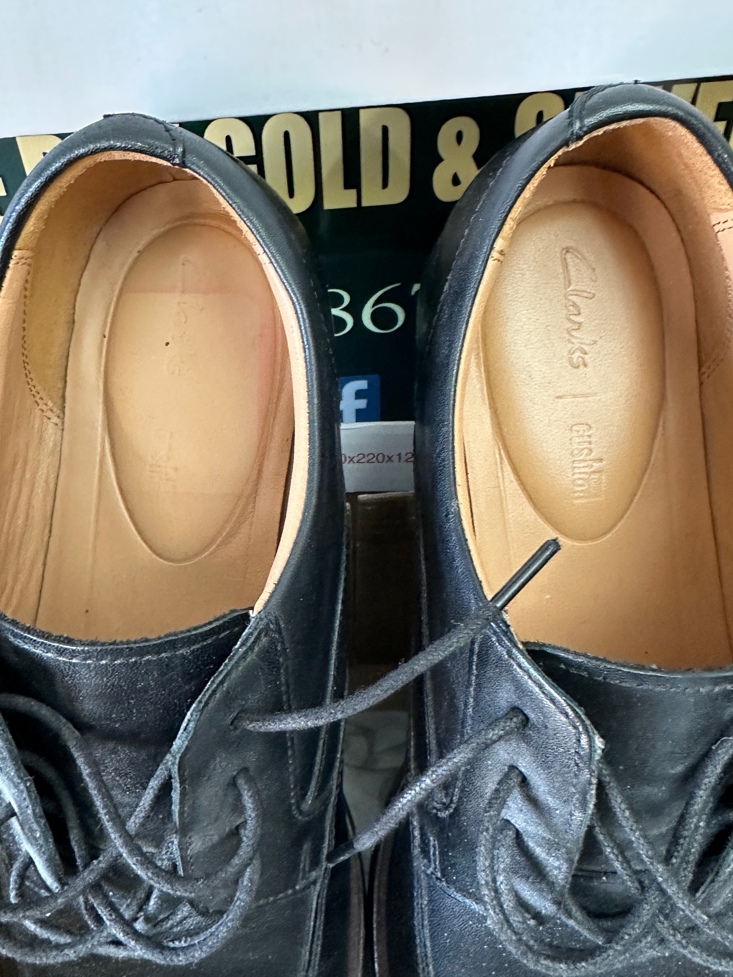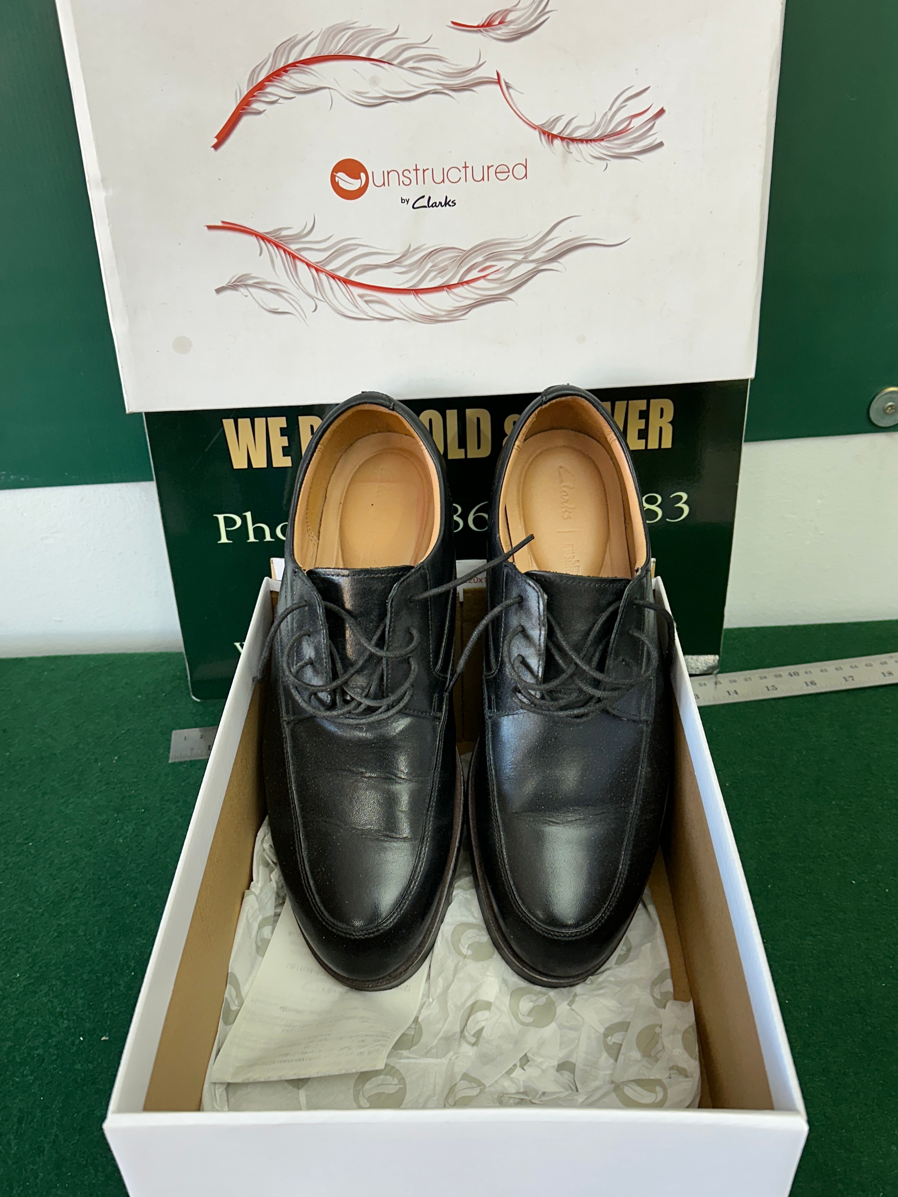 A pair of Clarks ‘Un Abode Ease’ men’s lace-up shoes from the ‘unstructured’ line. The shoes feature black leather uppers with matching black laces. They are fitted with padded tan leather insoles marked ‘Clarks Cushion’. The box label indicates a UK size 8 (EUR 42) with an ‘H’ fit, and notes ‘Dark Tan Lea’, referring to an internal component or specific material detail. The shoes are presented in their original branded box.