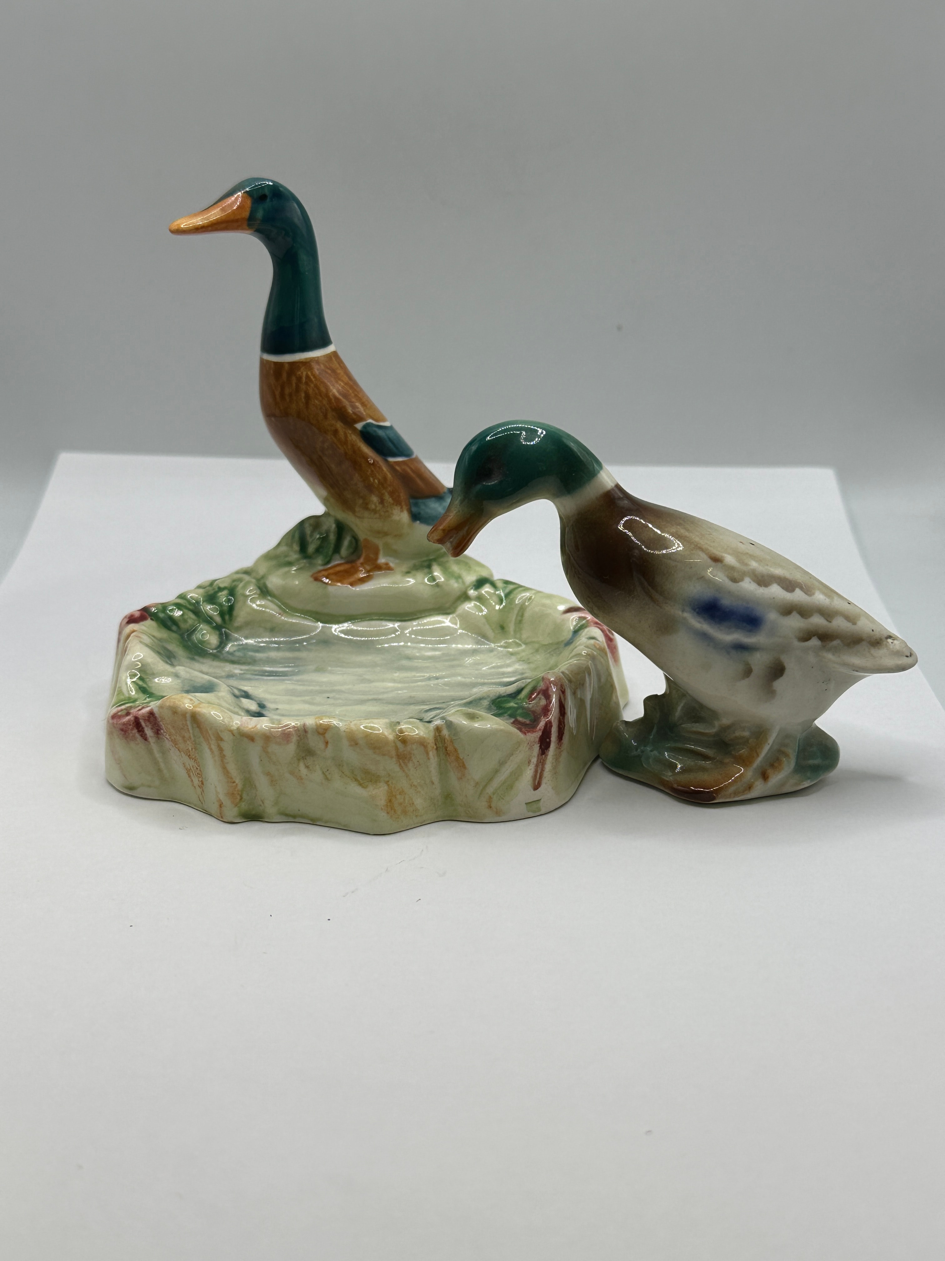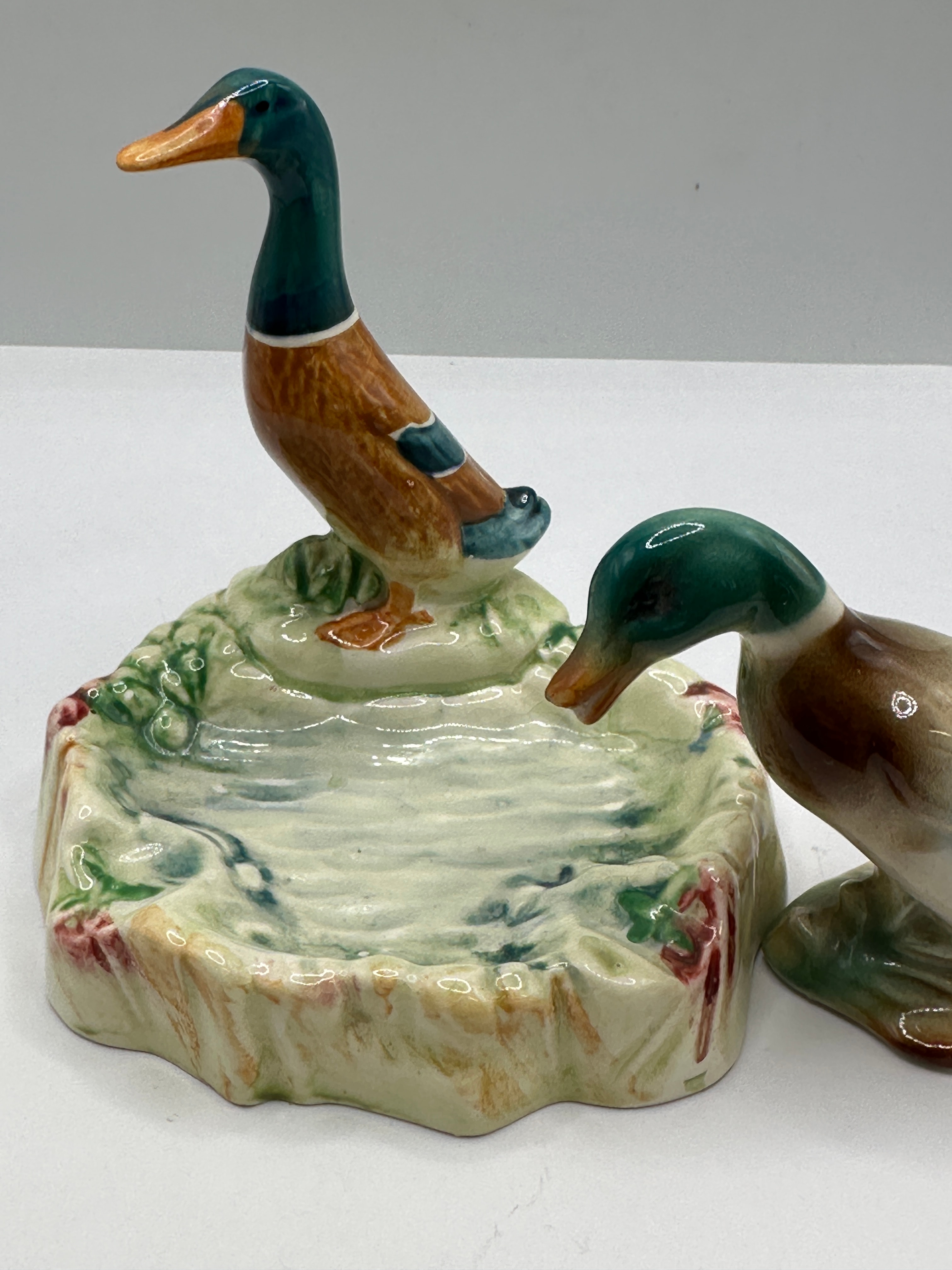 A Beswick Ware porcelain two-piece decorative ceramic set, featuring a mallard duck ashtray and a separate mallard duck figurine. The ashtray comprises a duck with a green head, brown chest, and grey body with blue wing accents, integrated with a multi-colored base sculpted to resemble rocks and foliage, forming a shallow, irregular basin with a light blue interior simulating water. The separate, freestanding duck figurine is similarly detailed with a green head and brown and grey plumage, positioned as if drinking from the basin. Crafted from glazed ceramic or porcelain.