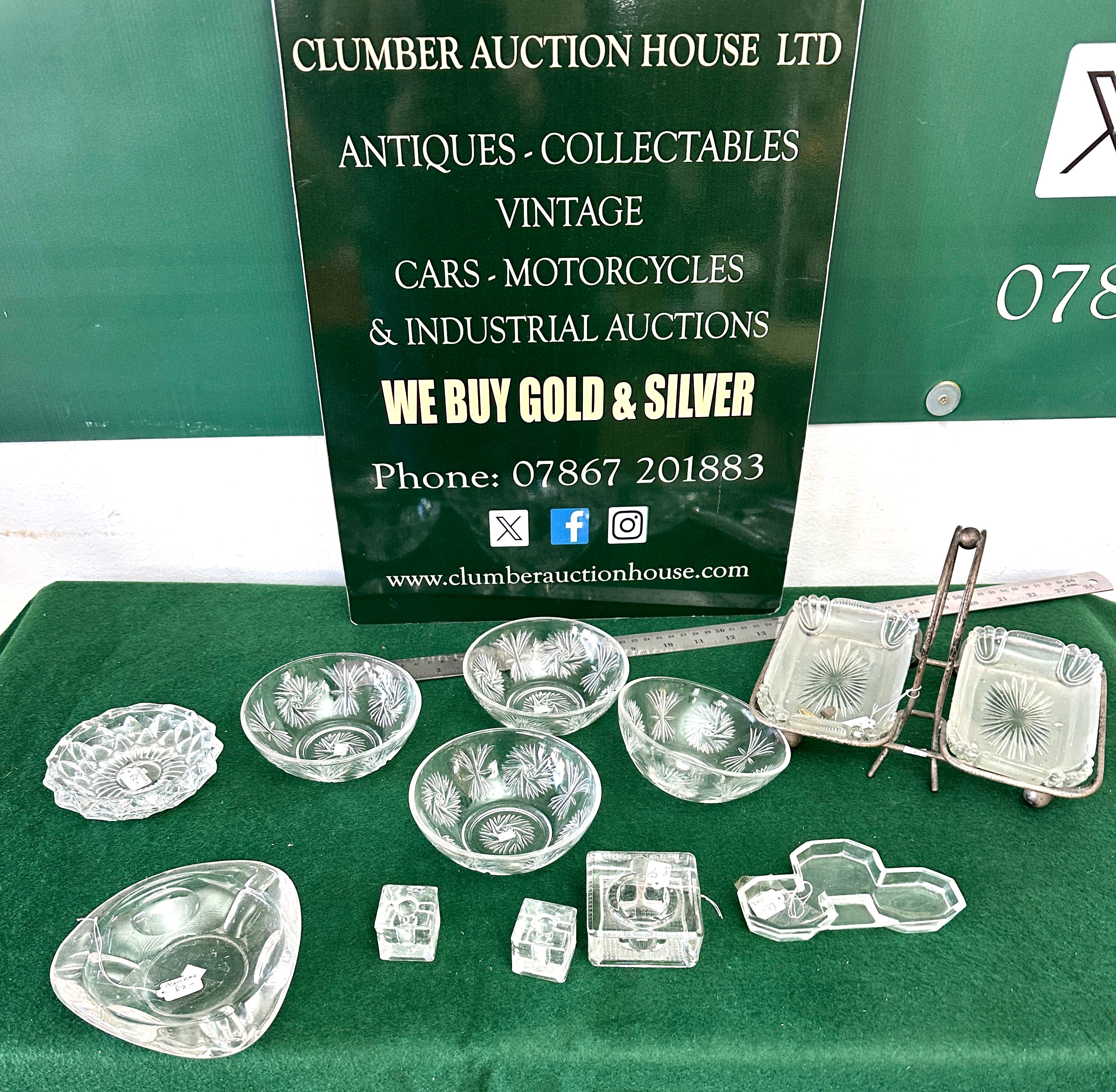 A collection of approximately fourteen pieces of clear, decorative glass or crystalware, primarily featuring cut or pressed starburst and floral patterns. The group includes multiple small bowls of varying designs, two rectangular dishes housed in simple metal stands, two small square cube-like forms, a stoppered or lidded square container, an elongated octagonal tray, and other small dishes. Visible markings include a partial price sticker ‘£2-‘ on a circular bowl and ‘9.- 2.4.’ on a square container.