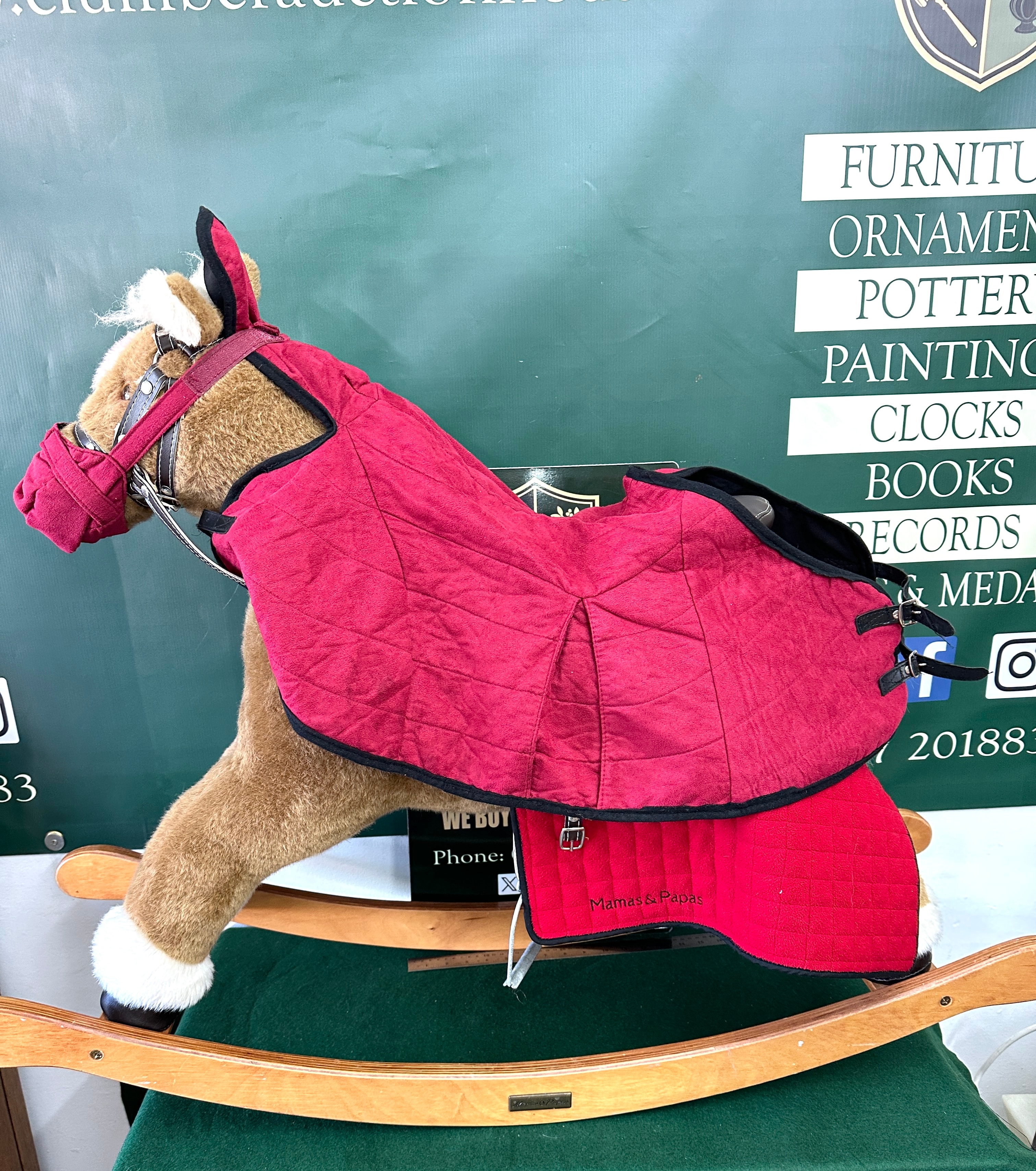 A Mamas & Papas rocking horse featuring a plush light brown body with a white mane, tail, and hooves. It is equipped with a dark brown synthetic leather saddle, bridle, and stirrups, and mounted on a light-toned wooden rocker base. The “Mamas & Papas” brand name is visible on a metal plaque affixed to the rocker base, and also embroidered on an optional red quilted saddle pad and matching horse blanket.
