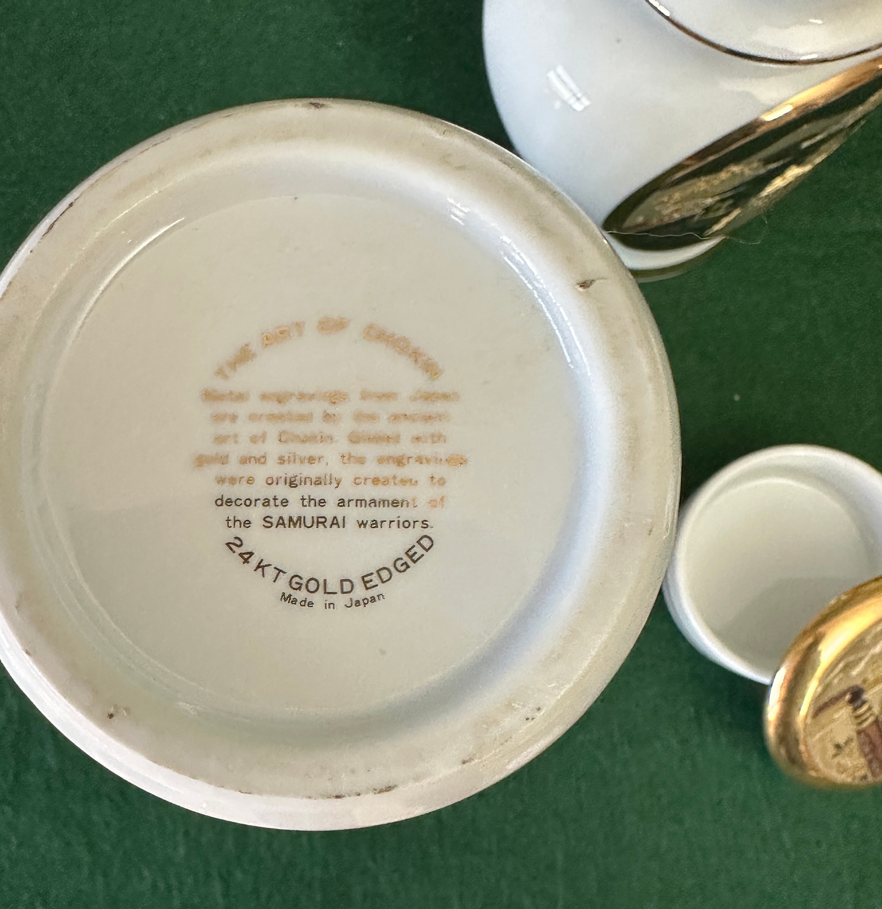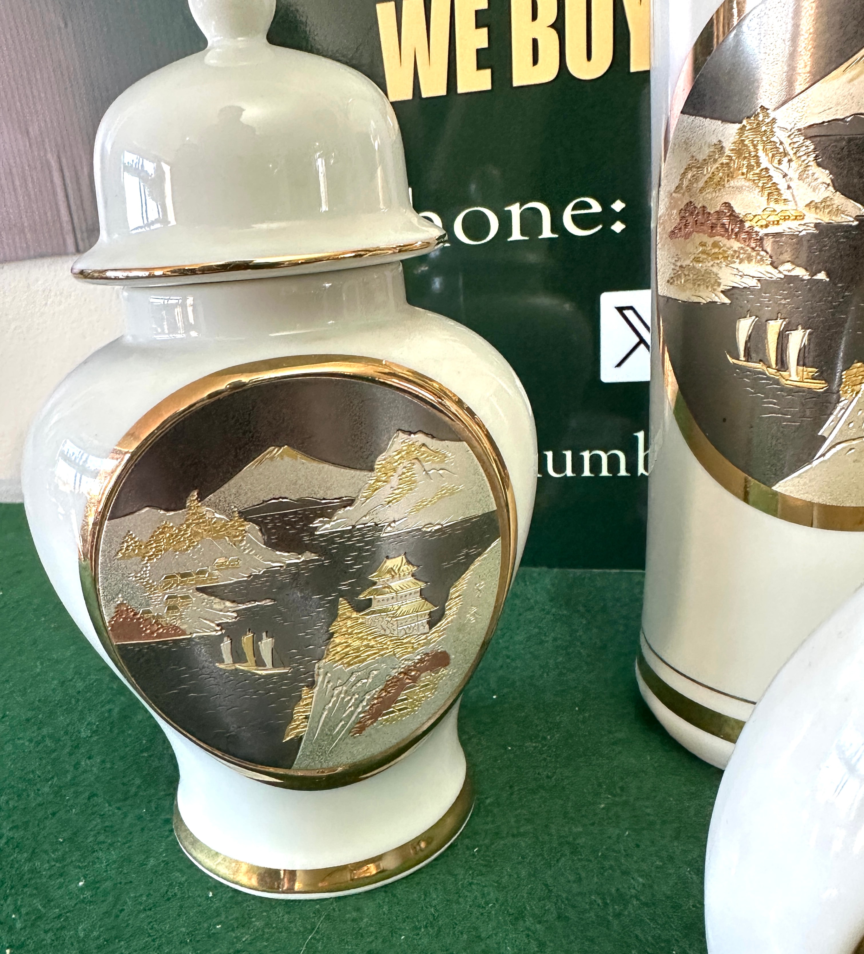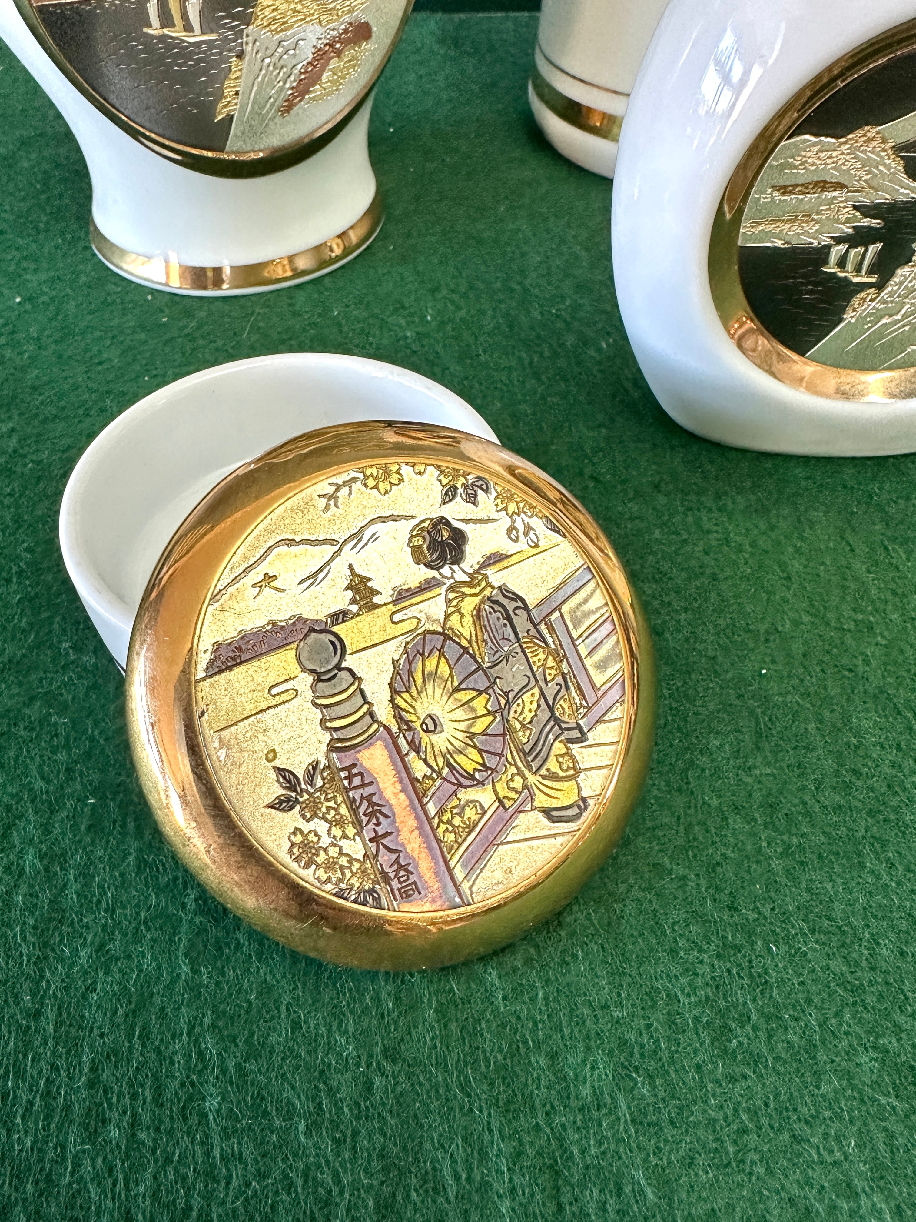 A group of five Japanese decorative items, crafted in the distinctive ‘The Art of Chokin’ style. Each piece is made from white porcelain or ceramic, featuring 24 KT gold edging and detailed metal engravings, chased with gold and silver. The engravings depict traditional Japanese landscapes with pagodas, boats, and mountains. The group comprises a lidded urn, a tall cylindrical vase, a spherical vase, a small decorative plate on a stand, and a lidded trinket box. The lid of the trinket box displays an image of a figure alongside the Japanese text ‘天下泰平’ (Tenka Taihei), which translates to ‘peace and tranquility throughout the land’ or ‘peace under heaven’. The base of one item is inscribed with ‘THE ART OF CHOKIN’, detailing that ‘Metal engravings from Japan are created by the ancient art of Chokin. Chased with gold and silver, the engravings were originally created to decorate the armament of the SAMURAI warriors. 24 KT GOLD EDGED Made in Japan’.