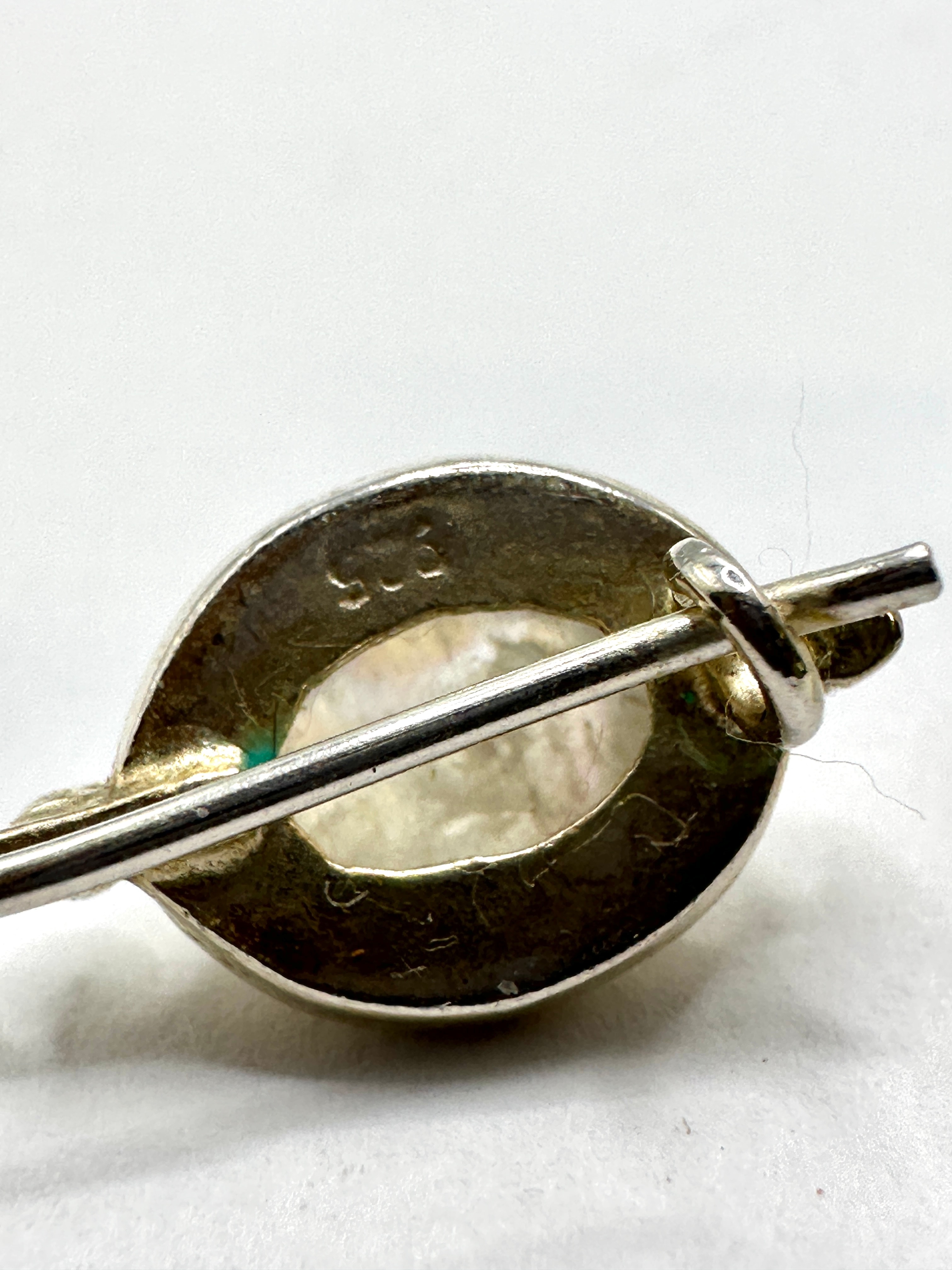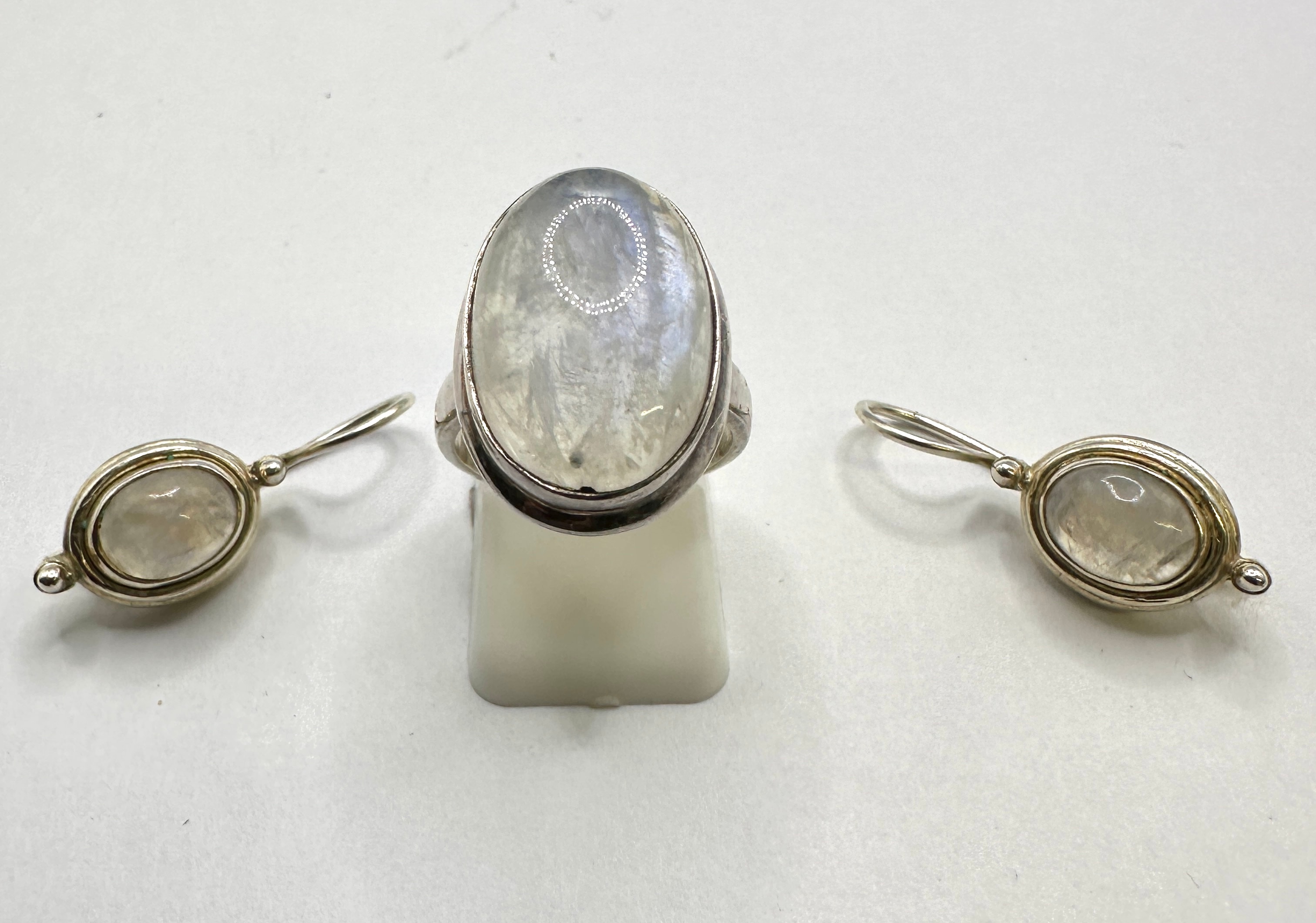 This lot presents a matching three-piece jewelry set, crafted from sterling silver, comprising one ring and a pair of drop earrings. Each piece features an oval cabochon-cut gemstone, exhibiting a characteristic adularescence, consistent with rainbow moonstone. The metal is confirmed as sterling silver by a visible ‘925’ hallmark on the reverse of one earring. The moonstone in the ring is notably larger than those in the earrings, all set in a classic and minimalist design.