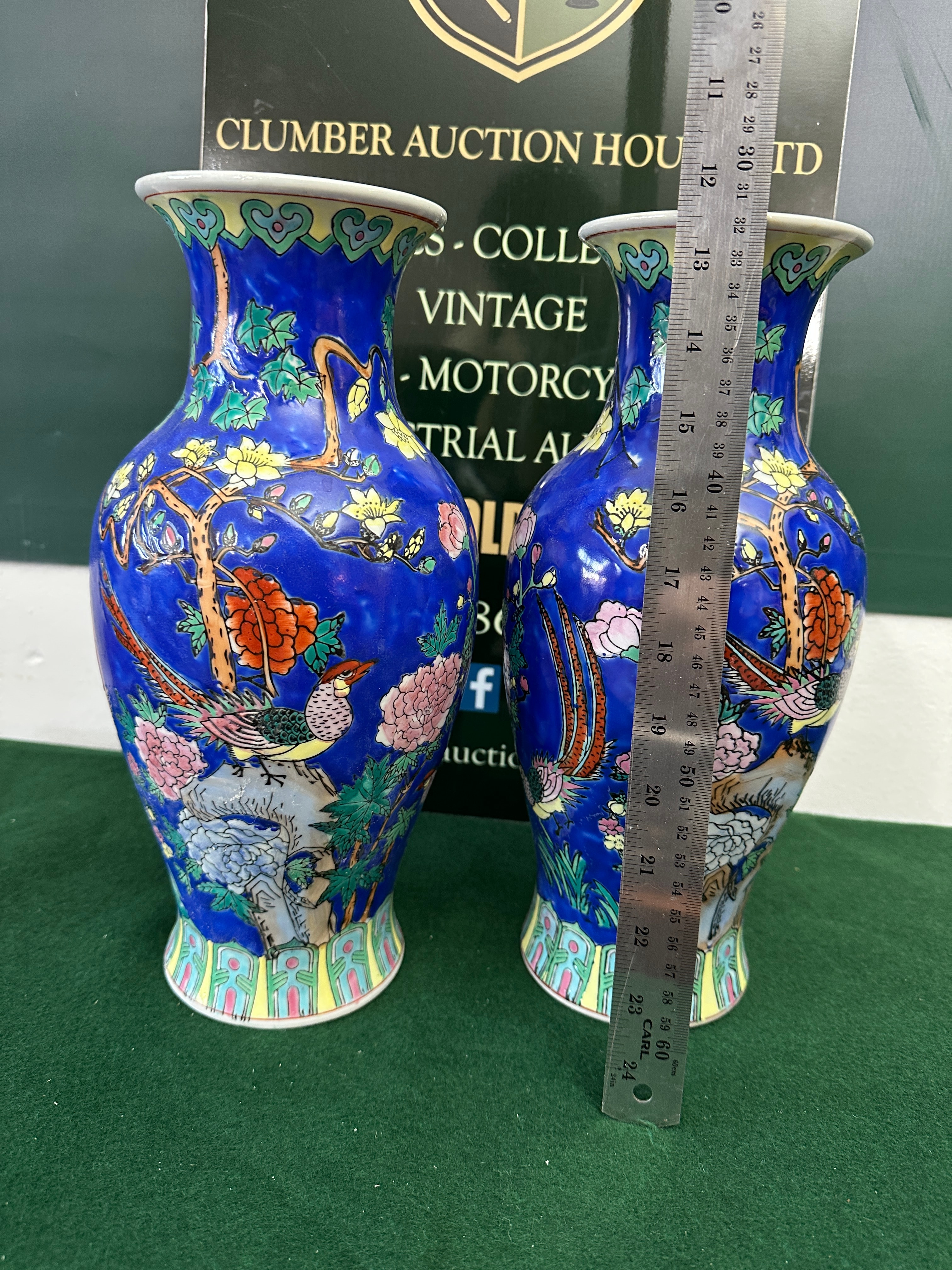 A pair of Chinese polychrome enamel decorated porcelain vases, early 20th Century. Each vase exhibits a traditional Chinese-inspired form with flared rims, broad shoulders tapering to a constricted neck, and a globular body widening to a slightly flared foot. The vibrant cobalt blue ground is richly decorated with polychrome enamel, depicting an intricate scene of various birds, notably pheasants, perched amidst blossoming trees and large peony flowers. The color palette includes prominent reds, pinks, yellows, greens, and light blues. The interior rim is white, contrasting with the exterior decoration. Decorative bands of stylized leaves and geometric patterns encircle the neck and foot. No manufacturer’s marks or period indicators are discernible.
