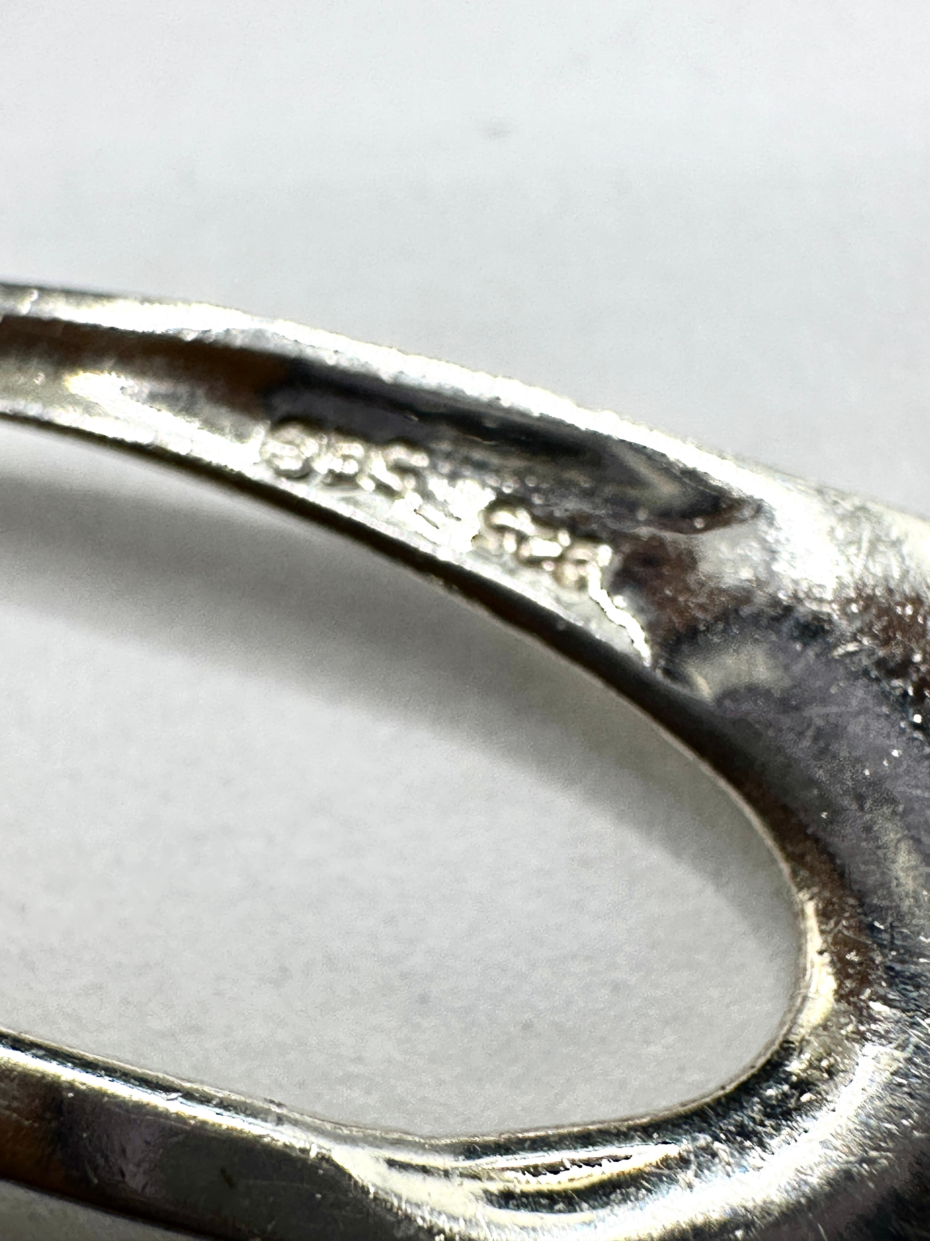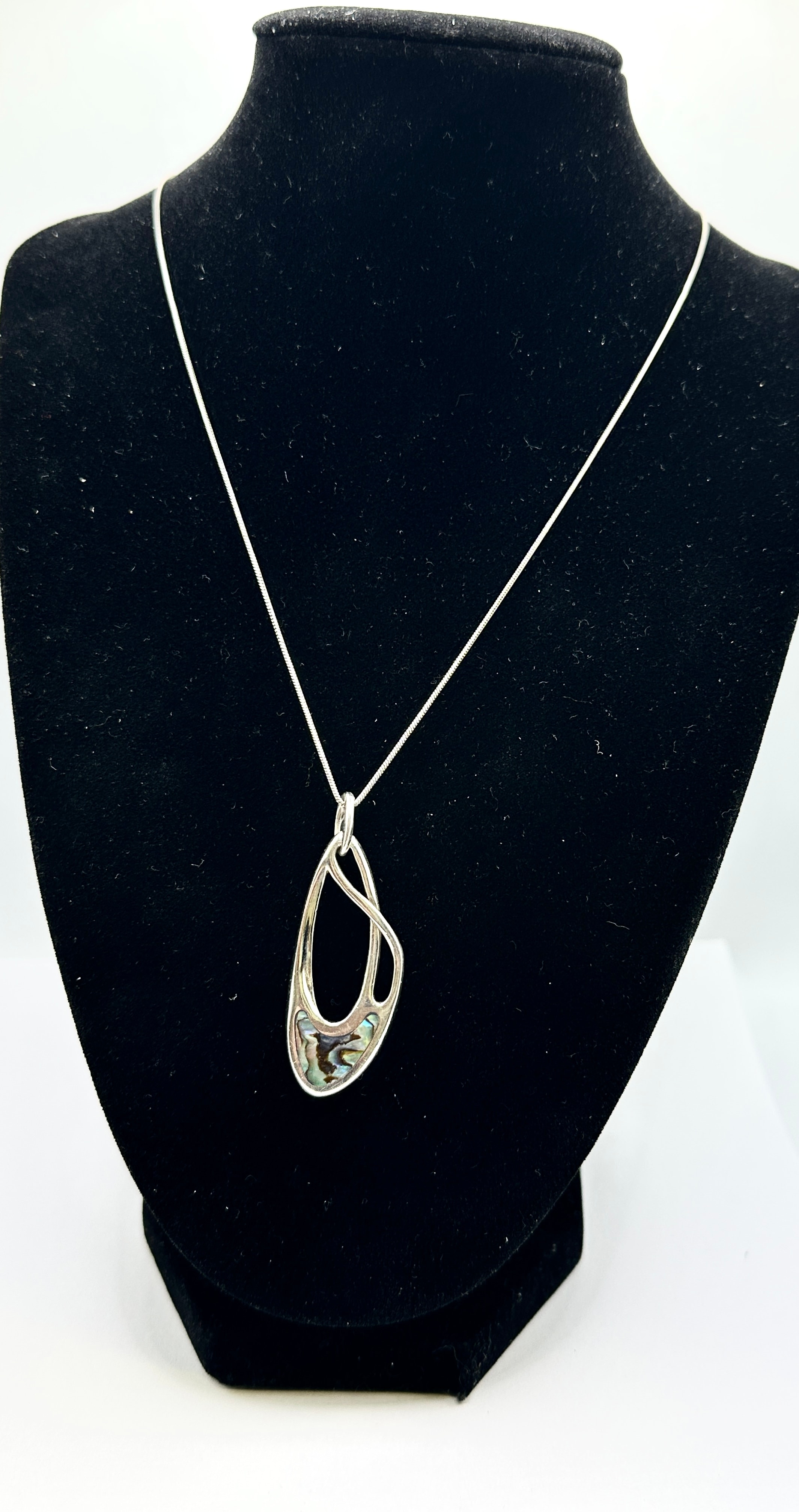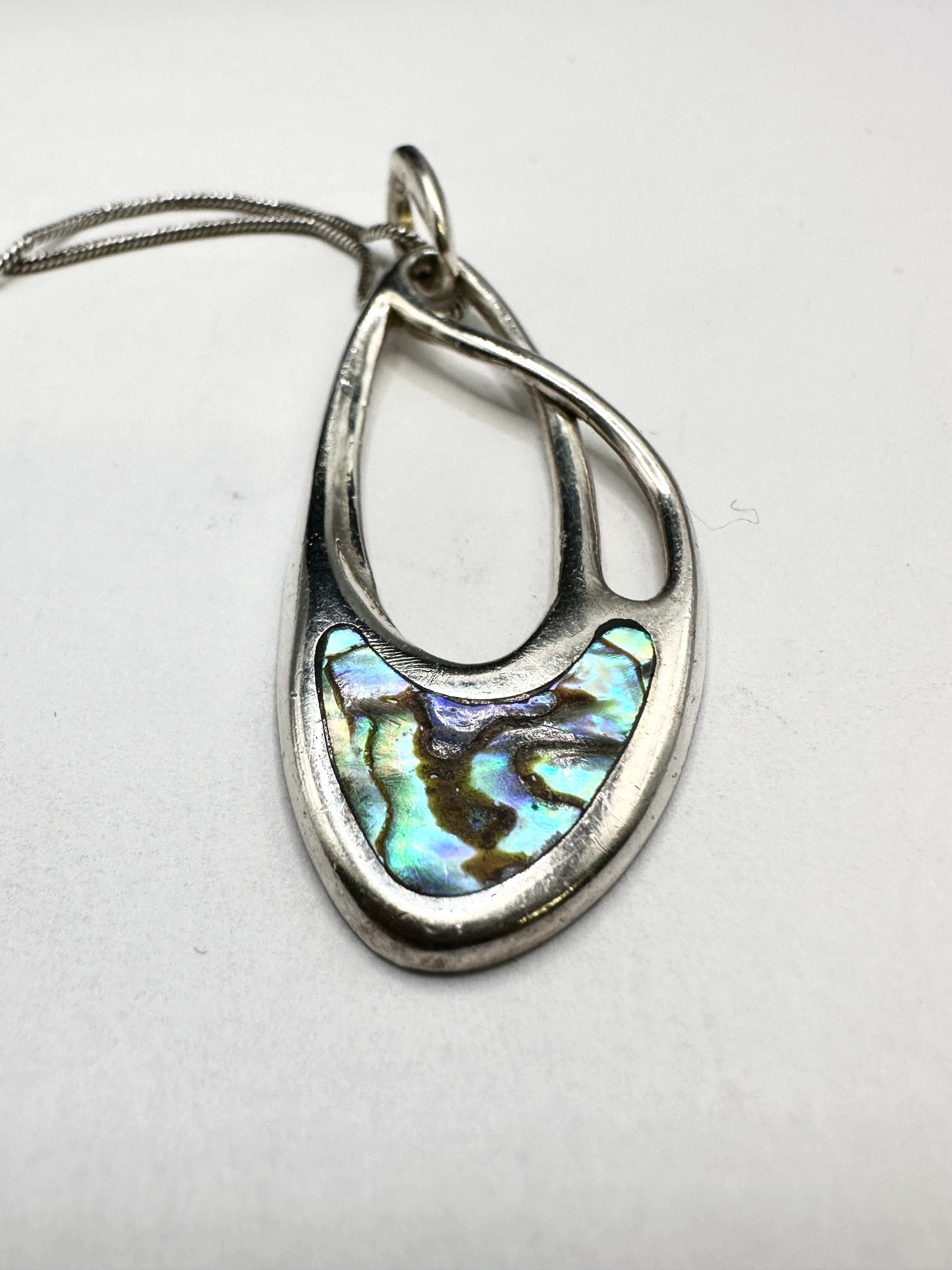 A contemporary necklace featuring a polished sterling silver pendant with an abstract, fluid, open-work design. The pendant incorporates an iridescent abalone shell inlay, displaying vibrant blues, greens, and browns. A clear “925” stamp is visible on the reverse of the pendant, alongside a partially visible “CPS” mark. The pendant hangs from a slender silver-toned chain.