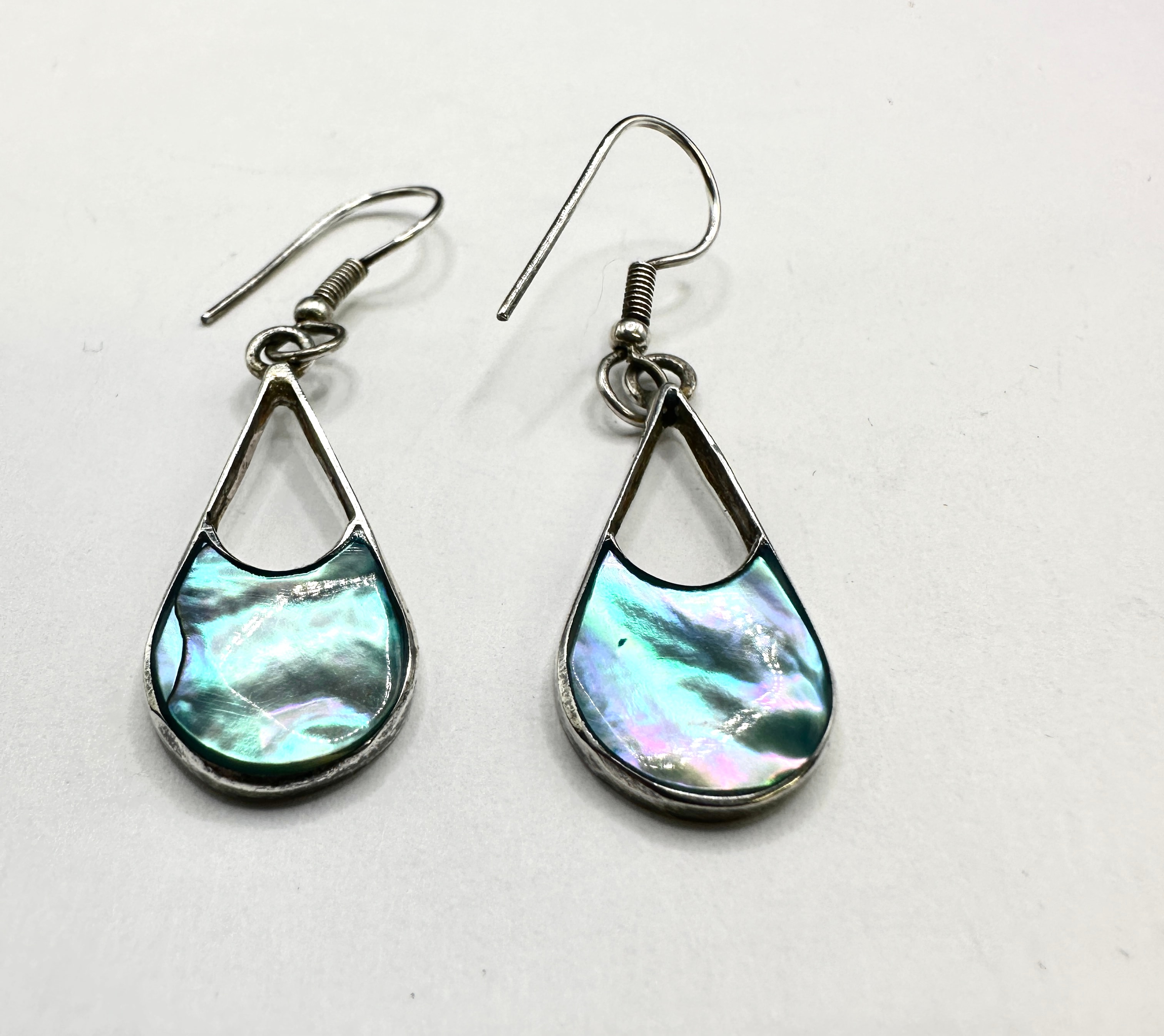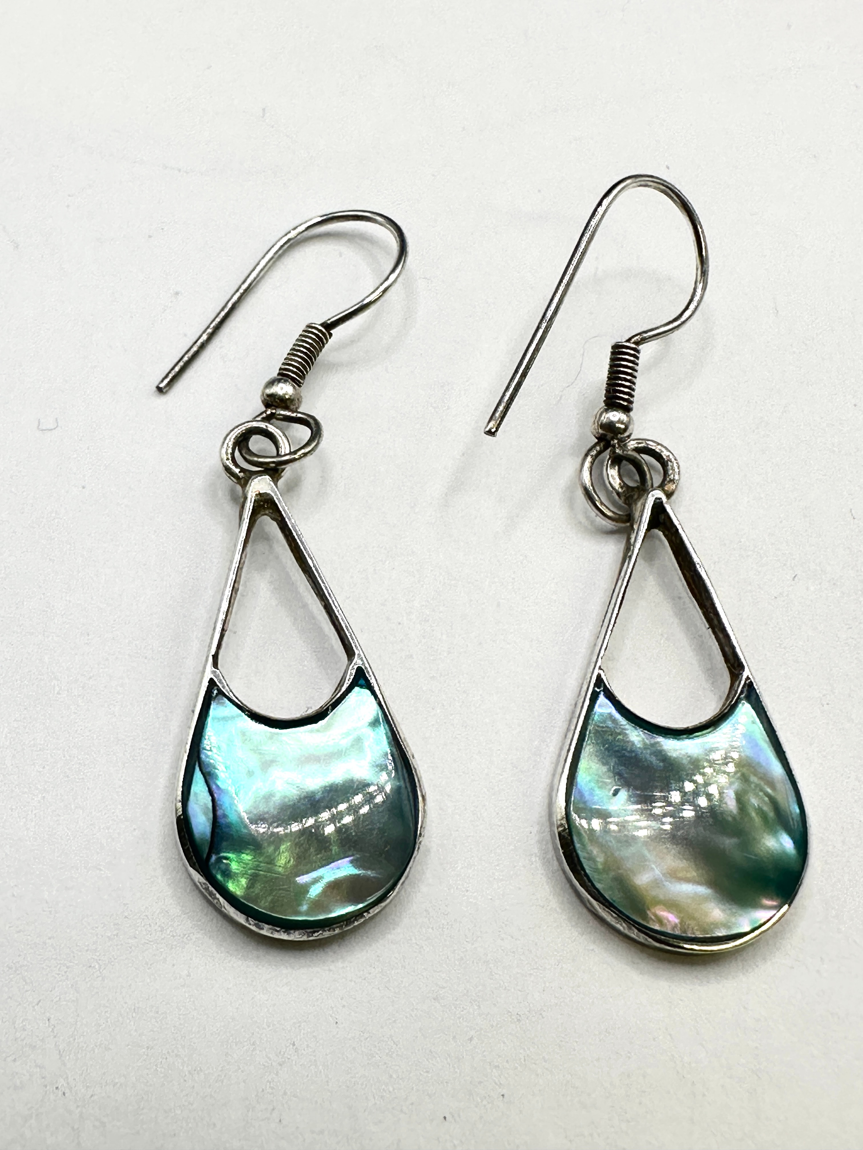 A pair of earrings, consistent with market examples identified as ‘Inlaid Abalone Teardrop Earrings’ and similar to the ‘XEGD-ABL’ series of products. Each earring features a silver-colored metal ear hook and a teardrop-shaped dangle frame. The dangles are inlaid with abalone, displaying vibrant hues of blue, green, and purple. No manufacturer’s marks or textual inscriptions are visible.