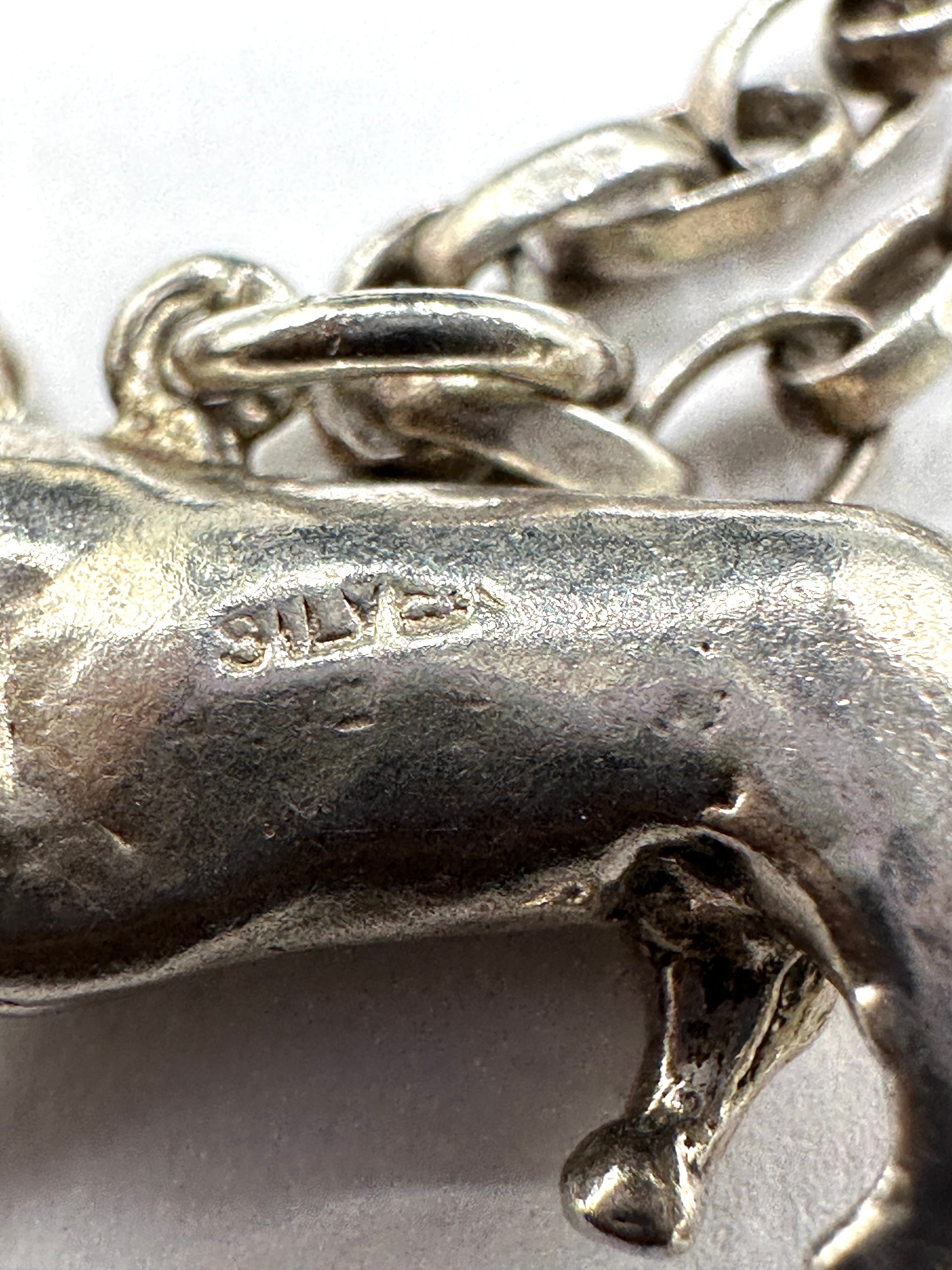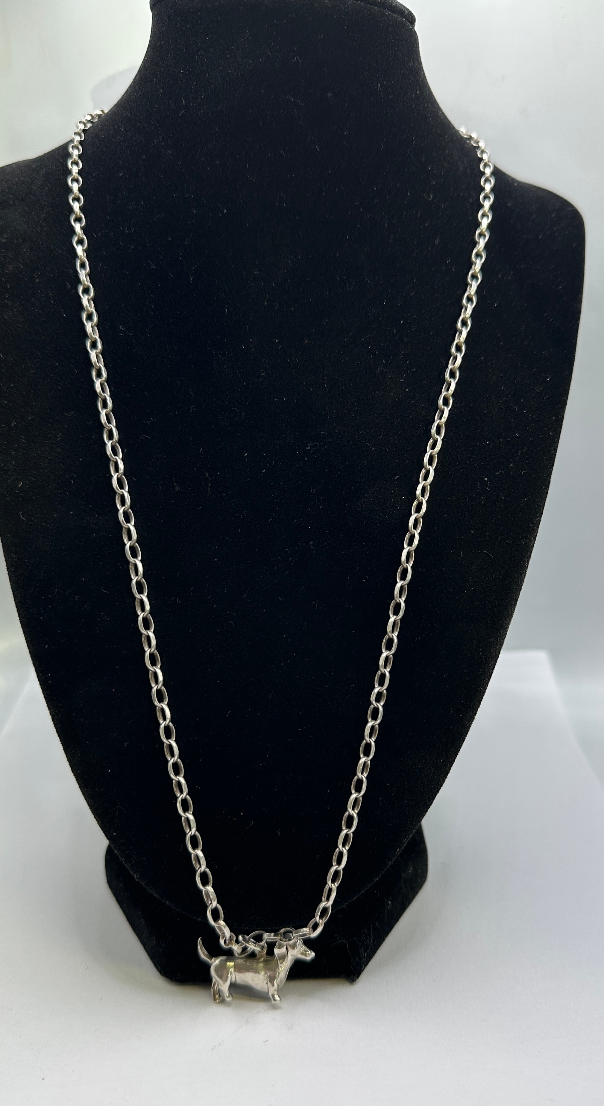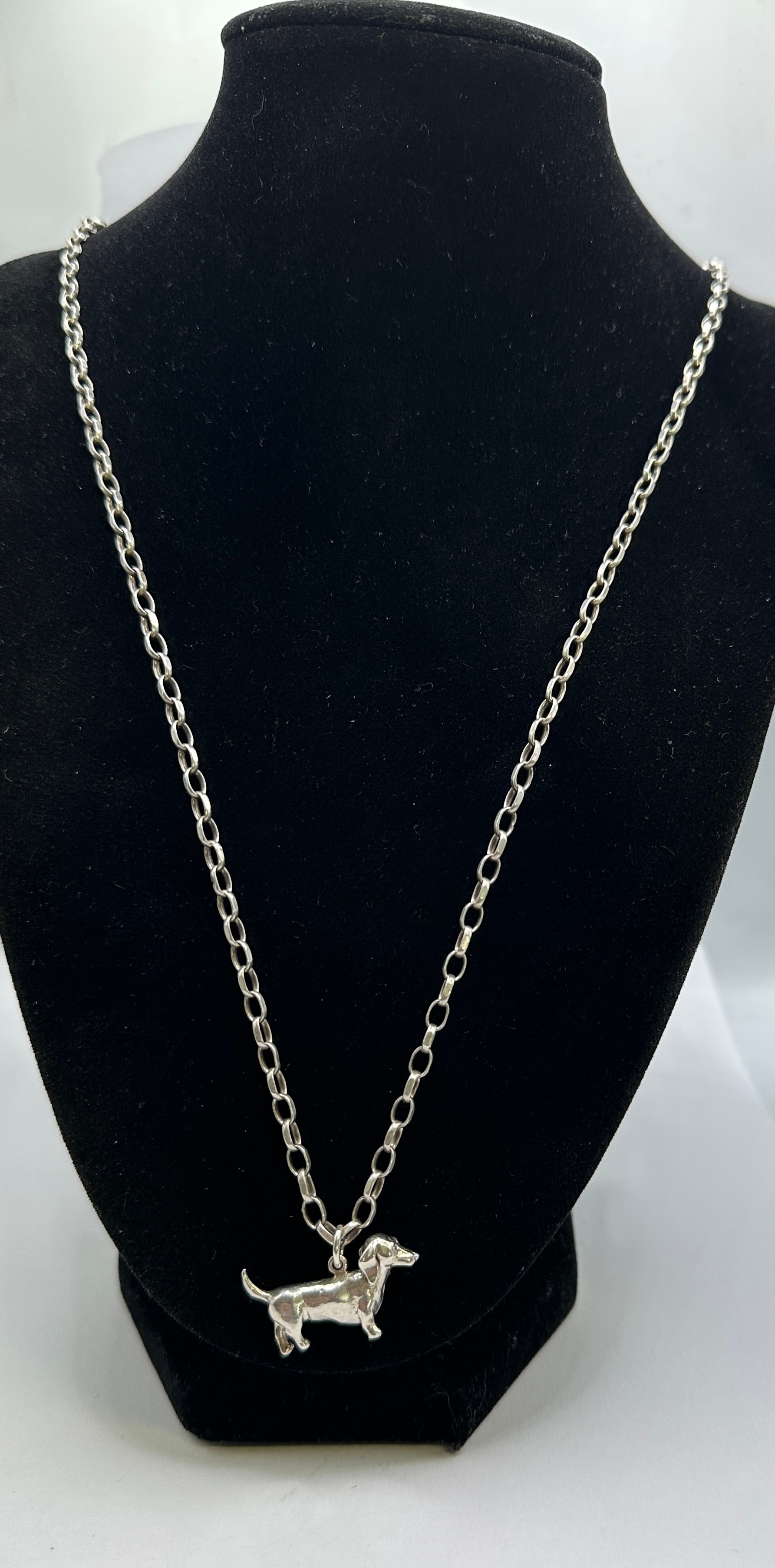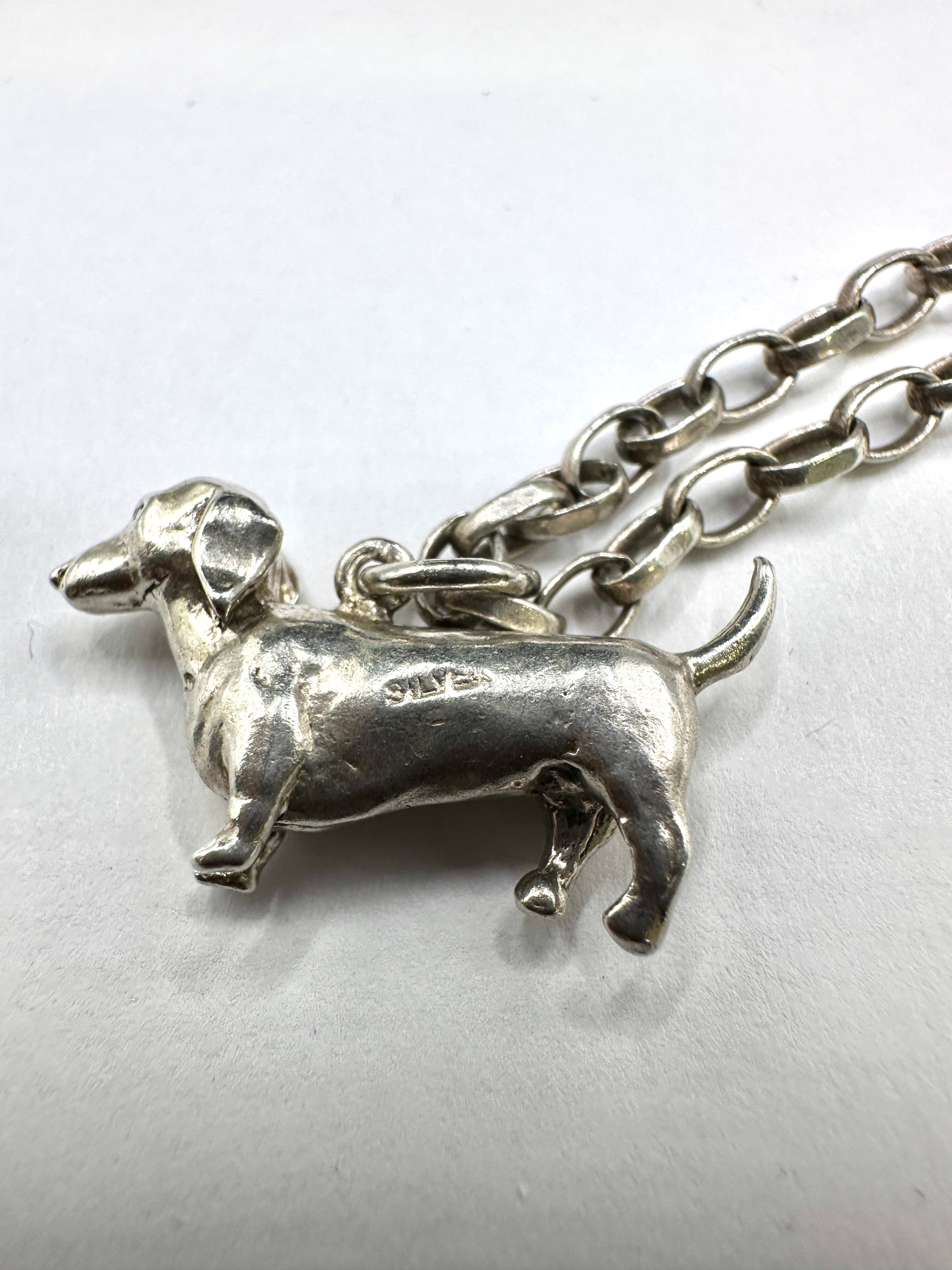 A modern silver necklace featuring an elongated oval-link chain. The necklace is adorned with a figural pendant depicting a standing dachshund dog. The pendant is clearly stamped ‘SILVER’ on its side, confirming its material, which the chain also appears to share.