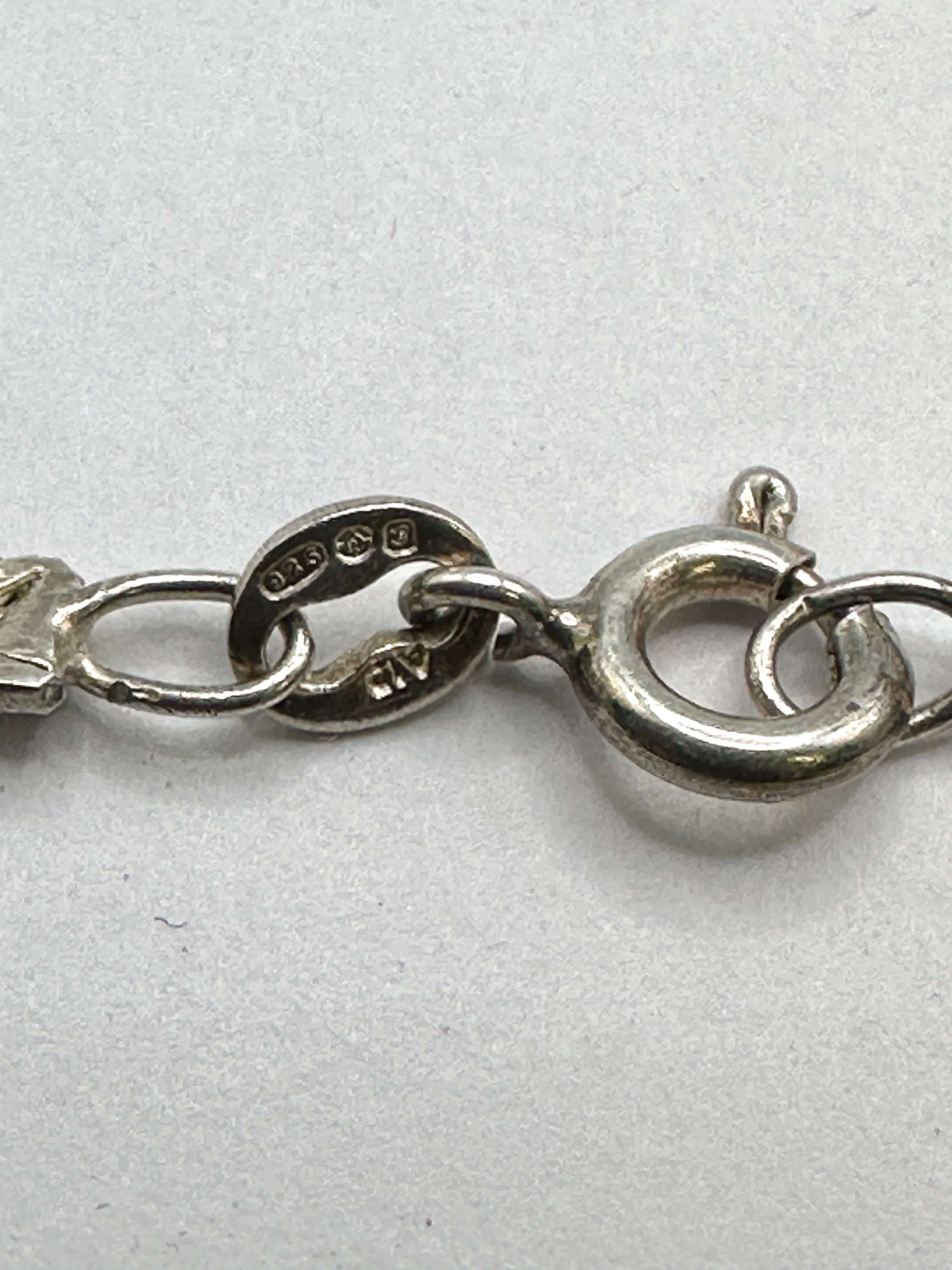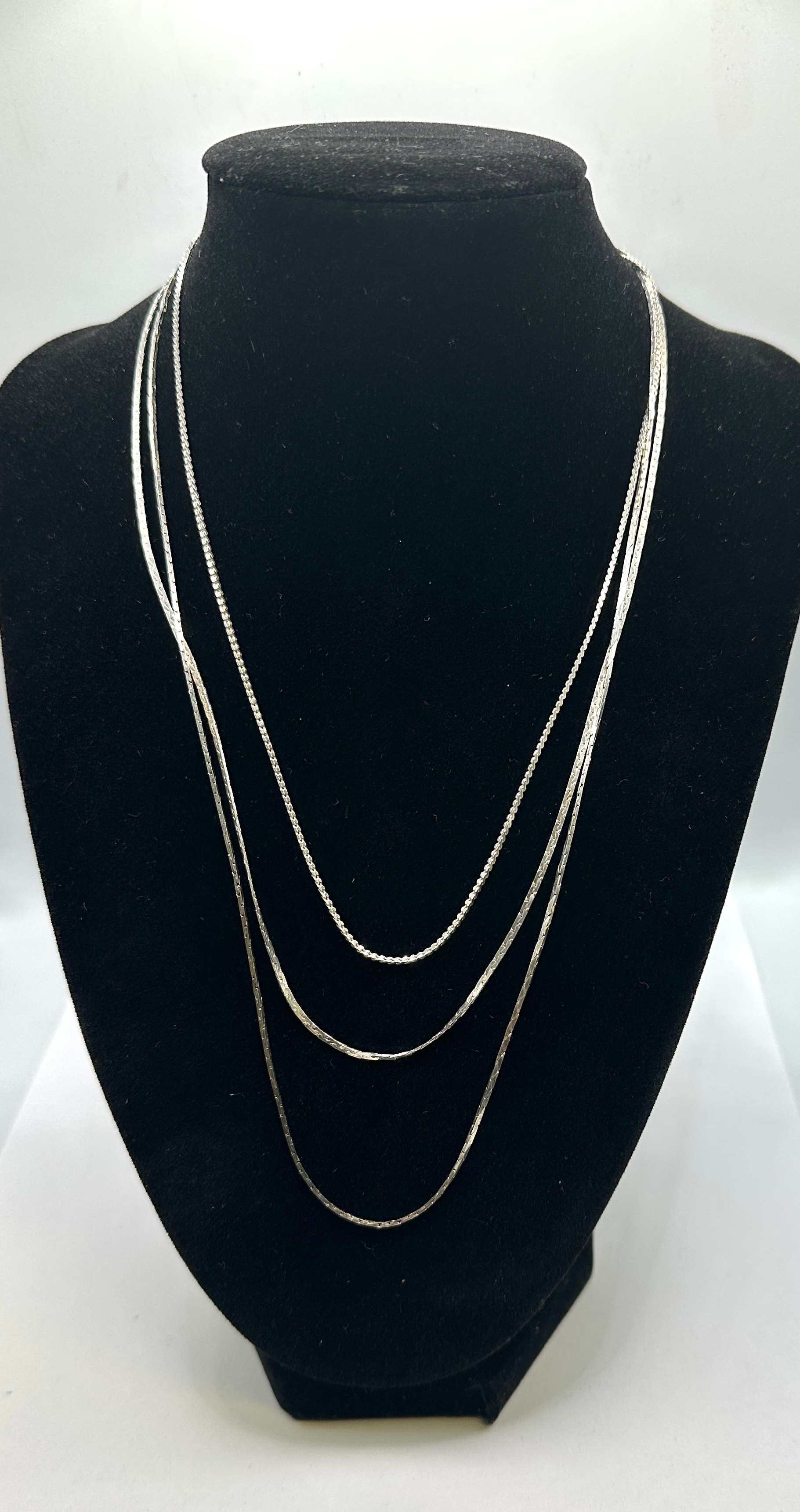An Italian sterling silver layered necklace comprising three distinct chains of varying link styles, including a flat snake chain and finer link designs. The necklace is marked ‘925’ and ‘ITALY’ on a connecting oval link near the spring ring clasp, confirming its sterling silver composition and country of origin.