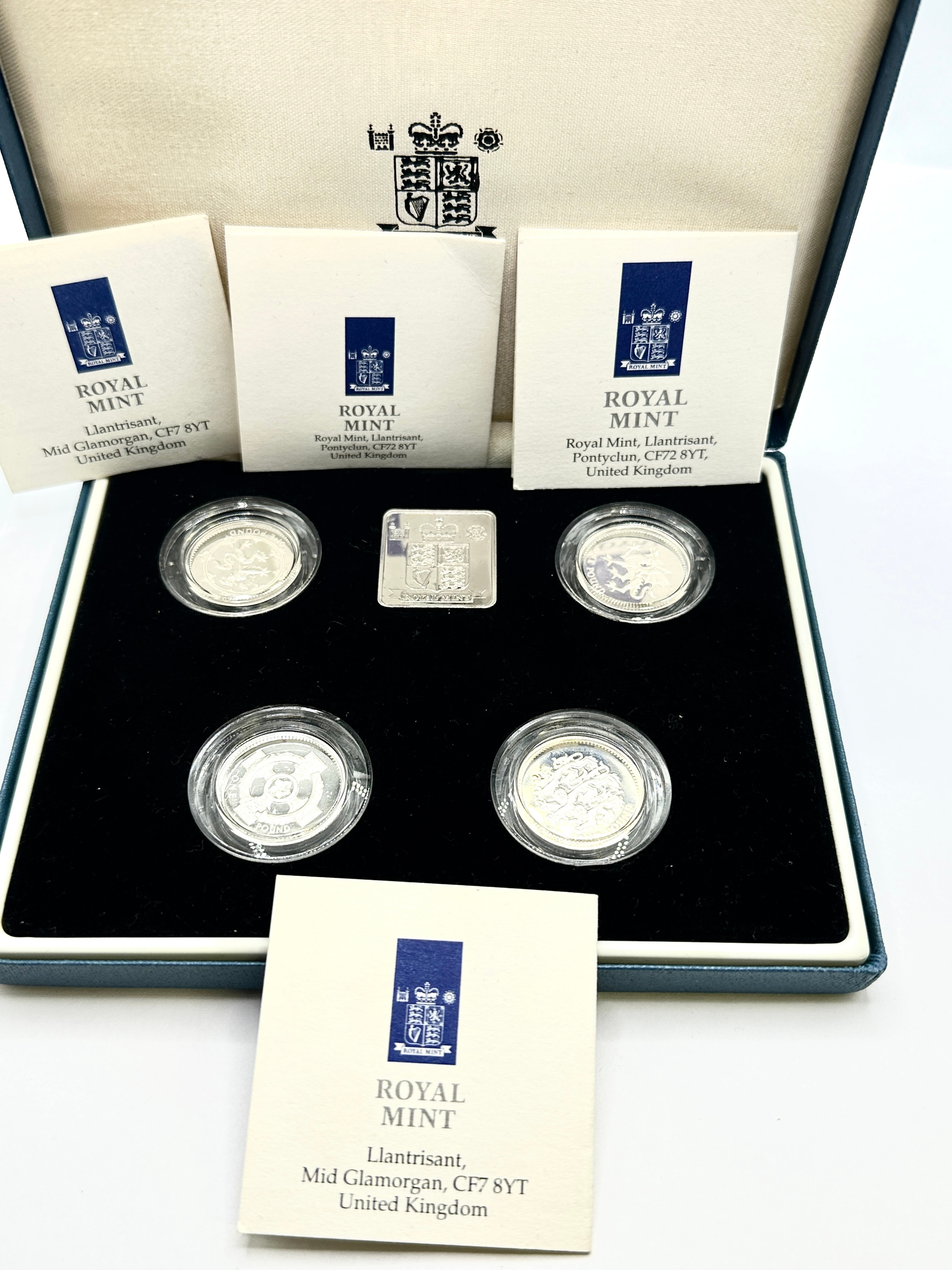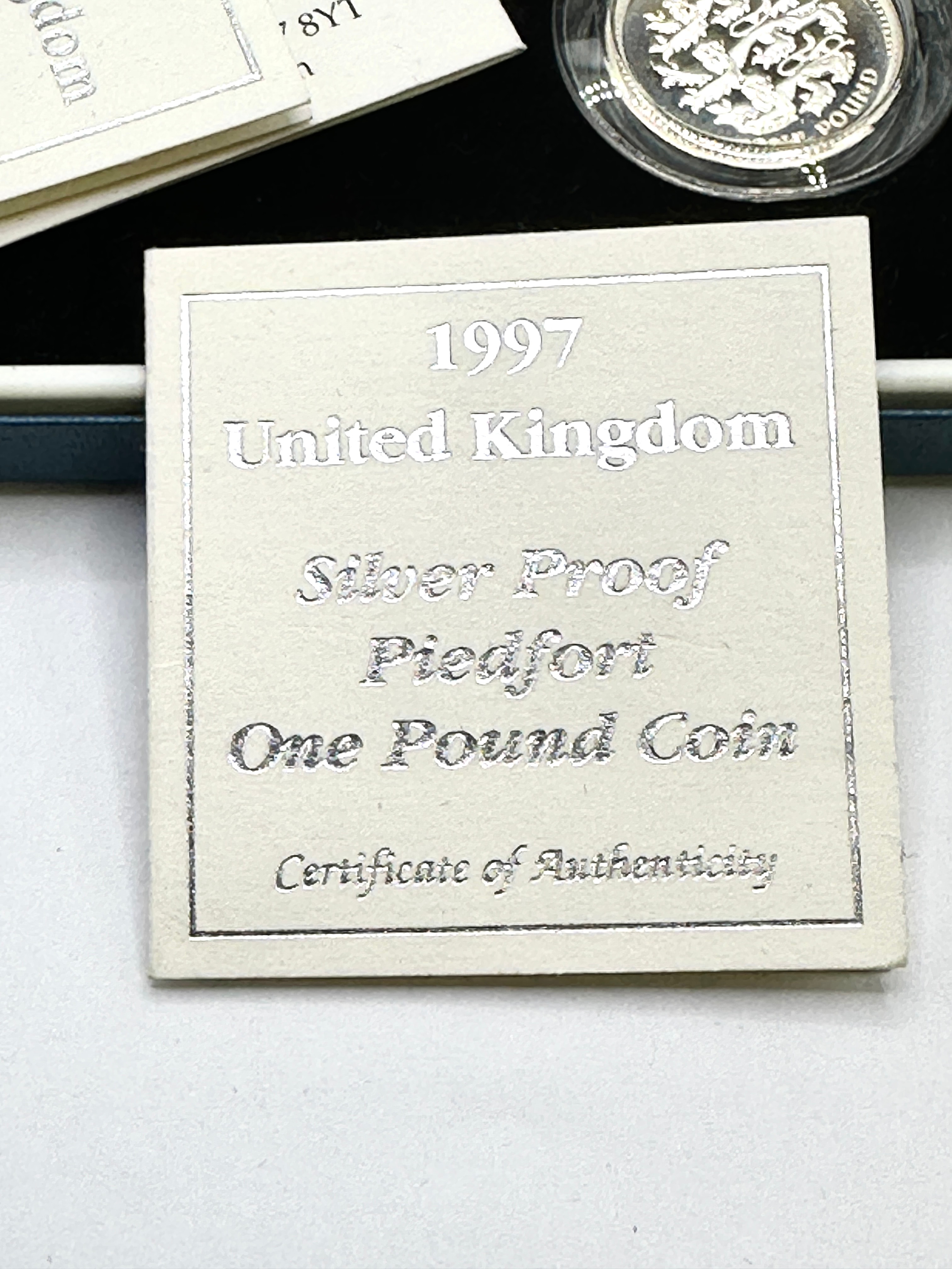 A Royal Mint 1997 United Kingdom Silver Proof Piedfort One Pound Coin Collection. The collection is presented in its original blue hinged case with a cream interior, featuring a Royal Coat of Arms on the lid. It comprises five silver-toned pieces: four circular coins housed in clear plastic capsules, and one central rectangular ingot-like piece, all precisely fitted into a black velvet-lined insert. Several accompanying white booklets and a certificate card are included, bearing the text “ROYAL MINT,” “Llantrisant, Mid Glamorgan, CF7 8YT, United Kingdom.” One prominent certificate explicitly identifies the items as “1997 United Kingdom Silver Proof Piedfort One Pound Coin,” indicating their material and period. Visible markings on the coins include “ONE POUND” and the year “1997,” along with royal effigies and heraldic designs.