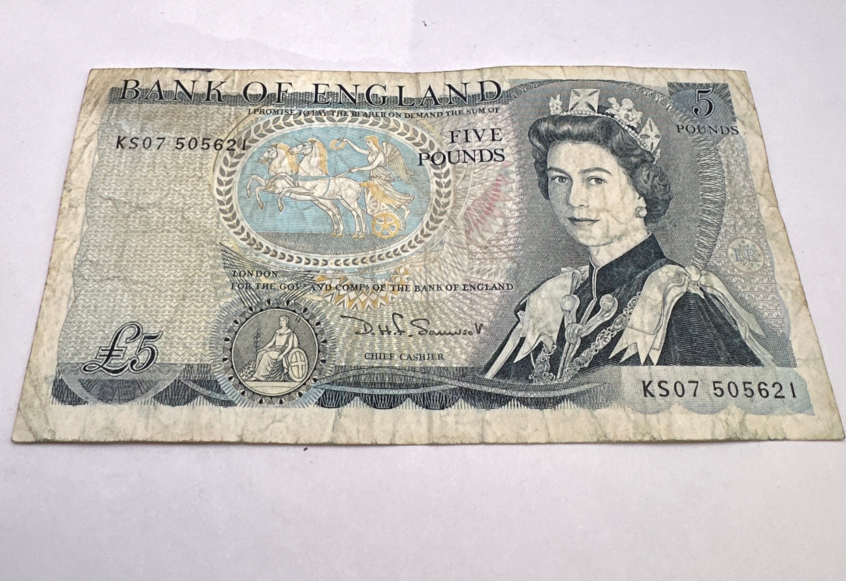A Bank of England Five Pounds (£5) paper banknote, Great Britain P-378, issued between 1980 and 1987. The obverse features a portrait of Queen Elizabeth II in regal attire, a circular vignette of two horses, the serial number KS07 505621 (repeated), and the promise “I PROMISE TO PAY THE BEARER ON DEMAND THE SUM OF FIVE POUNDS,” signed by D.H.F. Somerset, Chief Cashier. The reverse displays a portrait of The Duke of Wellington (1769-1852) alongside a detailed battle scene.