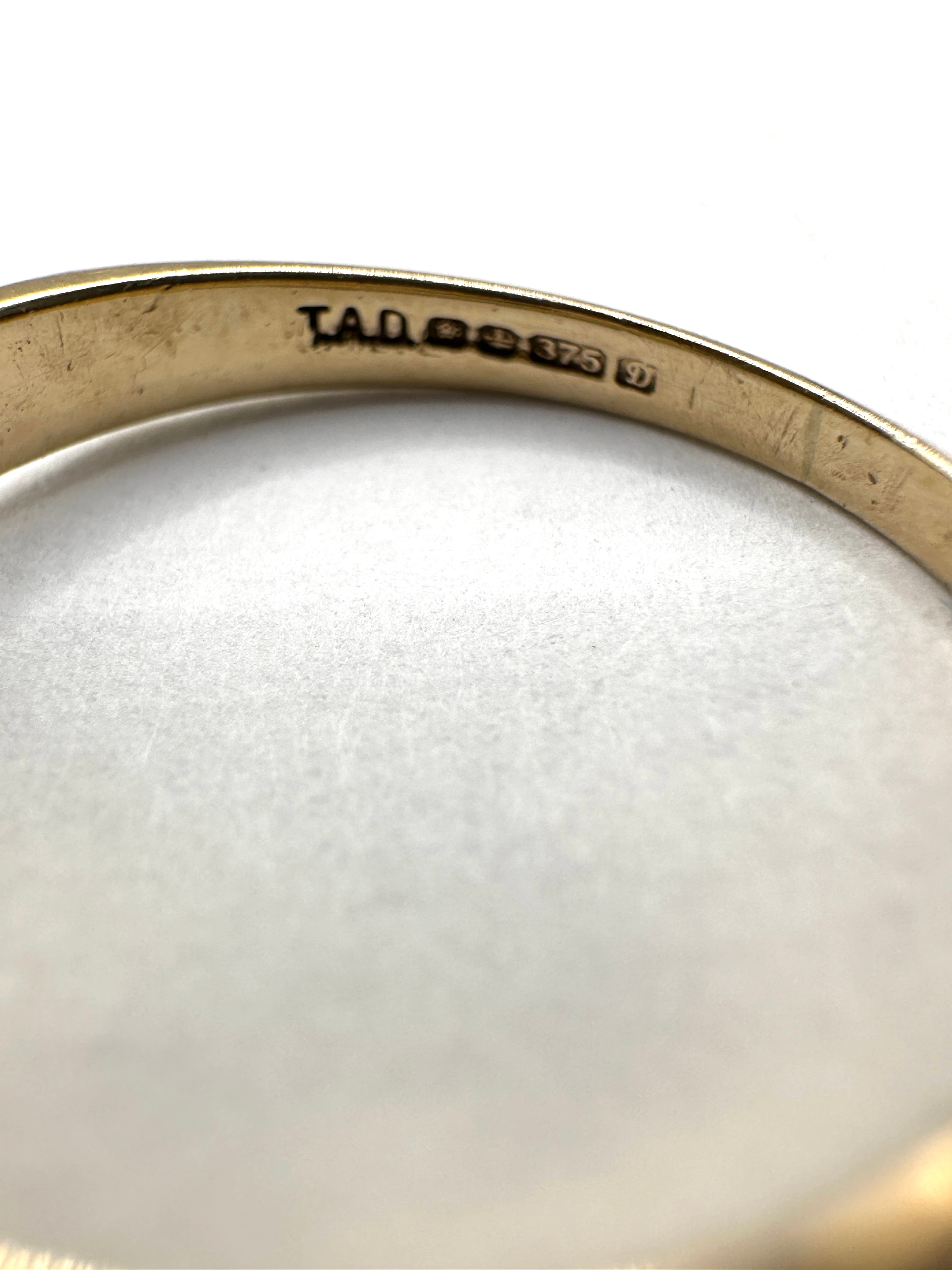A 9-karat yellow gold ring featuring a central clear or white gemstone secured in a white metal six-prong setting. The yellow gold band exhibits textured, possibly bark-like, shoulders. Interior hallmarks visible on the band include “TA & CS” (maker’s mark), an anchor symbol (indicating the Birmingham Assay Office), “375” denoting 9-karat gold purity, and a boxed letter “D,” suggesting a specific date letter.