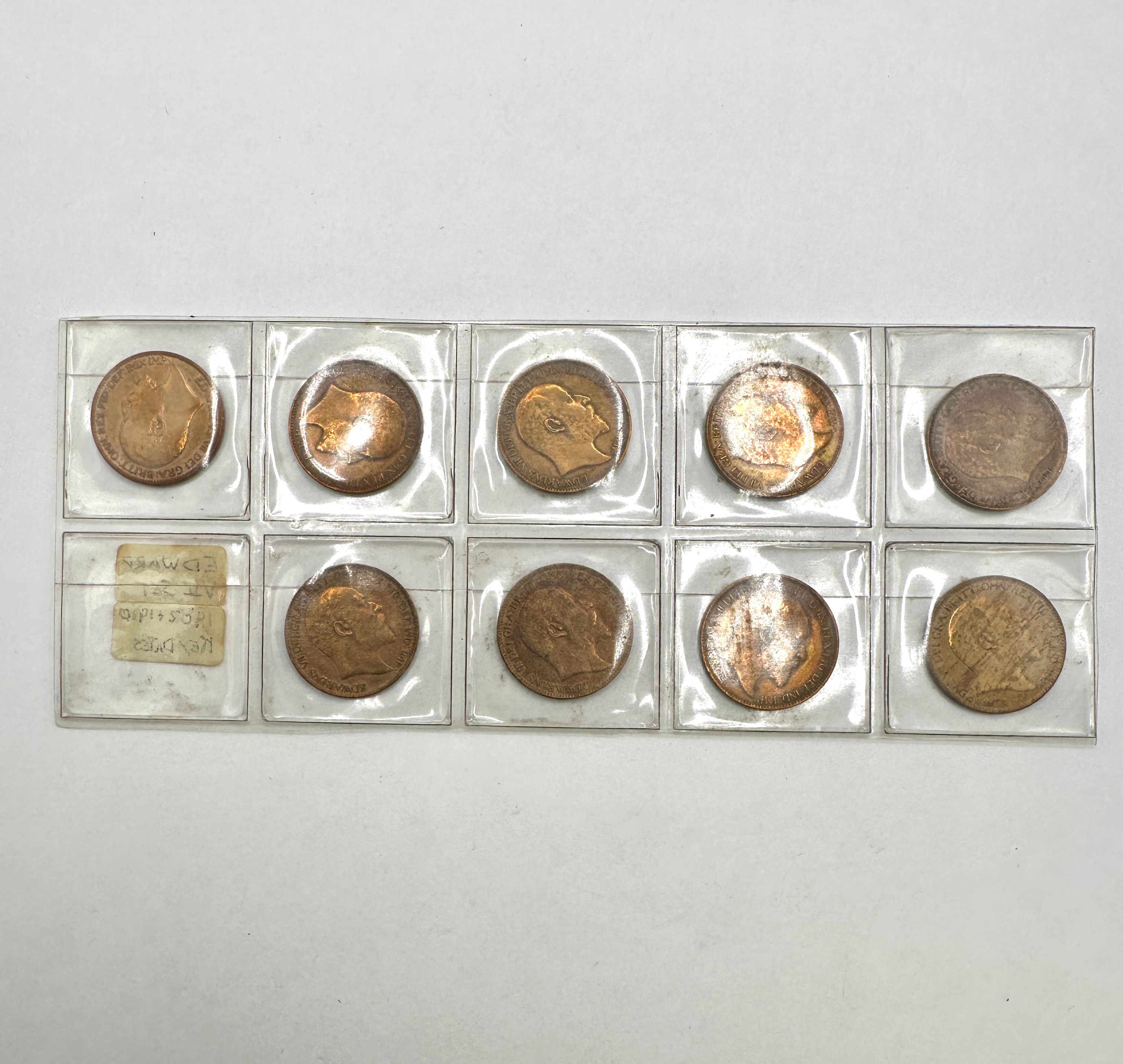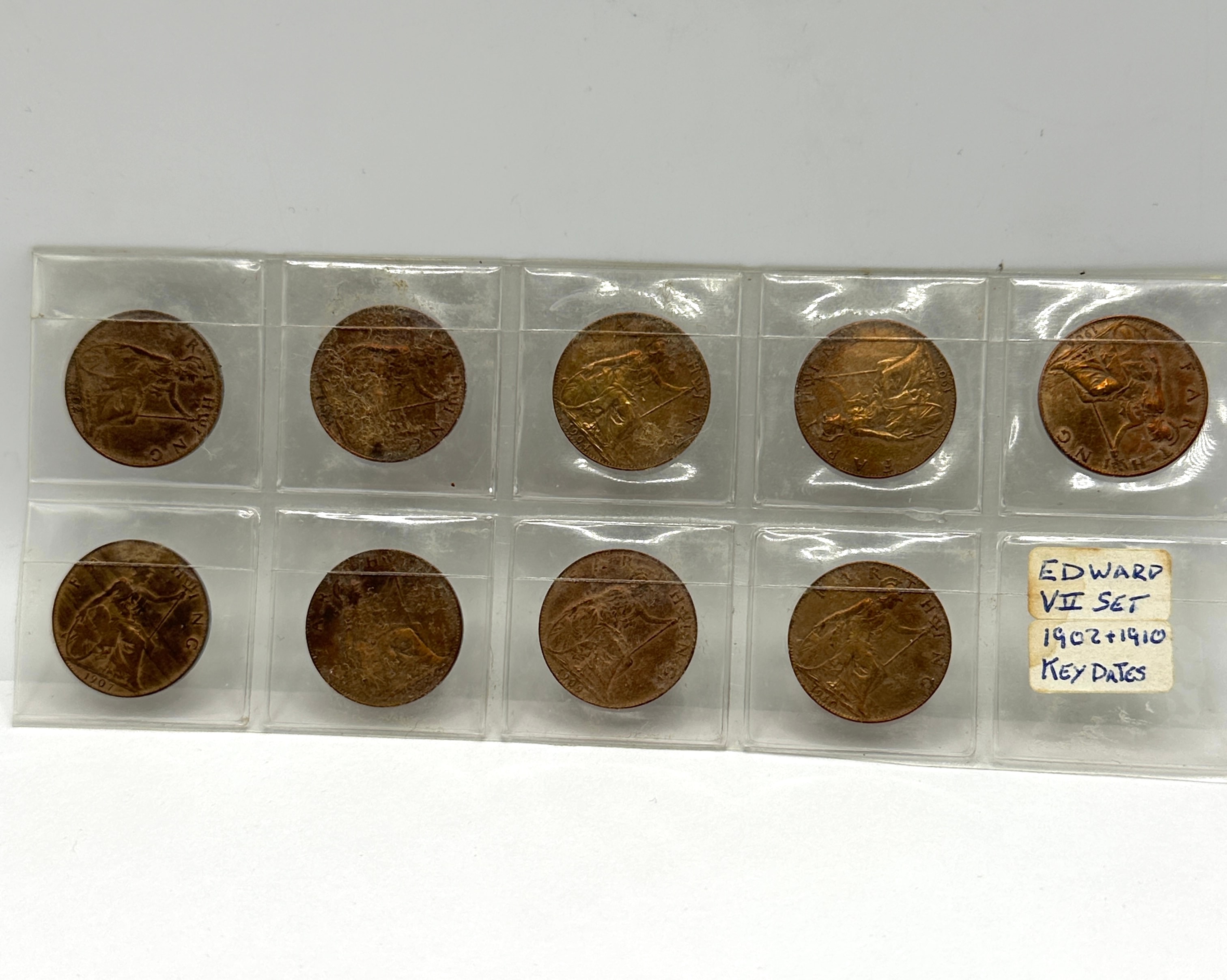 A set of ten British Edward VII copper or bronze coins, dating from 1902 and 1910, including designated ‘key dates’ as per the accompanying handwritten label. Each coin is individually housed in a clear square plastic holder, arranged in a 2×5 grid. The obverse of most coins features a regal male bust facing right, with partial inscriptions such as ‘BRITT: OMN:’ and ‘IND: IMP:’ visible. The reverse, visible on some examples, depicts a seated figure of Britannia.