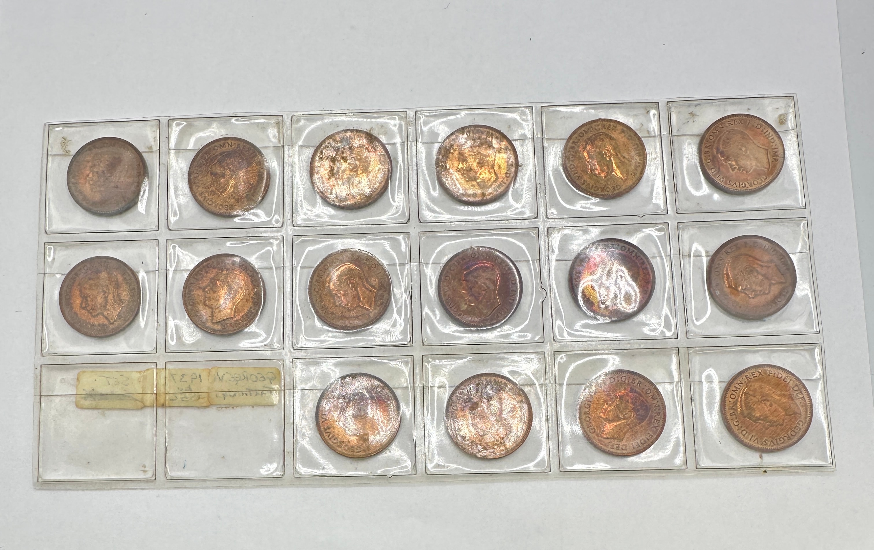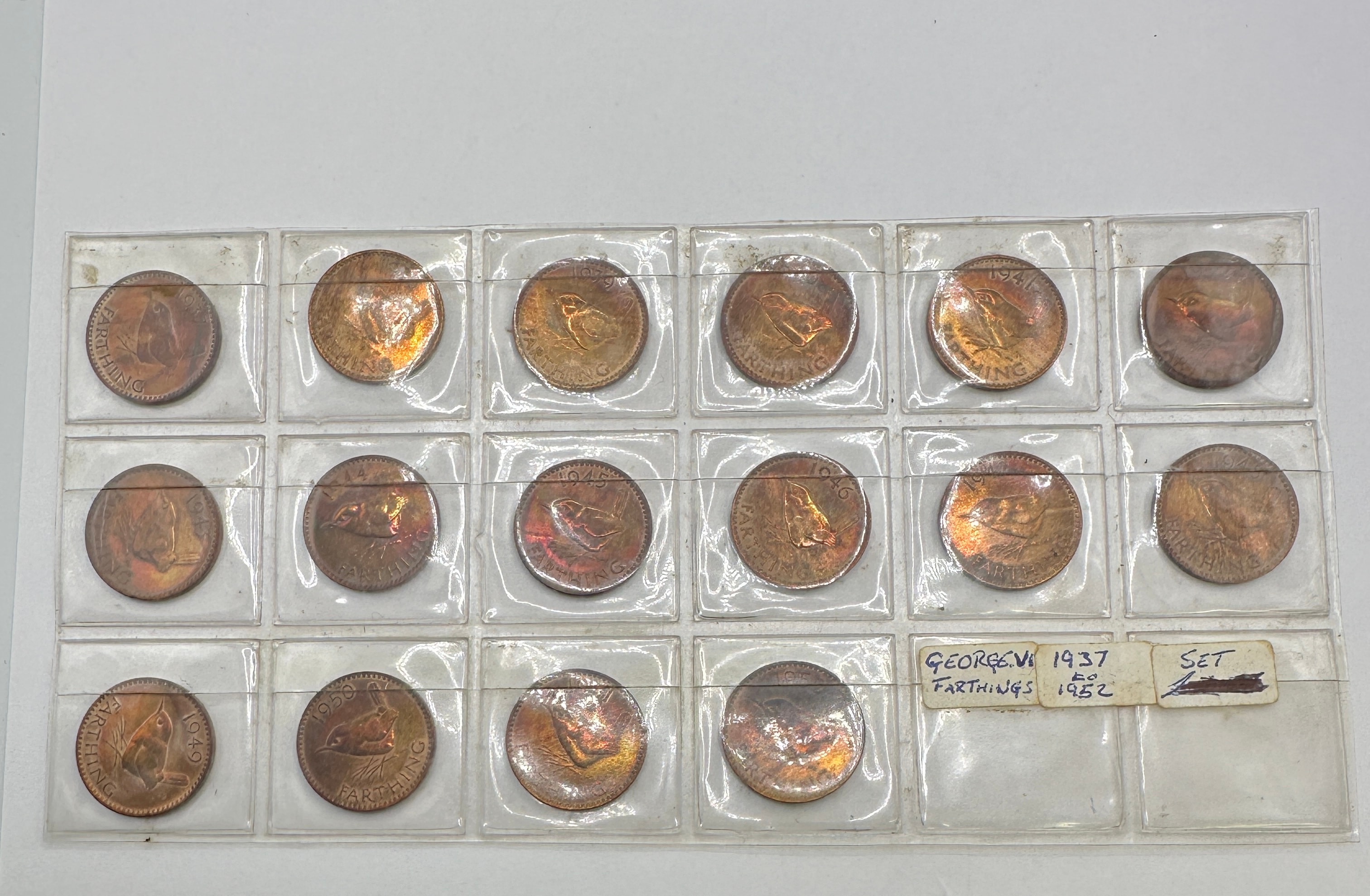 A set of fifteen British Farthing coins, identified by a handwritten label as a ‘GEORGE VI 1937 To 1952 FARTHINGS SET’. The coins are individually encapsulated in clear plastic sleeves and arranged in a three-row, five-column format within a larger, transparent storage page. Composed of bronze or copper, the coins display varying degrees of toning and iridescent patination. The reverse of each coin features a Wren design with ‘FARTHING’ visible, and dates such as 1949 and 1953 are discernible on some examples. The obverse bears a portrait of King George VI, encircled by the Latin inscription ‘GEORGIVS VI D:G:BR:OMN:REX F:D:IND:IMP’. The encapsulations appear intact.