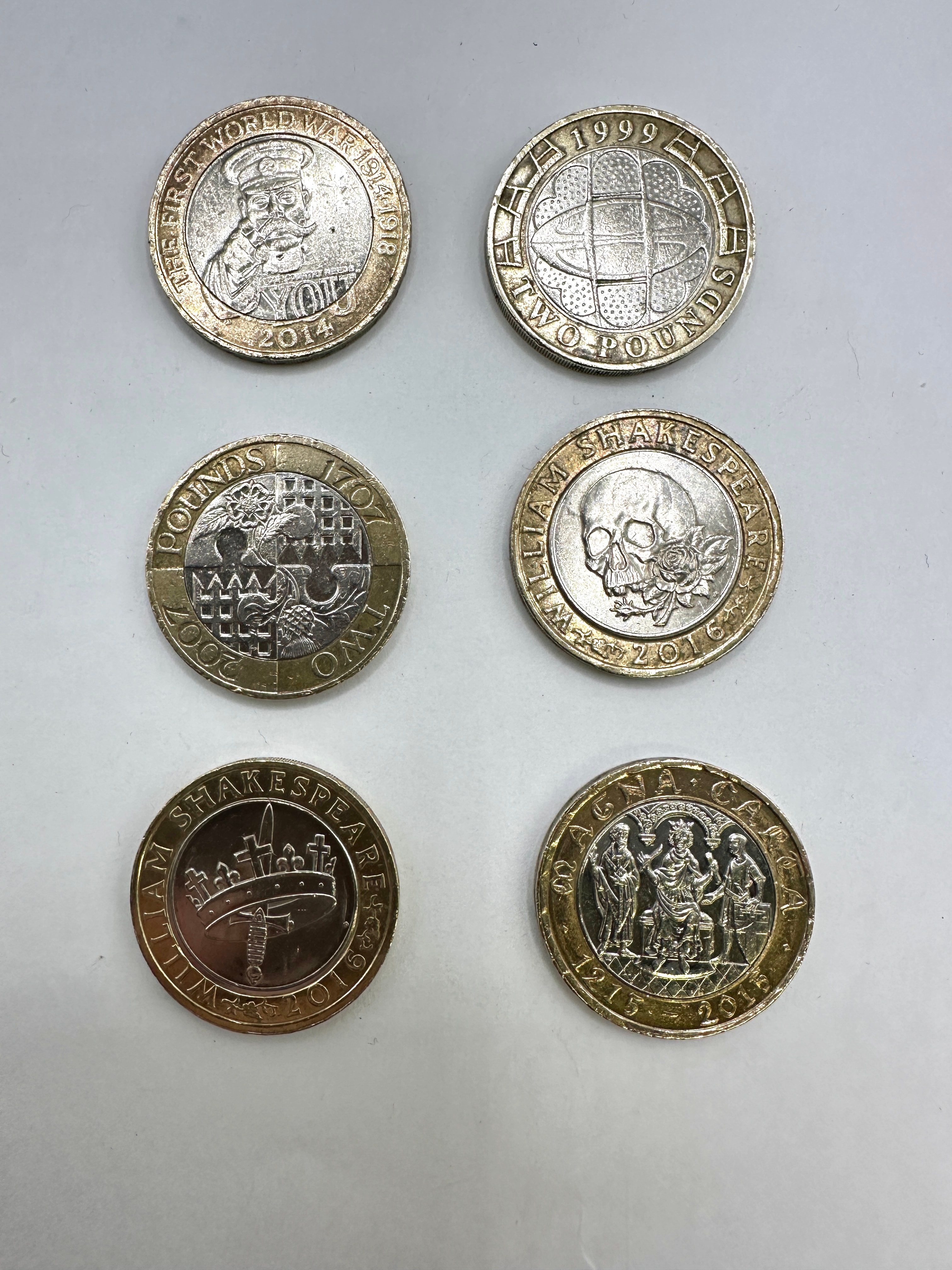 A collection of six bi-metallic commemorative British two-pound coins, each featuring a gold-tone outer ring and a silver-tone inner core. The lot includes: one coin from 2014 marked “THE FIRST WORLD WAR 1914-1918” with a portrait; a stylized globe design coin marked “1999 TWO POUNDS”; a 2007 coin marked “TWO POUNDS” depicting a shield, ships, and a Tudor rose; two coins from 2016 commemorating William Shakespeare, one featuring a skull and roses, identified by web intelligence as the ‘Tragedies’ design, and the other displaying a crown, sword, and theatre motif, identified as the ‘Comedies’ design; and a coin marked “MAGNA CARTA 1215-2015” showing three figures.