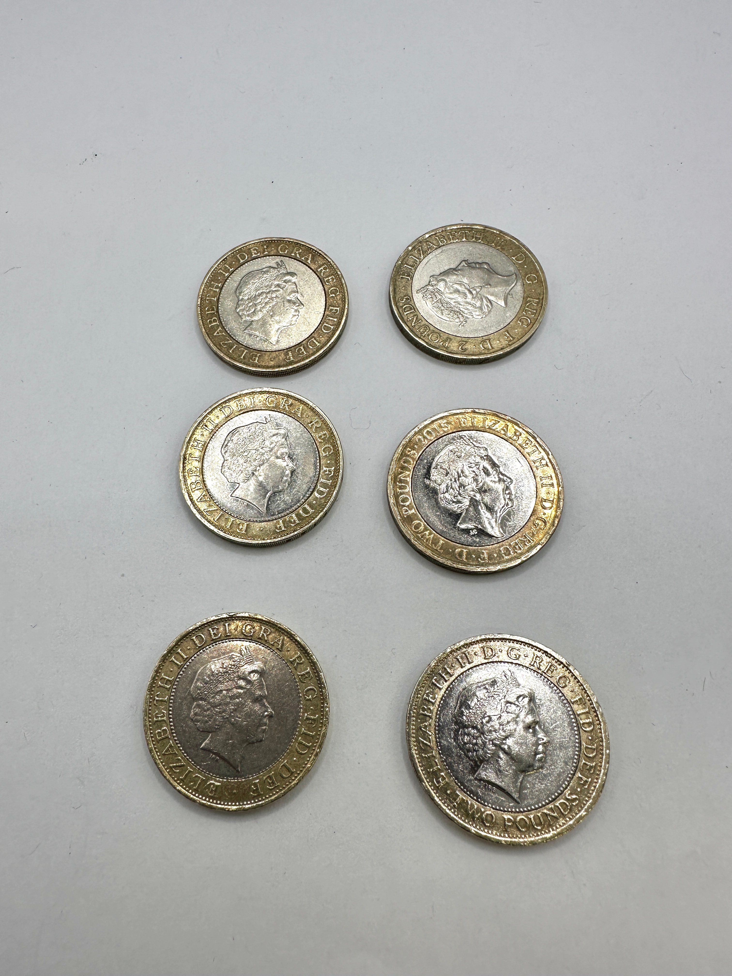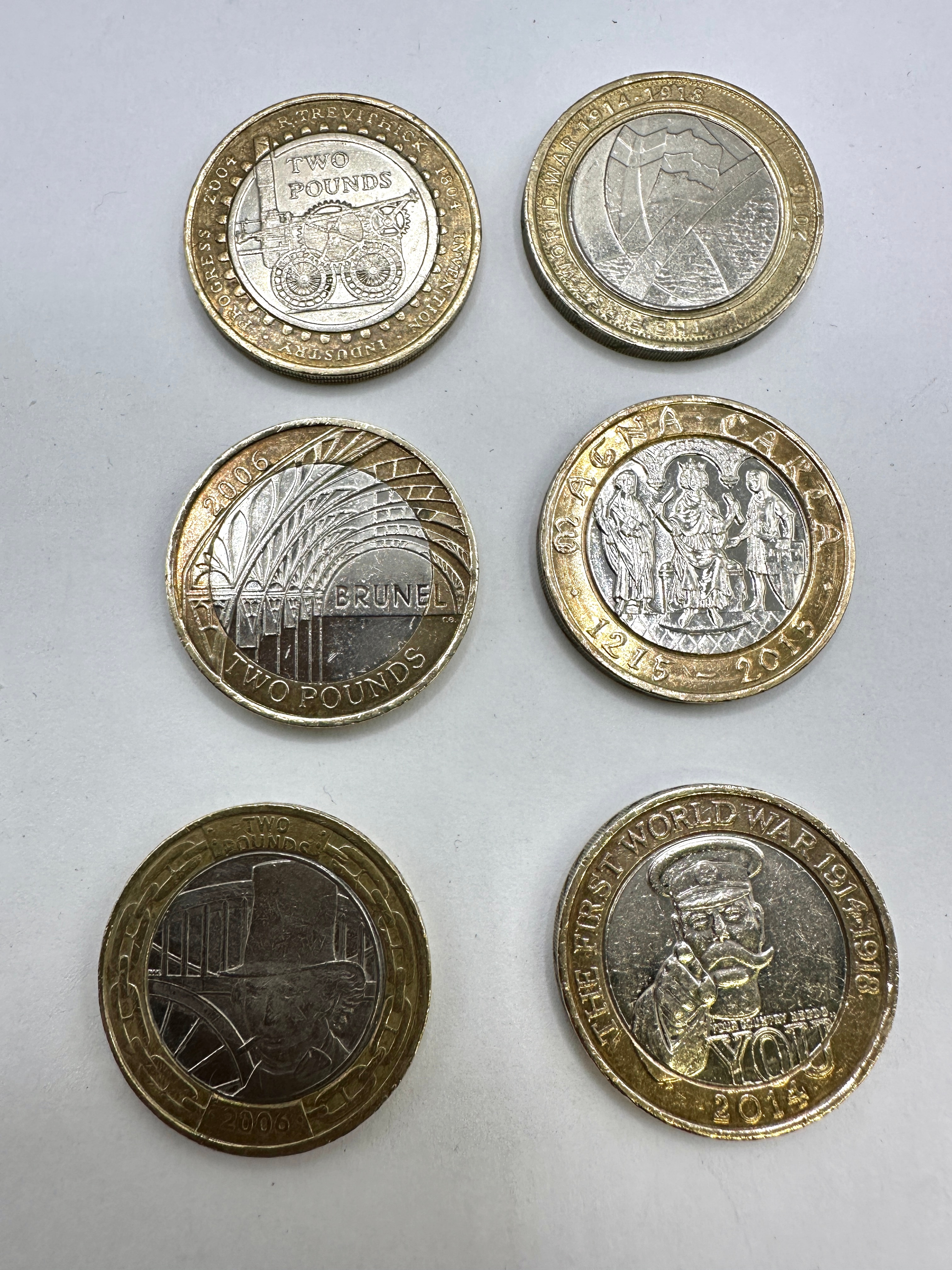 A group of six bi-metallic British two-pound (£2) commemorative coins. Each coin features a silver-colored cupro-nickel inner disc and a gold-colored nickel-brass outer ring. The obverse of each coin displays a portrait of Queen Elizabeth II, encircled by the inscription “ELIZABETH II D G REG F D” (Dei Gratia Regina Fidei Defensor – By the Grace of God, Queen, Defender of the Faith) and the denomination “TWO POUNDS.” The reverse sides depict various historical and commemorative themes, including: a steam engine for “TREVITHICK 1804 INVENTION INDUSTRY 2004”; an abstract design for “1914-2014”; a design relating to “BRUNEL 2006” (specifically the ‘Achievements’ design, as identified in market consensus); three figures for “MAGNA CARTA 1215-2015”; a top hat and structural design also dated “2006” (another Brunel theme, specifically ‘Paddington Station’); and a bust of Lord Kitchener for “THE FIRST WORLD WAR 1914-1918 2014.”