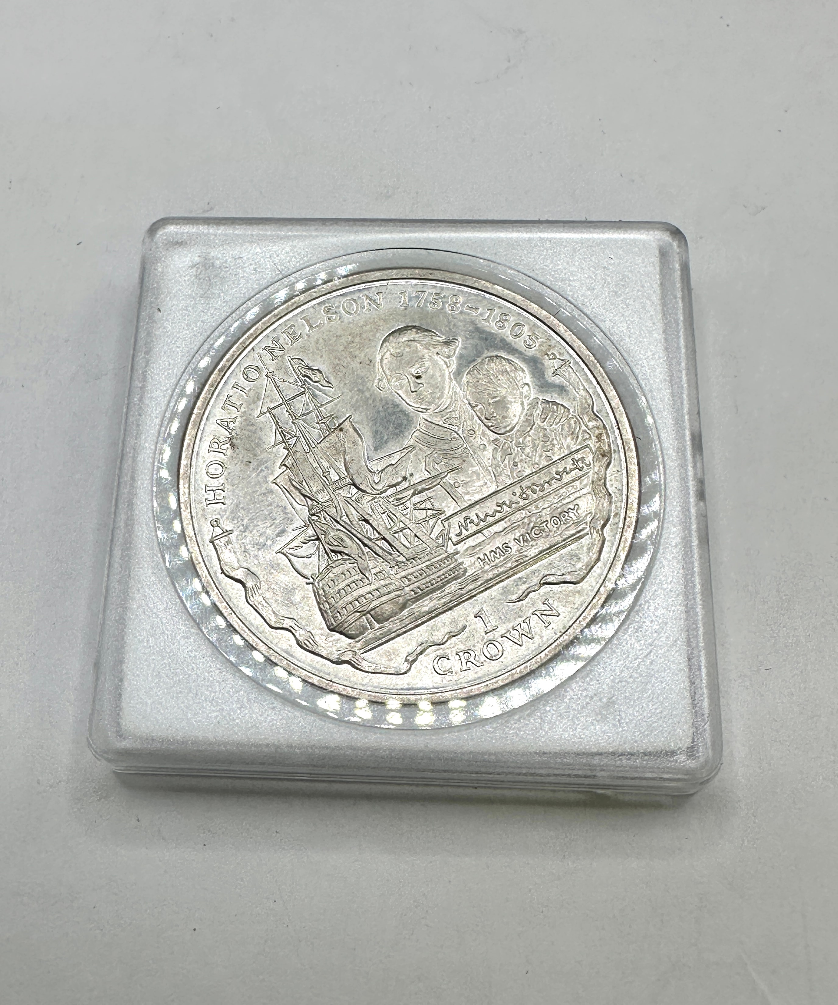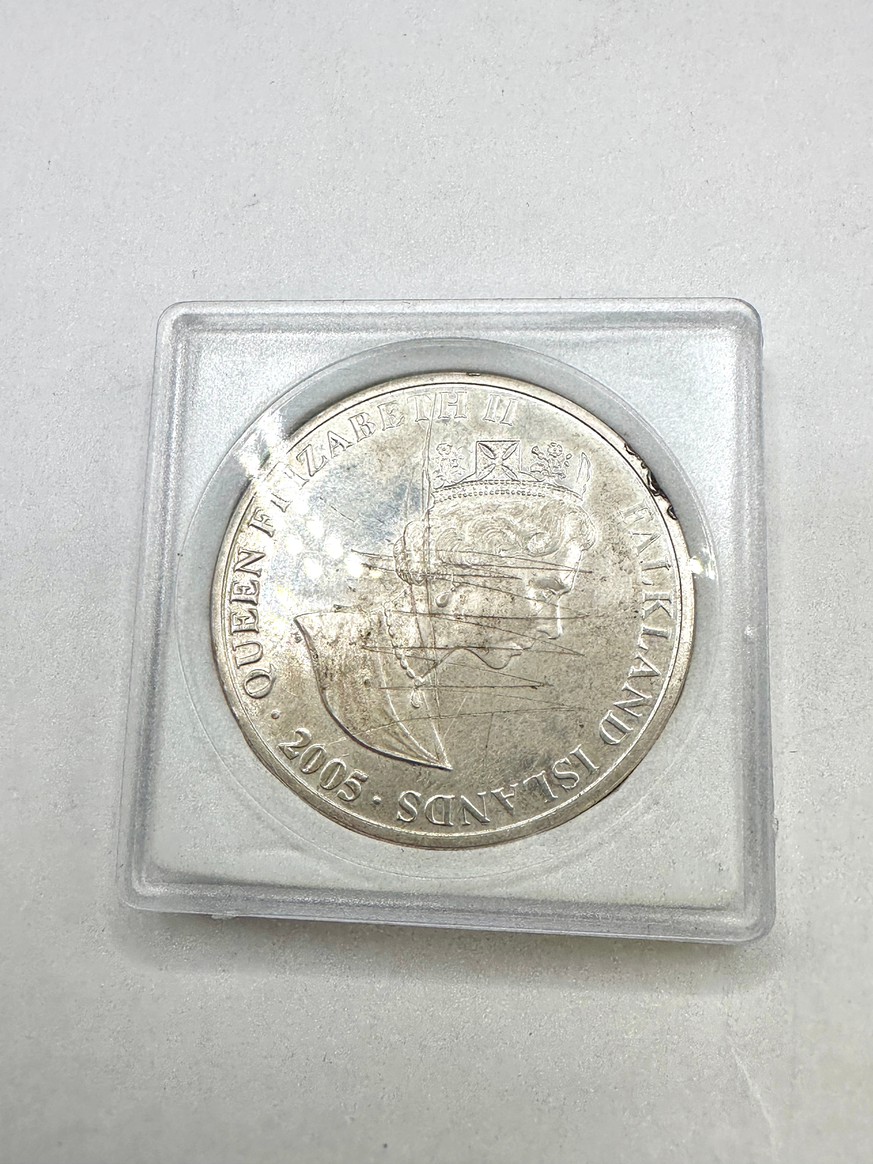 A modern commemorative coin, confirmed to be composed of 925 silver, housed within a clear plastic protective capsule. The obverse features a right-facing bust of Queen Elizabeth II wearing a crown, encircled by the inscriptions “QUEEN ELIZABETH II” and “FALKLAND ISLANDS”, with the year “2005” below the bust. The opposing side depicts a large sailing ship, identified as “HMS VICTORY”, alongside two figures, surrounded by the inscription “P. HORATIO NELSON 1758-1805” and the denomination “1 CROWN”.