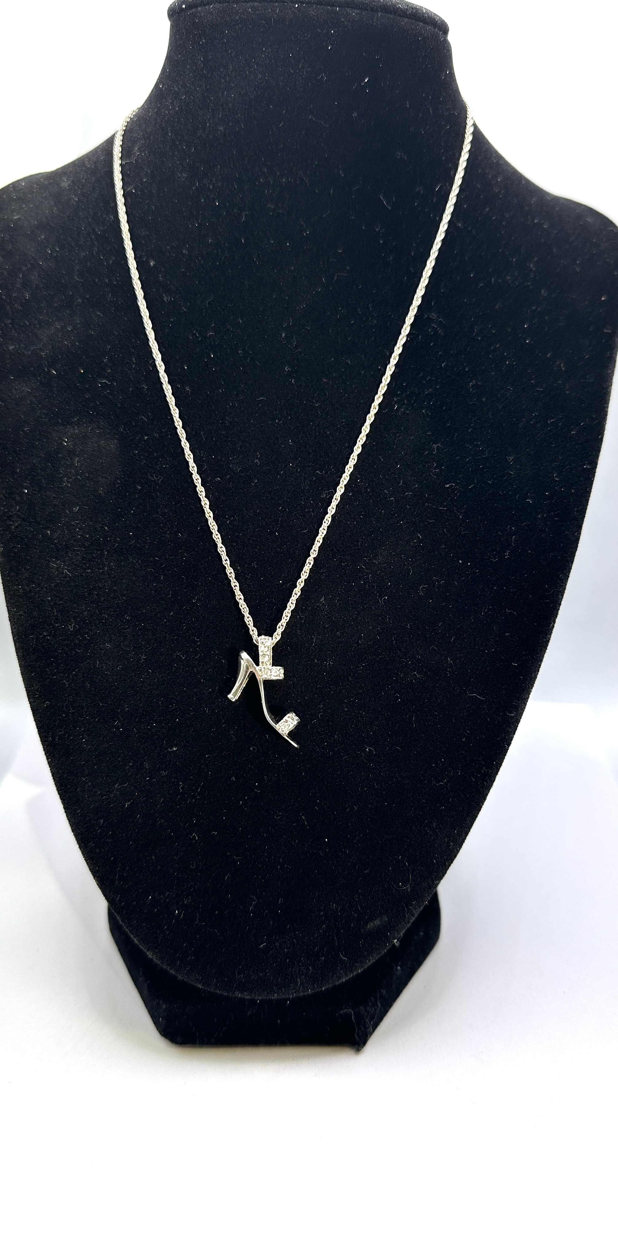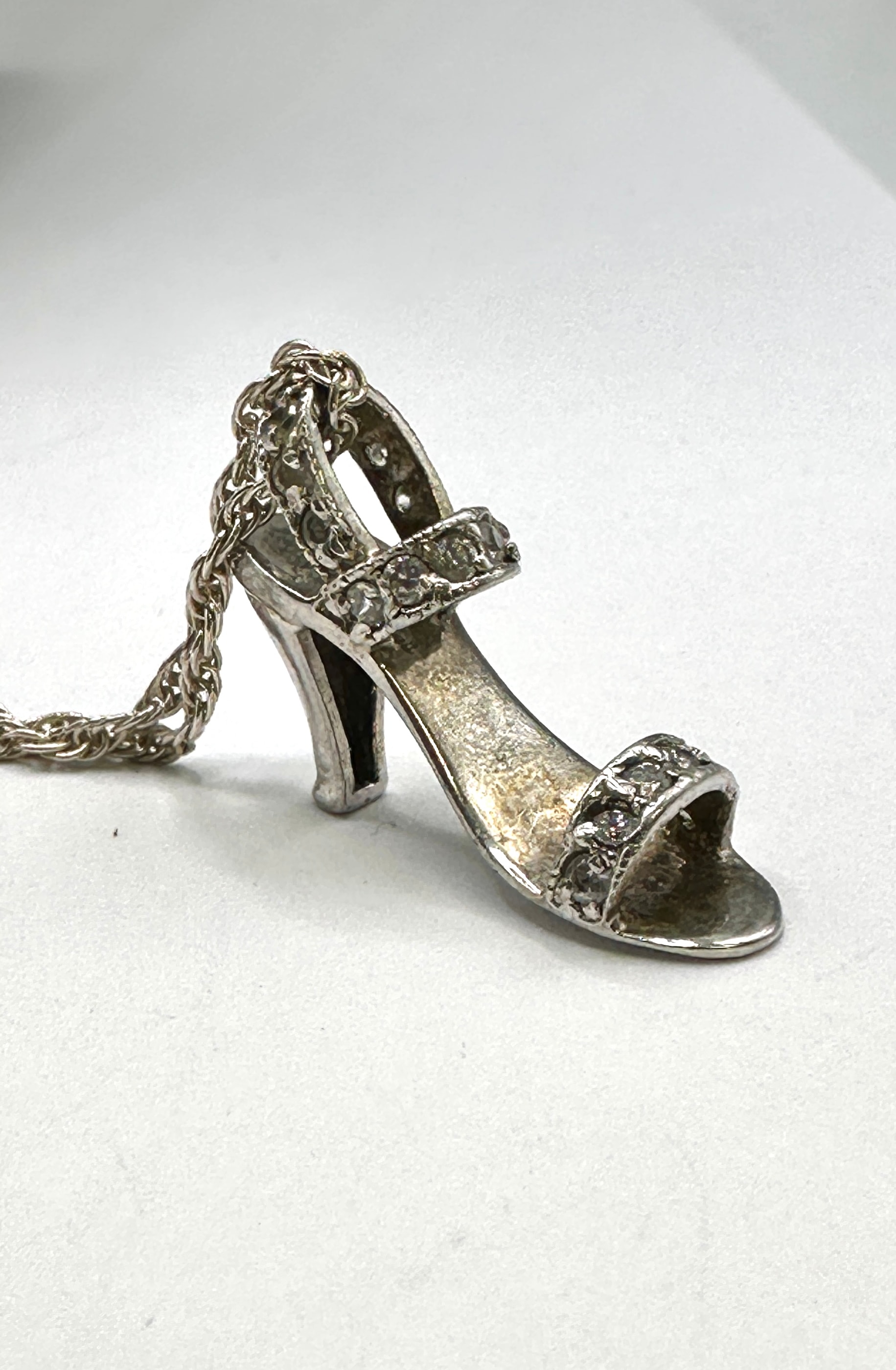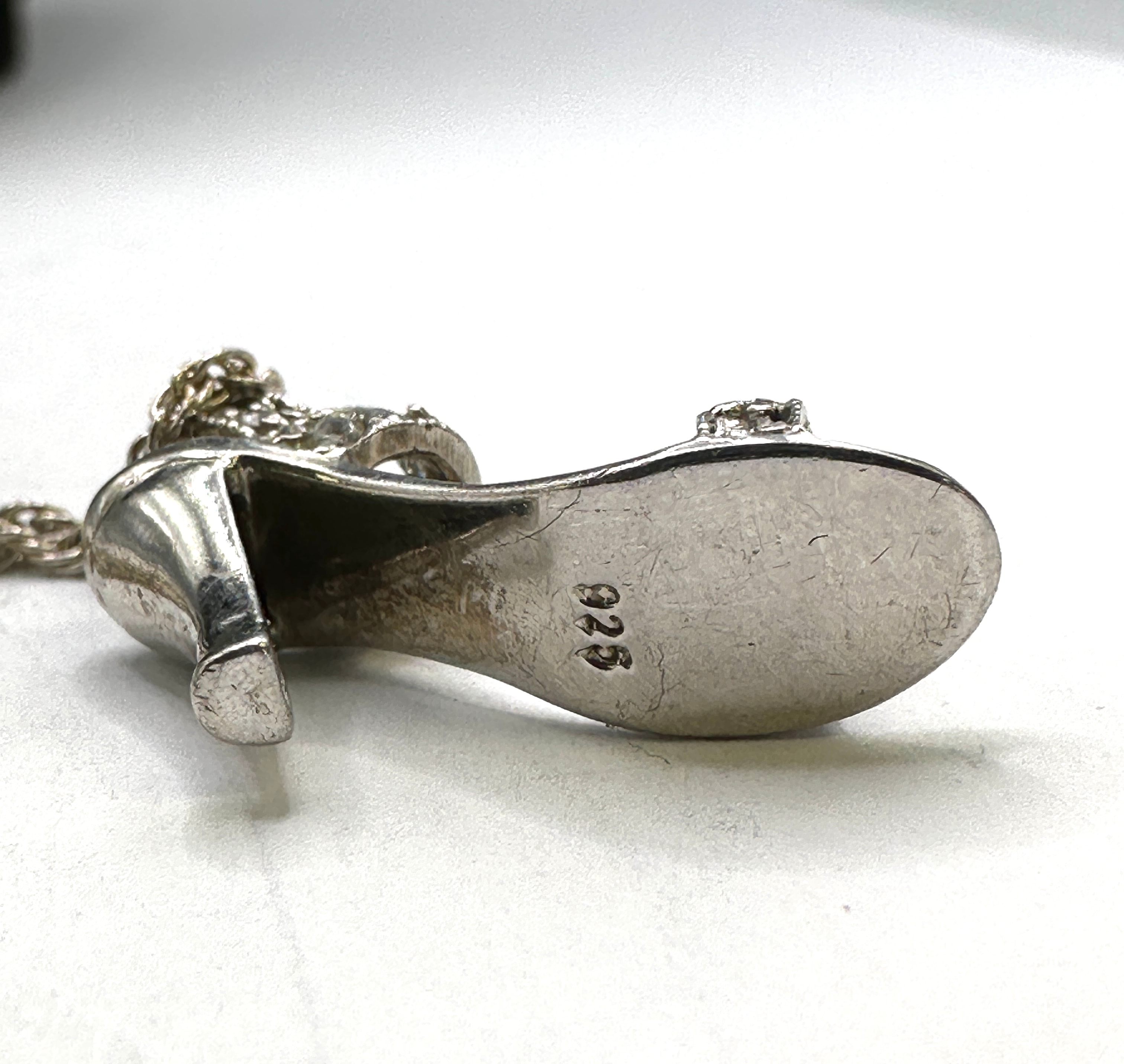 A sterling silver twisted-link chain necklace featuring a figural high-heeled sandal pendant. The pendant is adorned with small, clear stones, likely rhinestones, on its strap details. A ‘925’ hallmark is clearly visible on the underside of the pendant’s sole, confirming sterling silver.