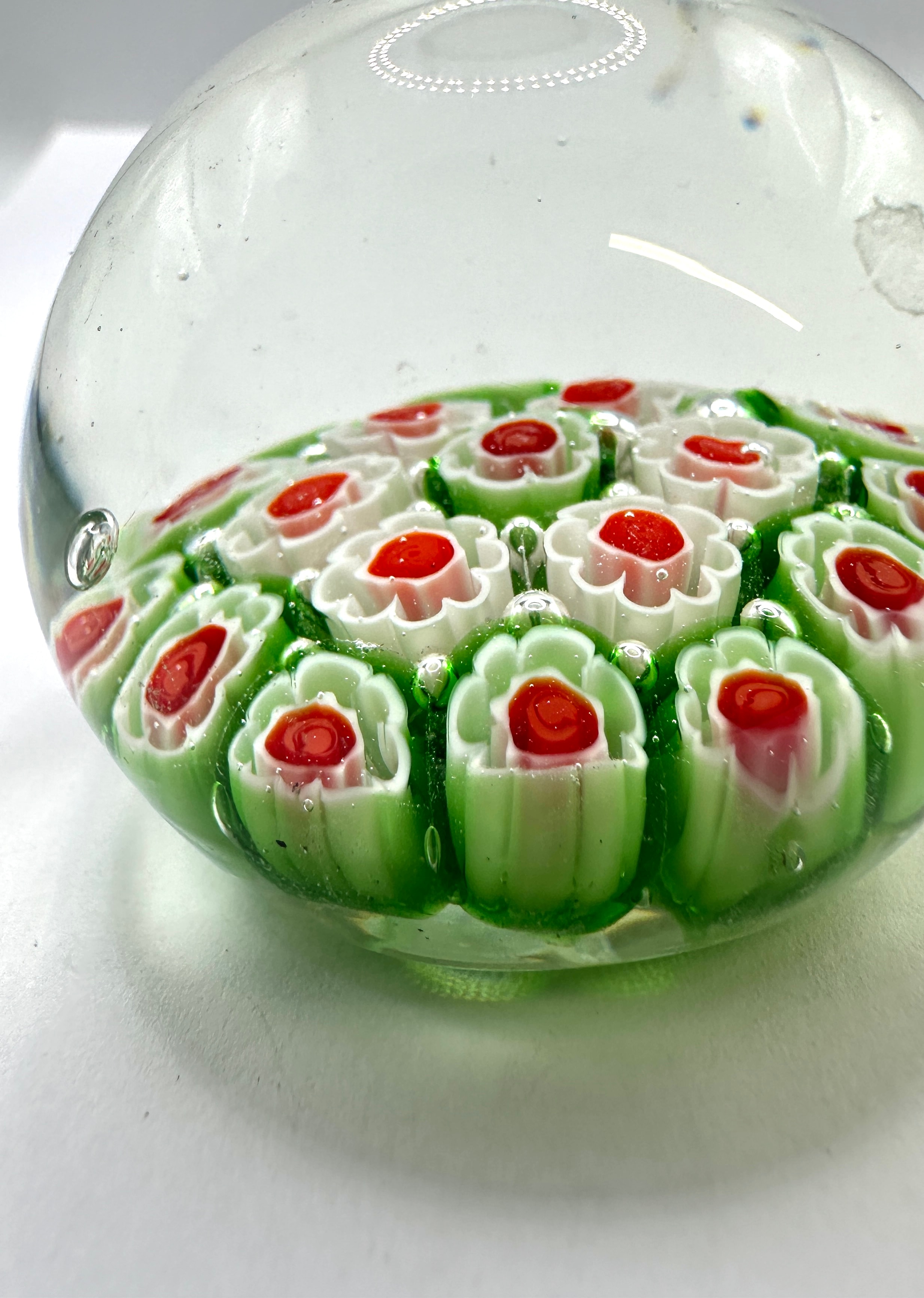 A vintage millefiori art glass paperweight featuring an intricate internal lampwork design. The interior is densely packed with multiple individual millefiori canes, each depicting a small, stylized flower with a red core, white petals, and an outer green layer, forming a cohesive floral-patterned cluster. Numerous small, trapped air bubbles are visible interspersed throughout the internal elements.