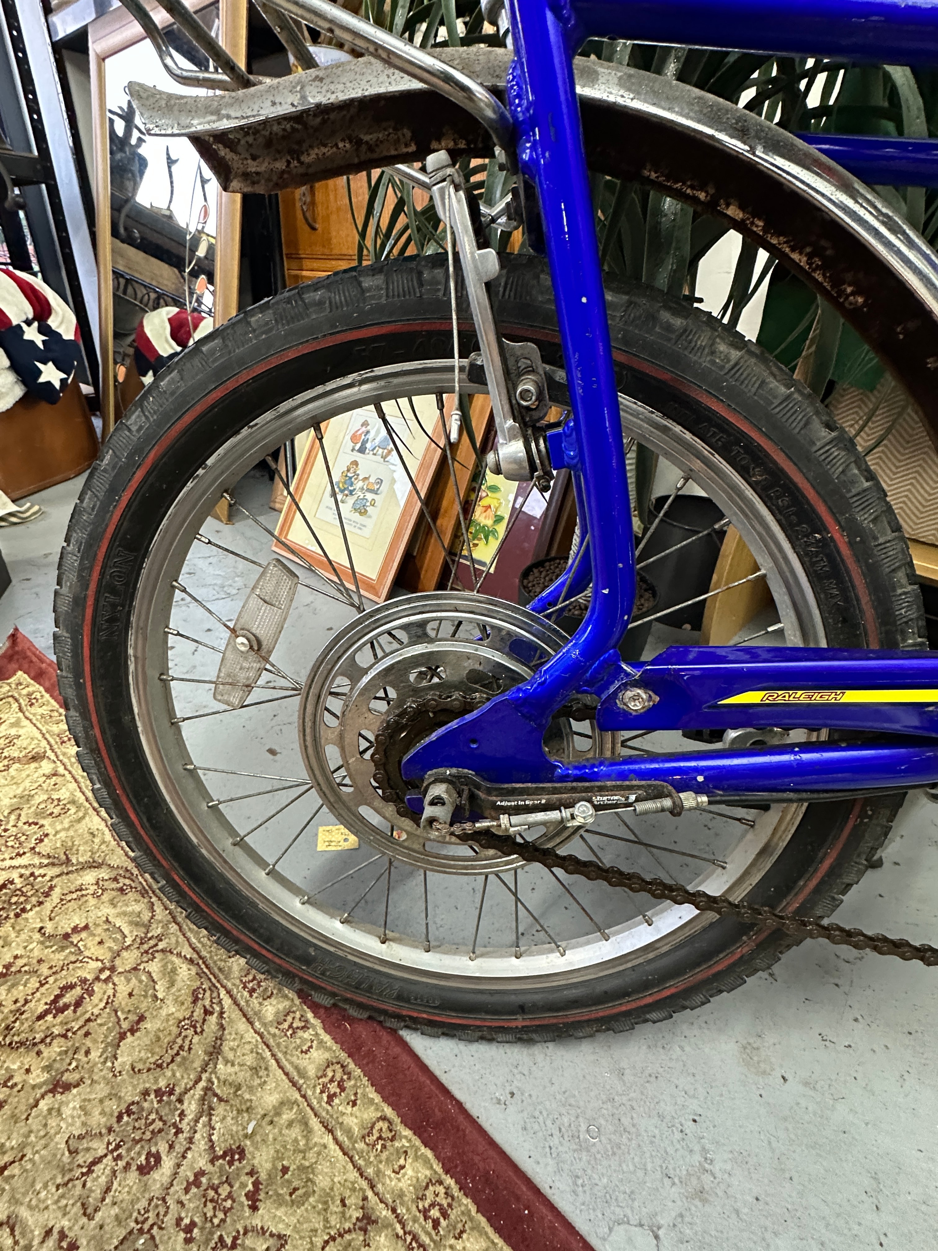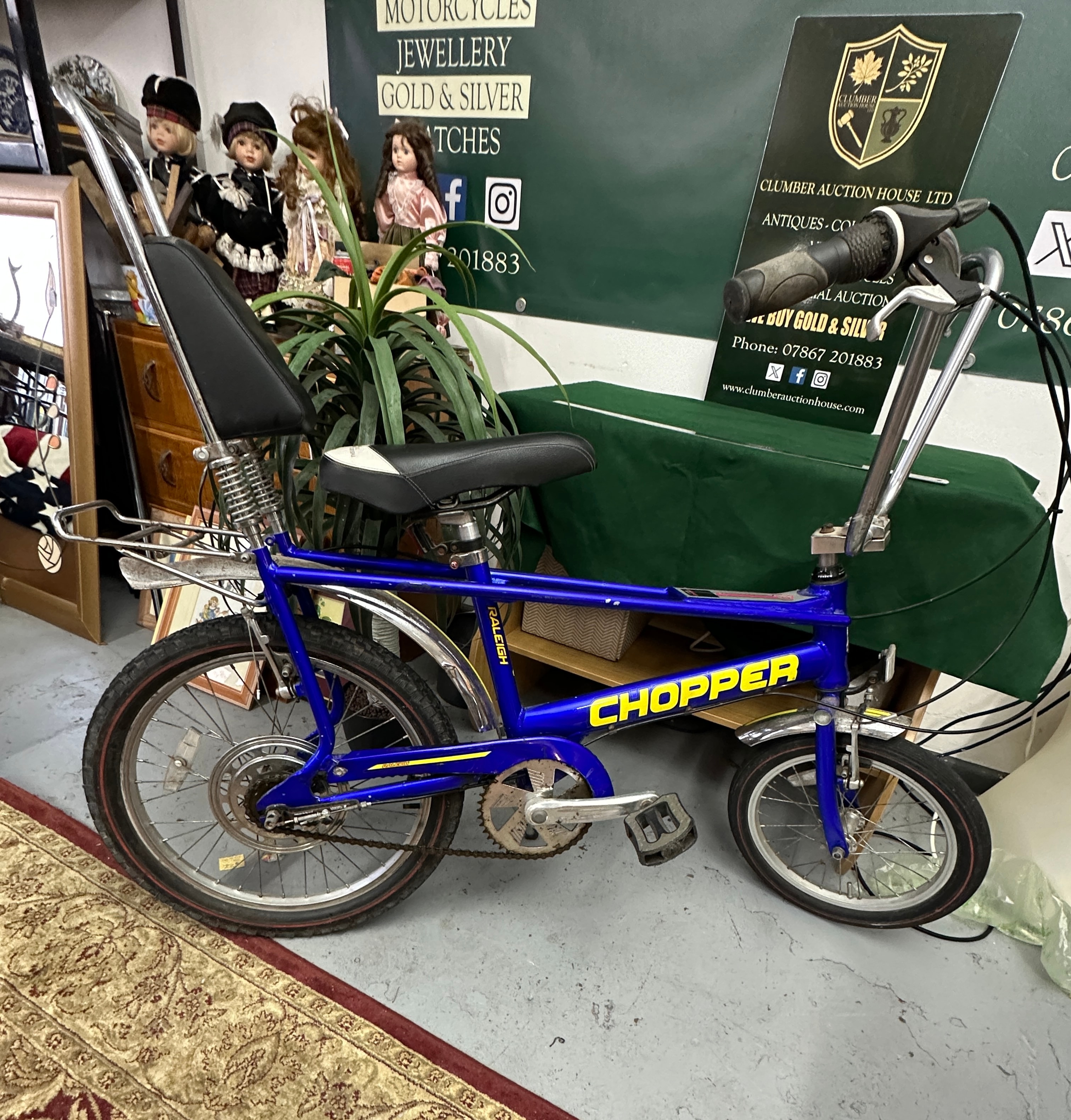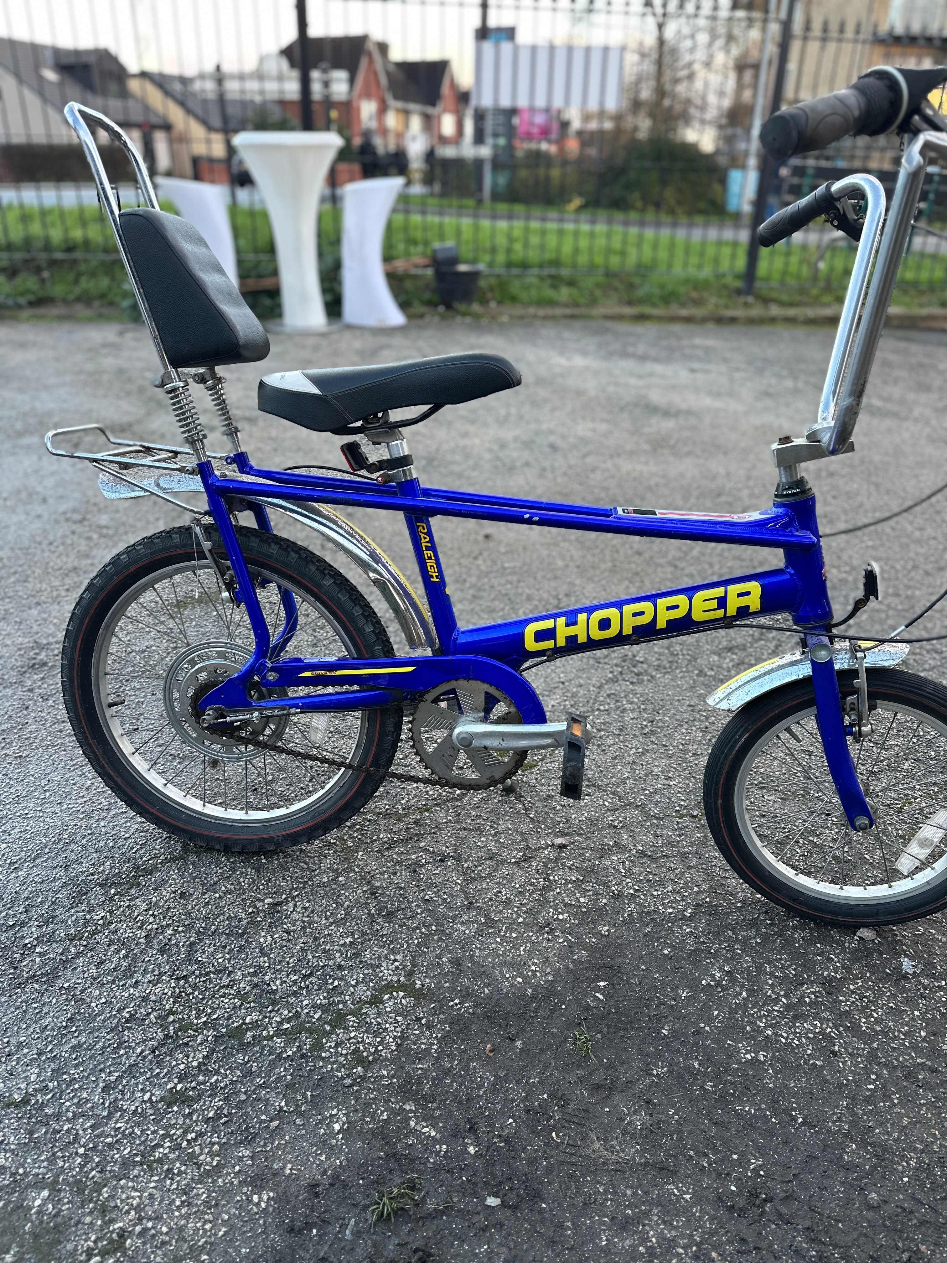 A Raleigh Chopper Mk3 bicycle, constructed with a metal frame and finished in blue. The frame prominently displays “CHOPPER” in yellow lettering on the main crossbar and “RALEIGH” vertically on the downtube, with additional “RALEIGH” branding visible near the rear wheel. It features chrome handlebars, front forks, fenders, and a high-back sissy bar with black vinyl seats. The bicycle exhibits the signature Chopper style with unequal wheel sizes—a smaller front wheel and a larger rear wheel—and appears to have internal hub gears, indicated by a visible shifter cable.