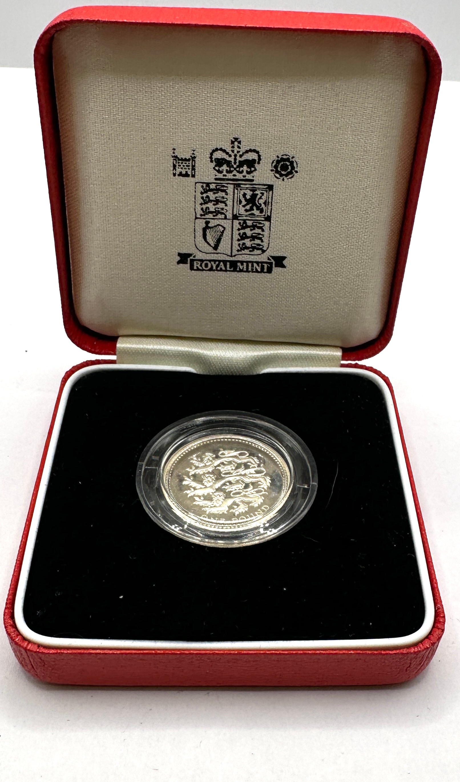 A Royal Mint Elizabeth II Piedfort £1 Silver Proof Coin, struck in 925 silver, featuring the classic St. George and the Dragon design. The visible side displays a detailed relief of St. George mounted on a horse slaying a dragon, with text around the rim including “ST. GEORGE” and “SOVEREIGN”. The coin is housed within a clear plastic protective capsule and presented in its original Royal Mint packaging: a red leatherette or faux leather hinged box with a white satin-like interior lid and a black velvet-flocked base insert. The lid’s interior features a printed Royal Coat of Arms of the United Kingdom with a Tudor Rose, Thistle, and Shamrock motif, and the text “ROYAL MINT” beneath it.