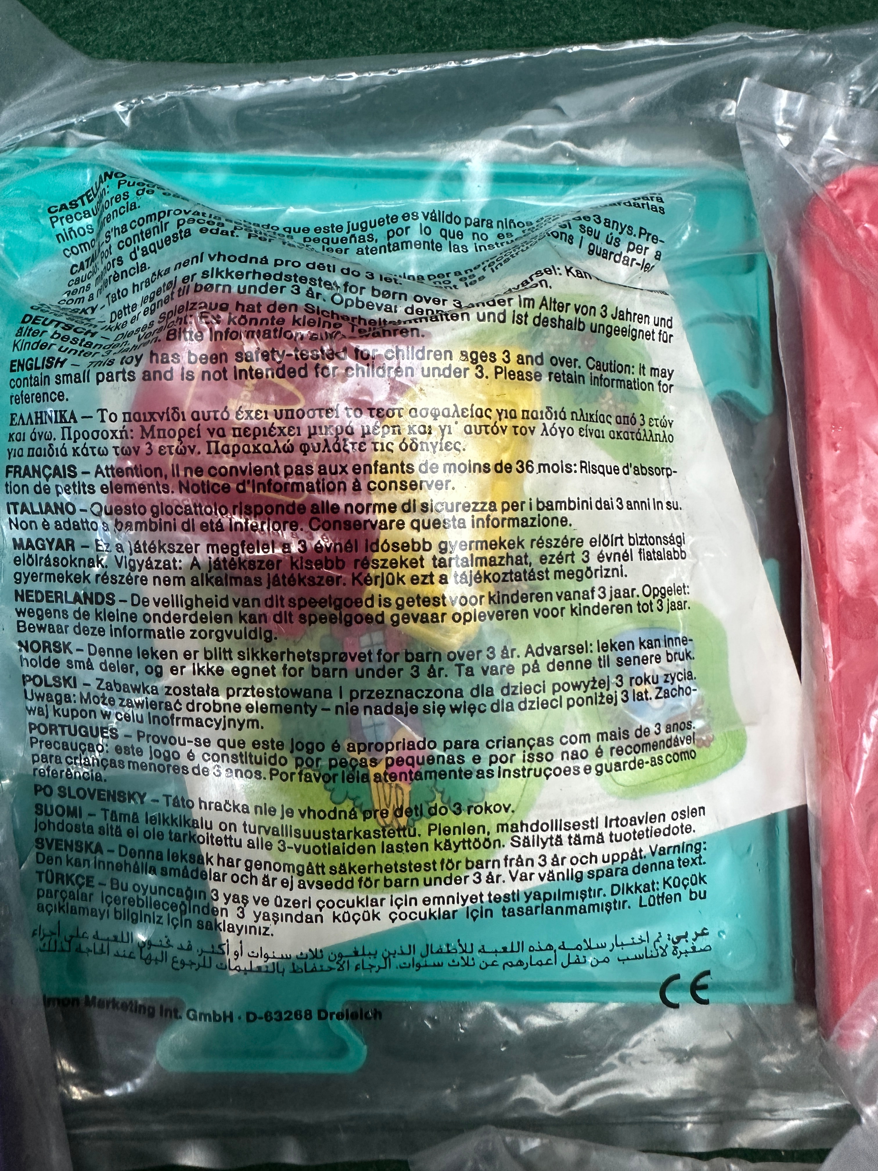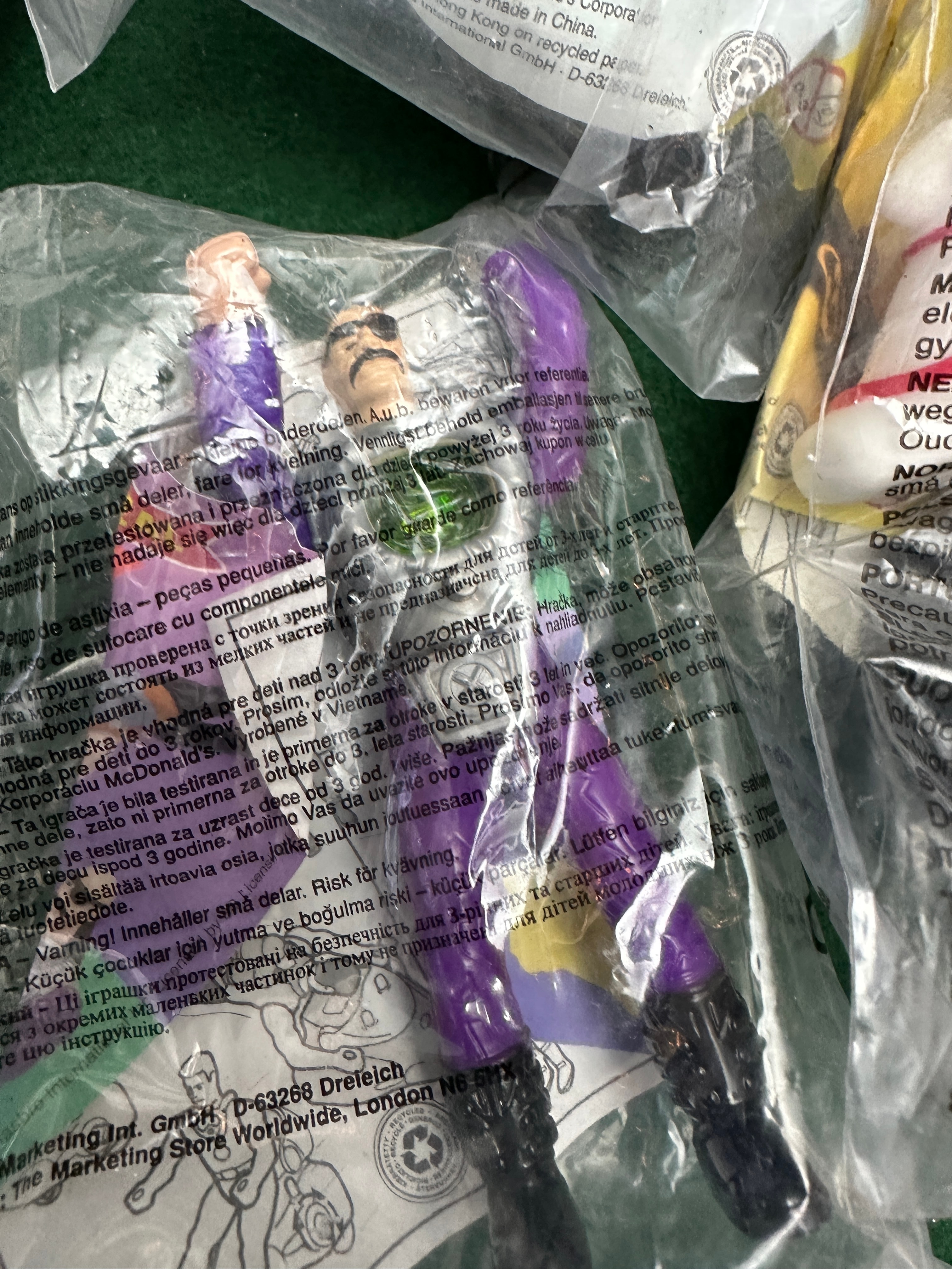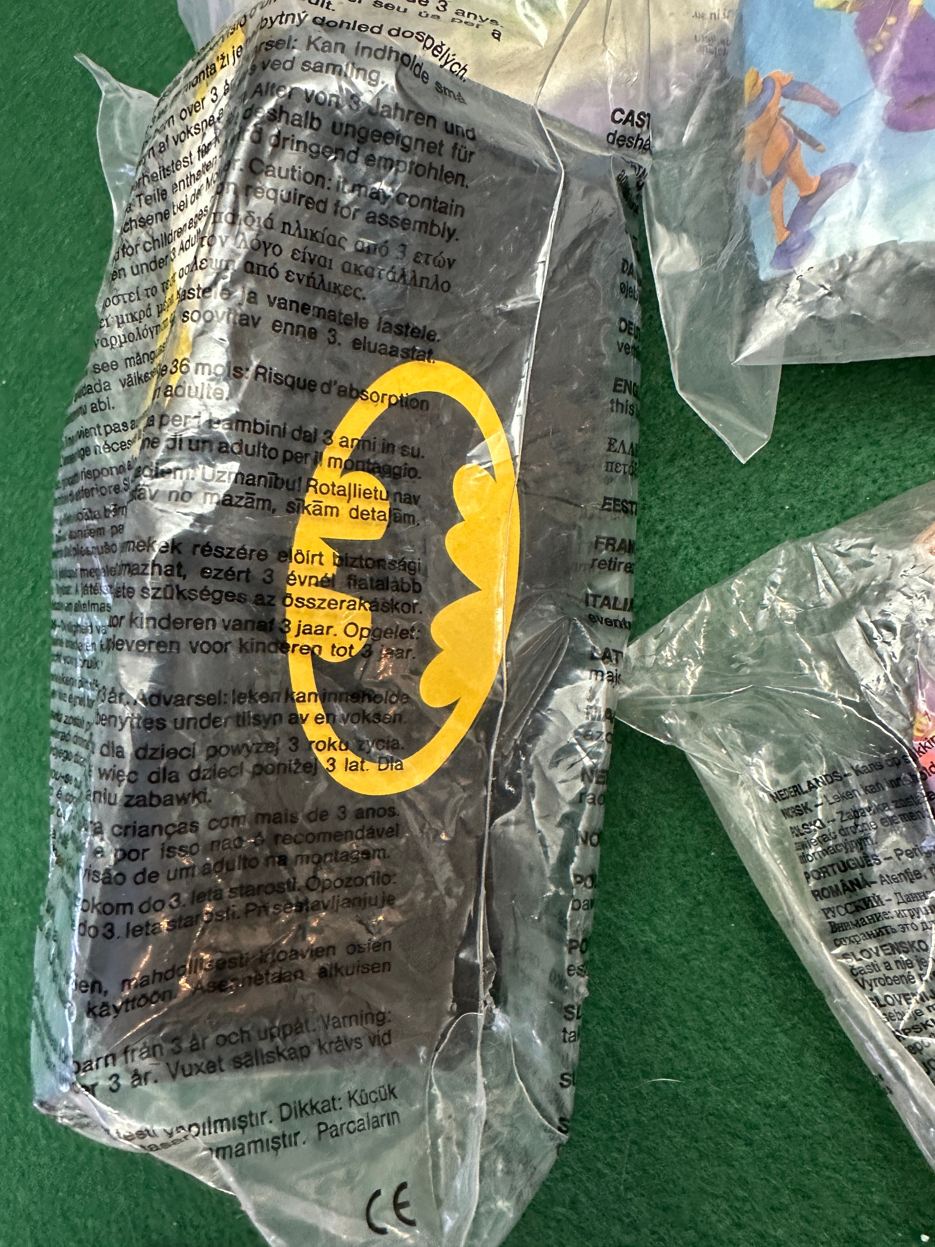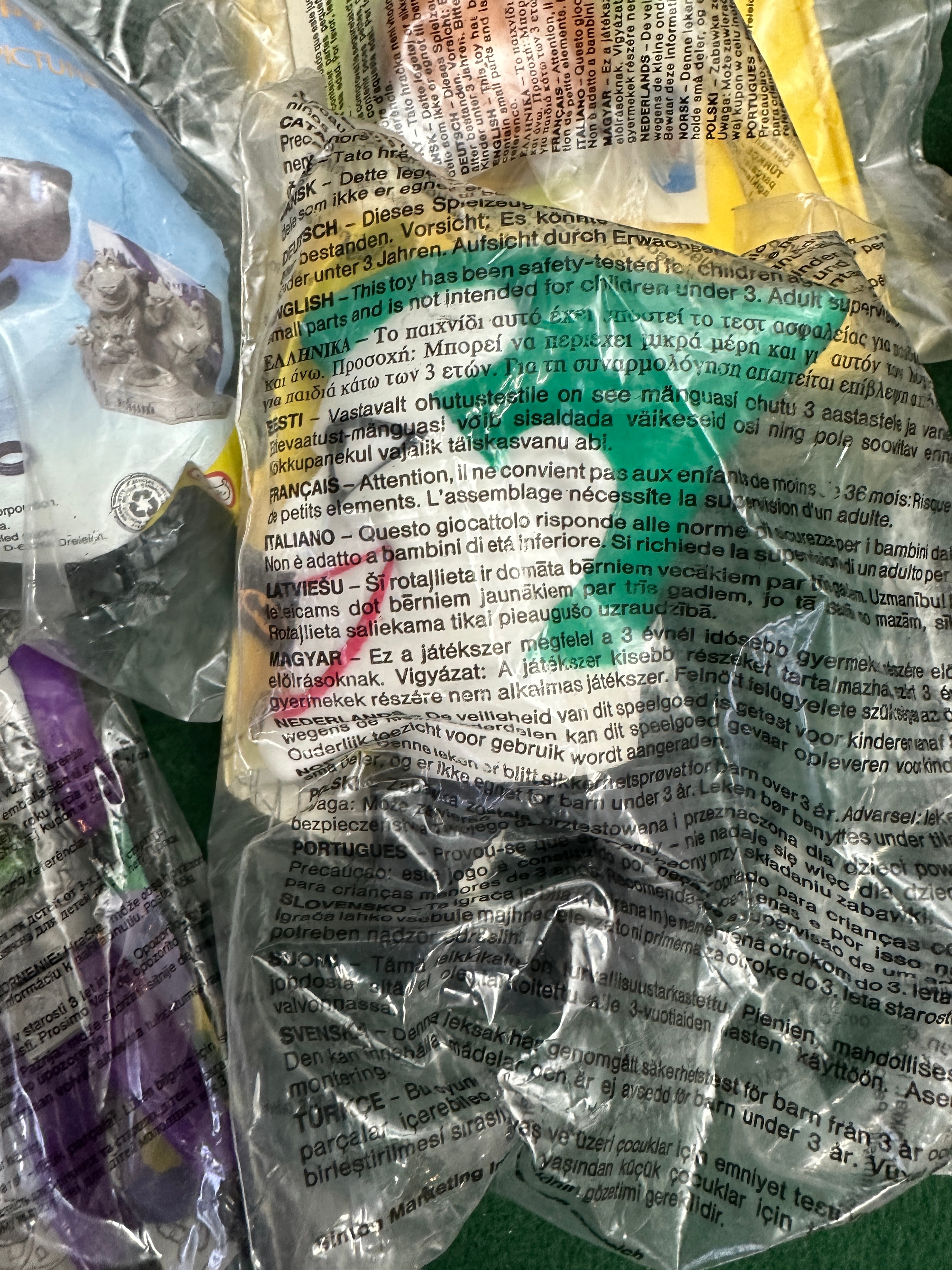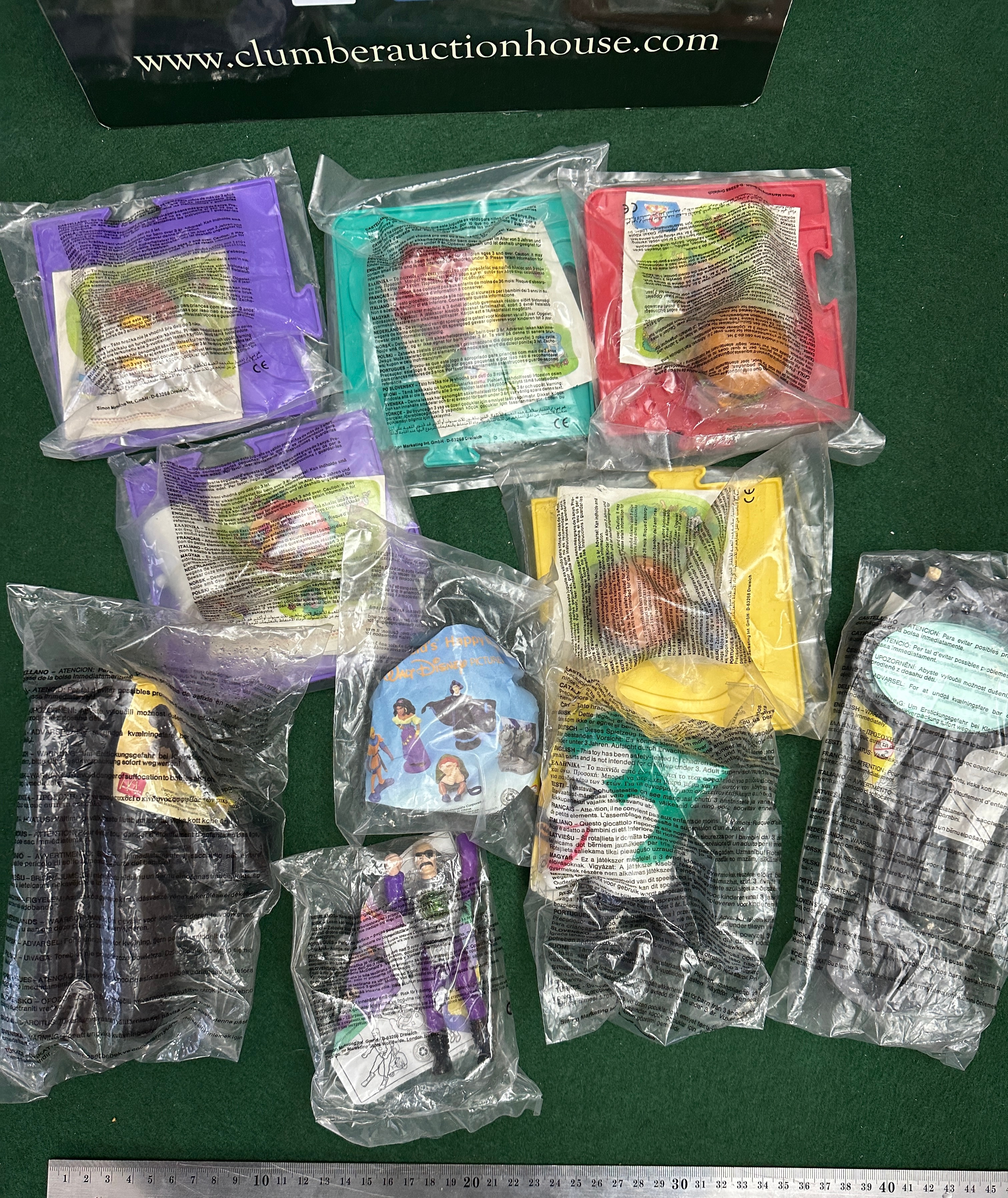 This lot comprises ten new, unused, and factory-sealed plastic promotional toys. Each toy is individually packaged in a clear plastic bag. These items are identified as McDonald’s Happy Meal toys, originating from the late 2010s to early 2020s, based on visible branding and featured franchises. Specific contents include one item with a prominent yellow Batman logo, another depicting characters from Disney’s *Frozen*, and a purple-suited character figure, along with other assorted colorful molded plastic components. Each bag carries extensive multilingual warning labels, including English text advising the toy is “safety-tested for children ages 3 and over,” “may contain small parts and is not intended for children under 3,” and provides suffocation warnings for the plastic bag itself. Distributor information such as “The Marketing Store Worldwide” and “McDonald’s” is present in fine print on the packaging.