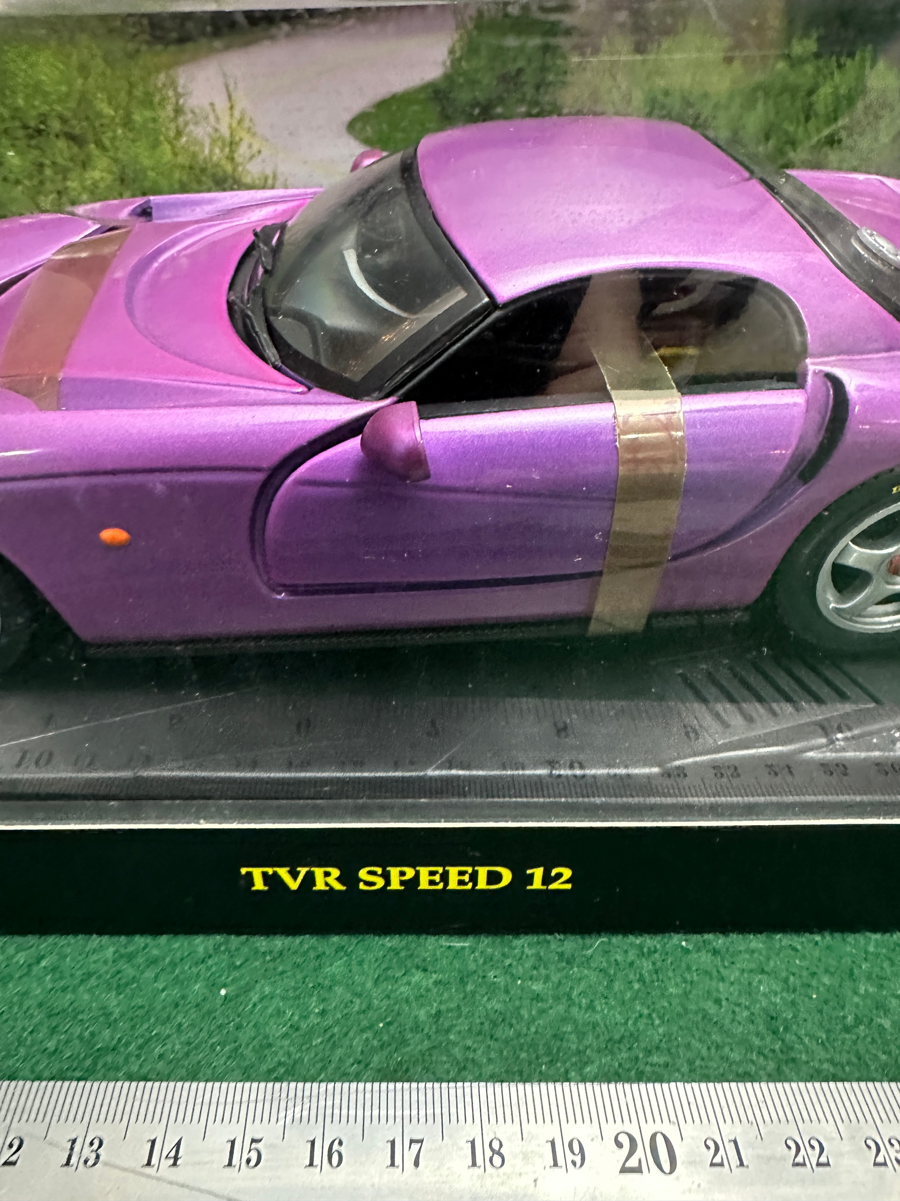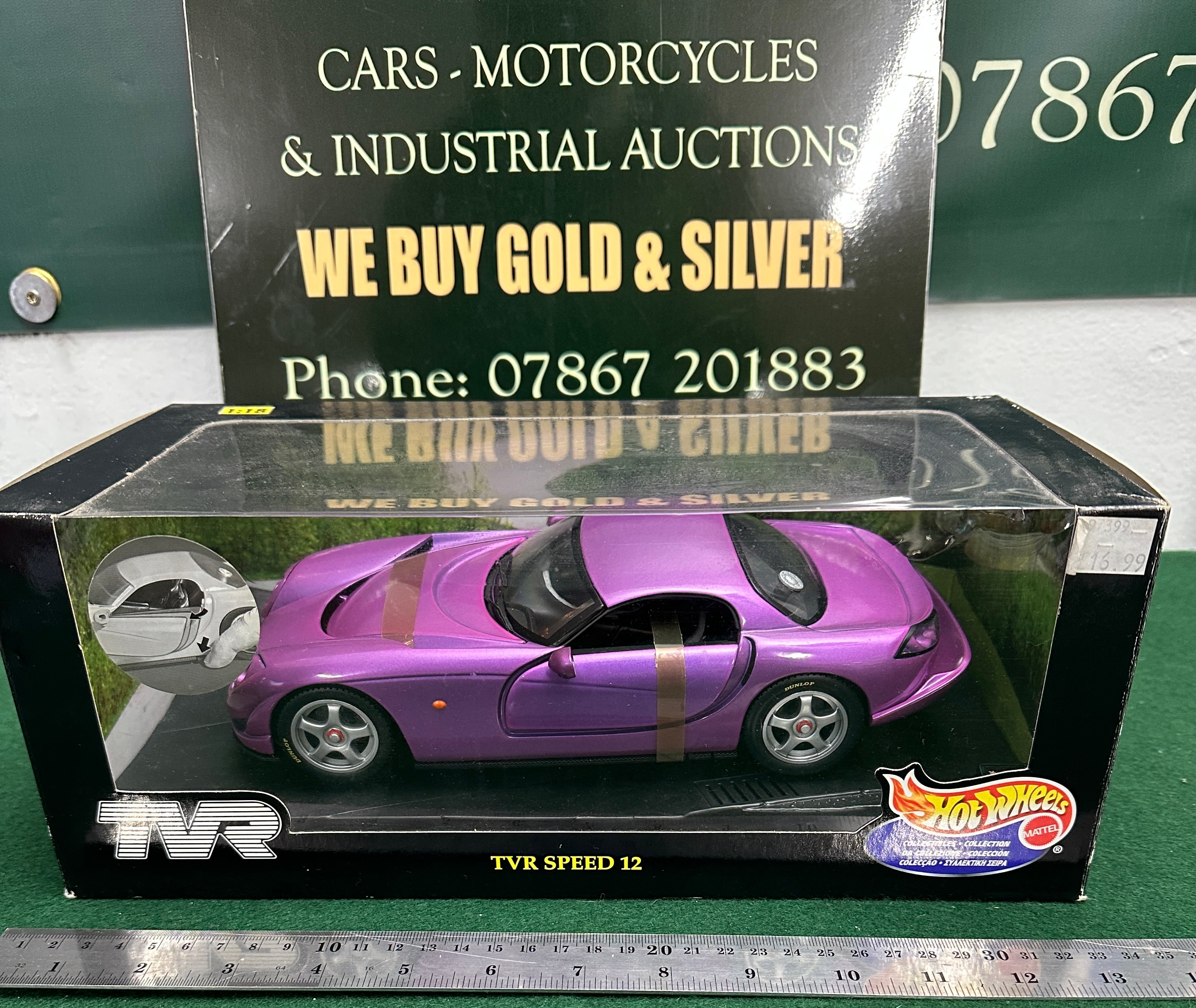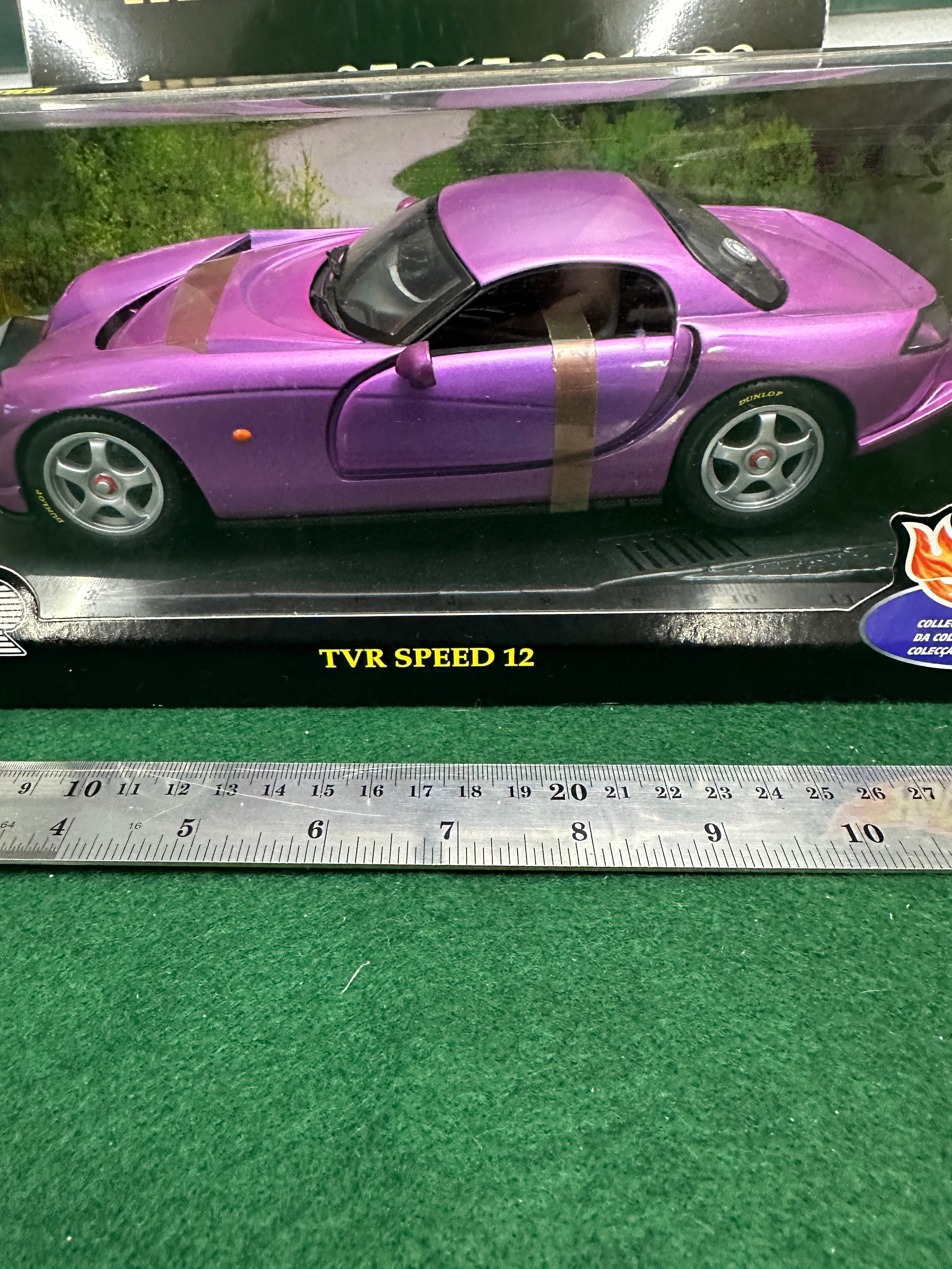 A Hot Wheels TVR Speed 12 1:18 Scale die-cast model car, presented in a metallic purple finish. This two-door sports car features visible “DUNLOP” branding on its tires and is secured by tape to a black display base. The item is housed in its original manufacturer’s packaging, comprising a clear plastic display case enclosed by an outer cardboard box. The packaging identifies the item as part of the “COLLECTORS’ SERIES” (SÉRIE DE COLLECTIONNEURS, COLECCIÓN DE COLECCIONISTAS). A small sticker with “39/99” is affixed to the box.
