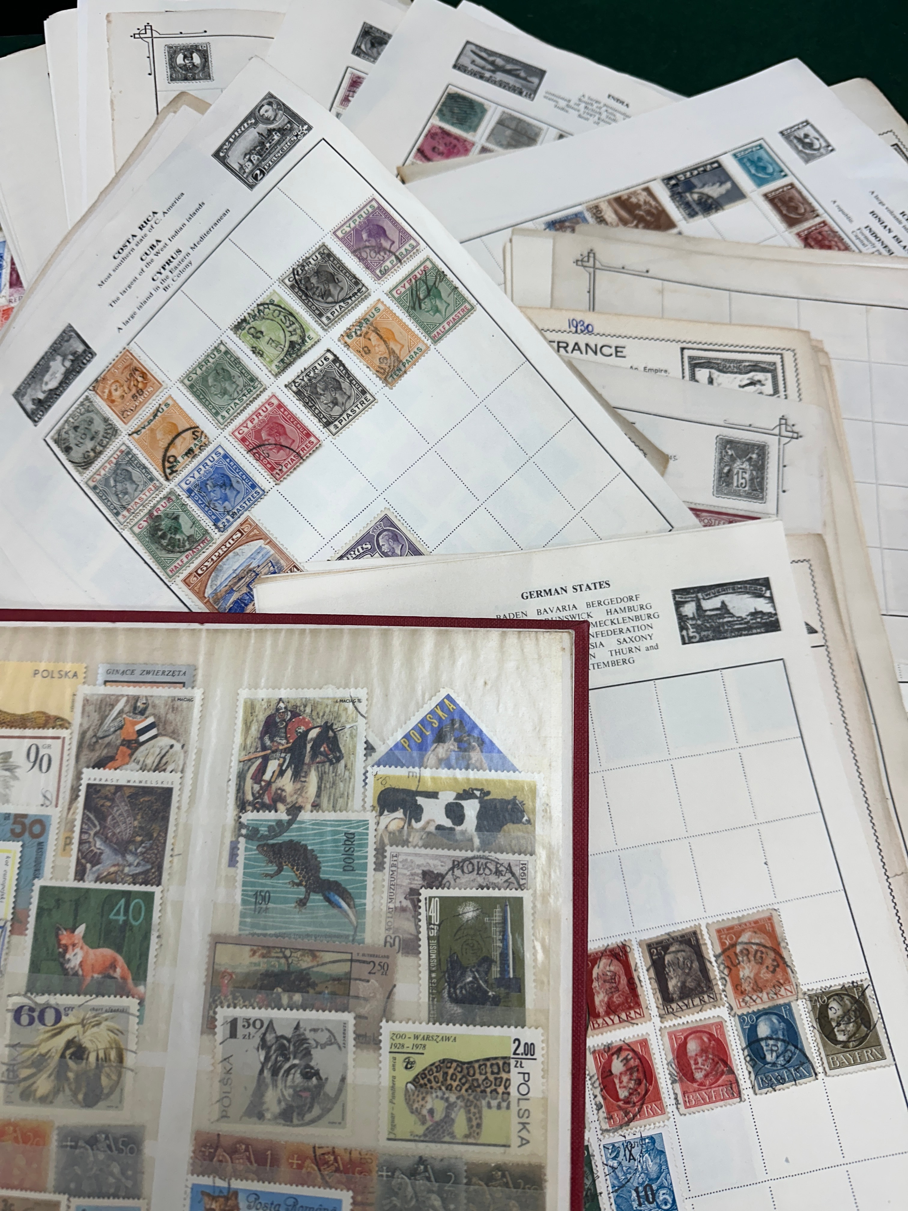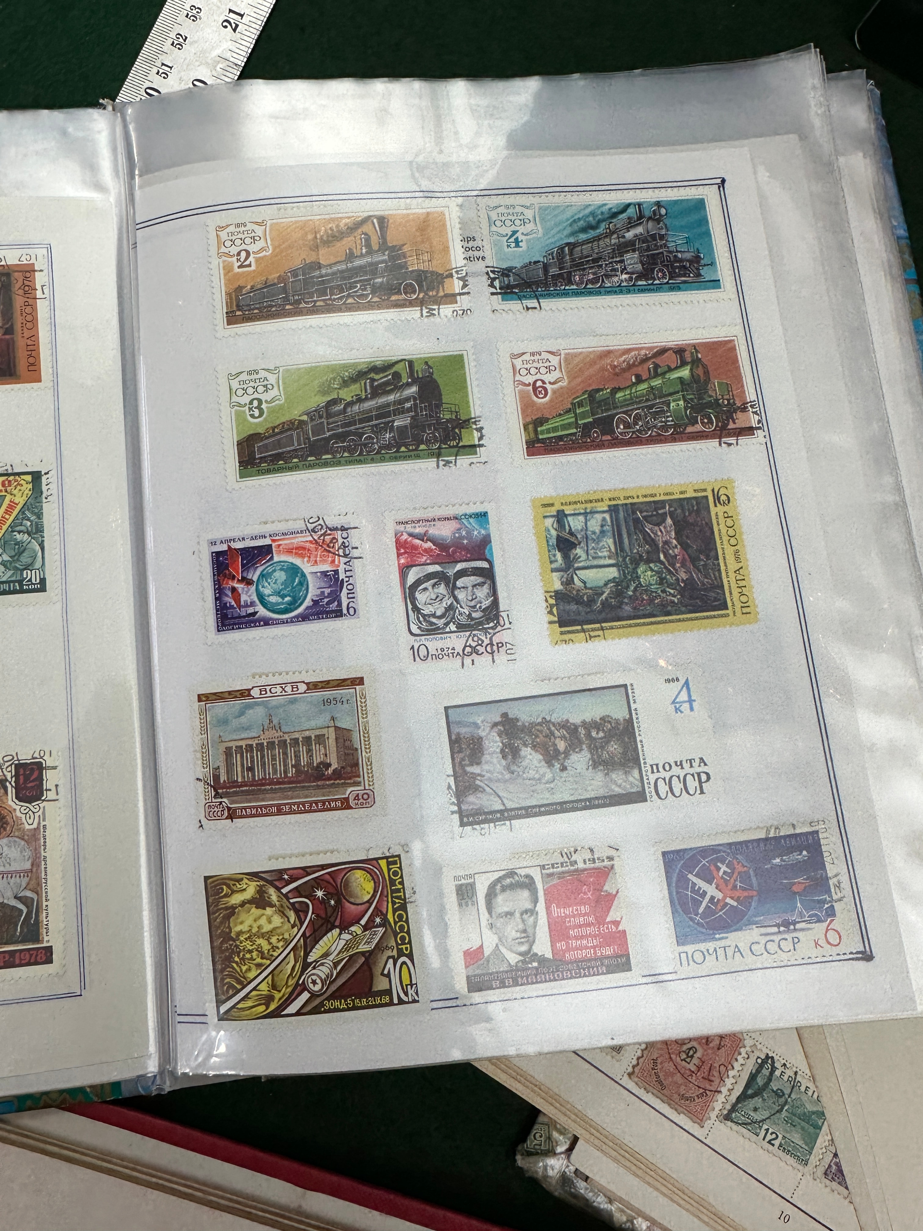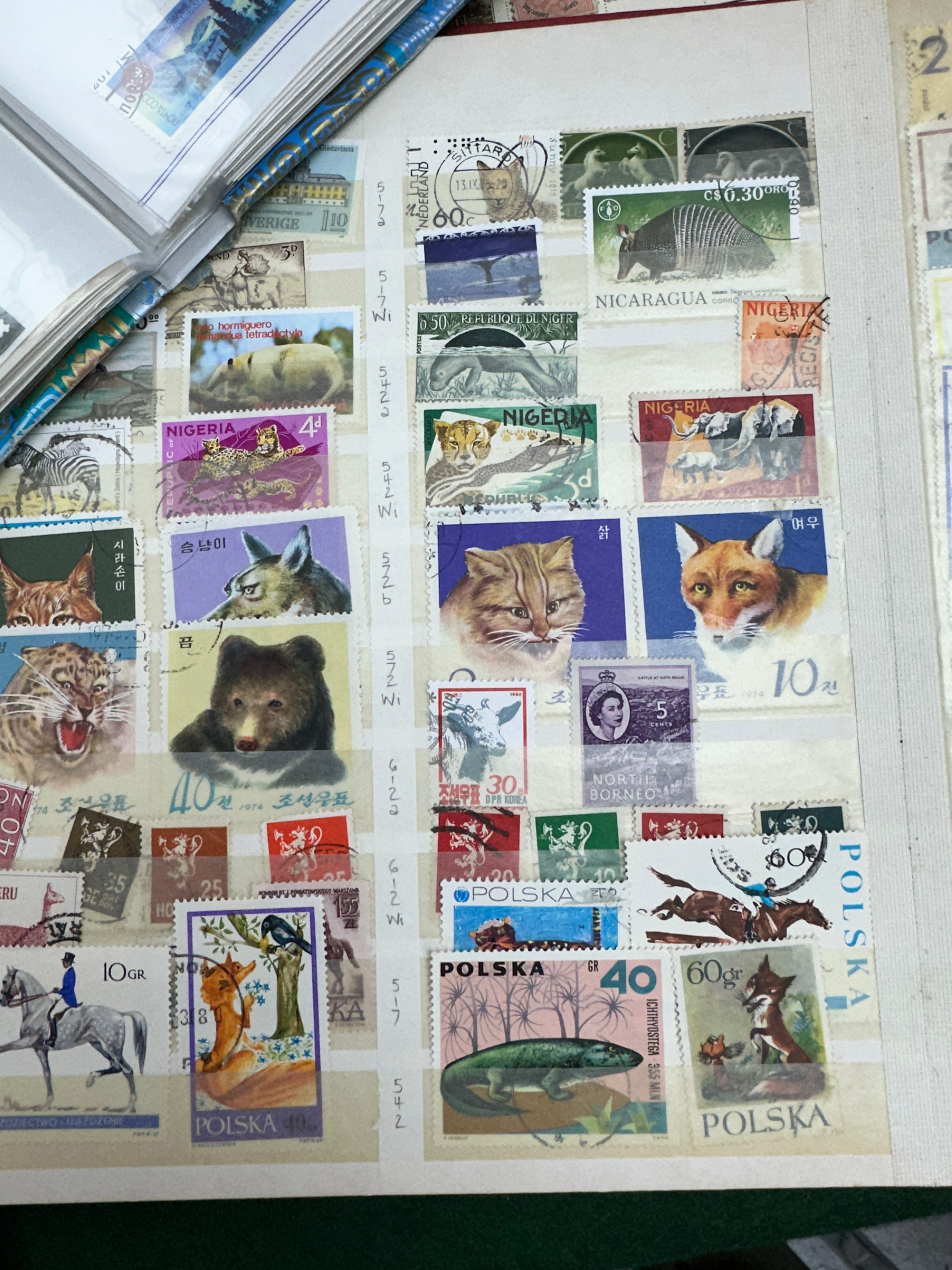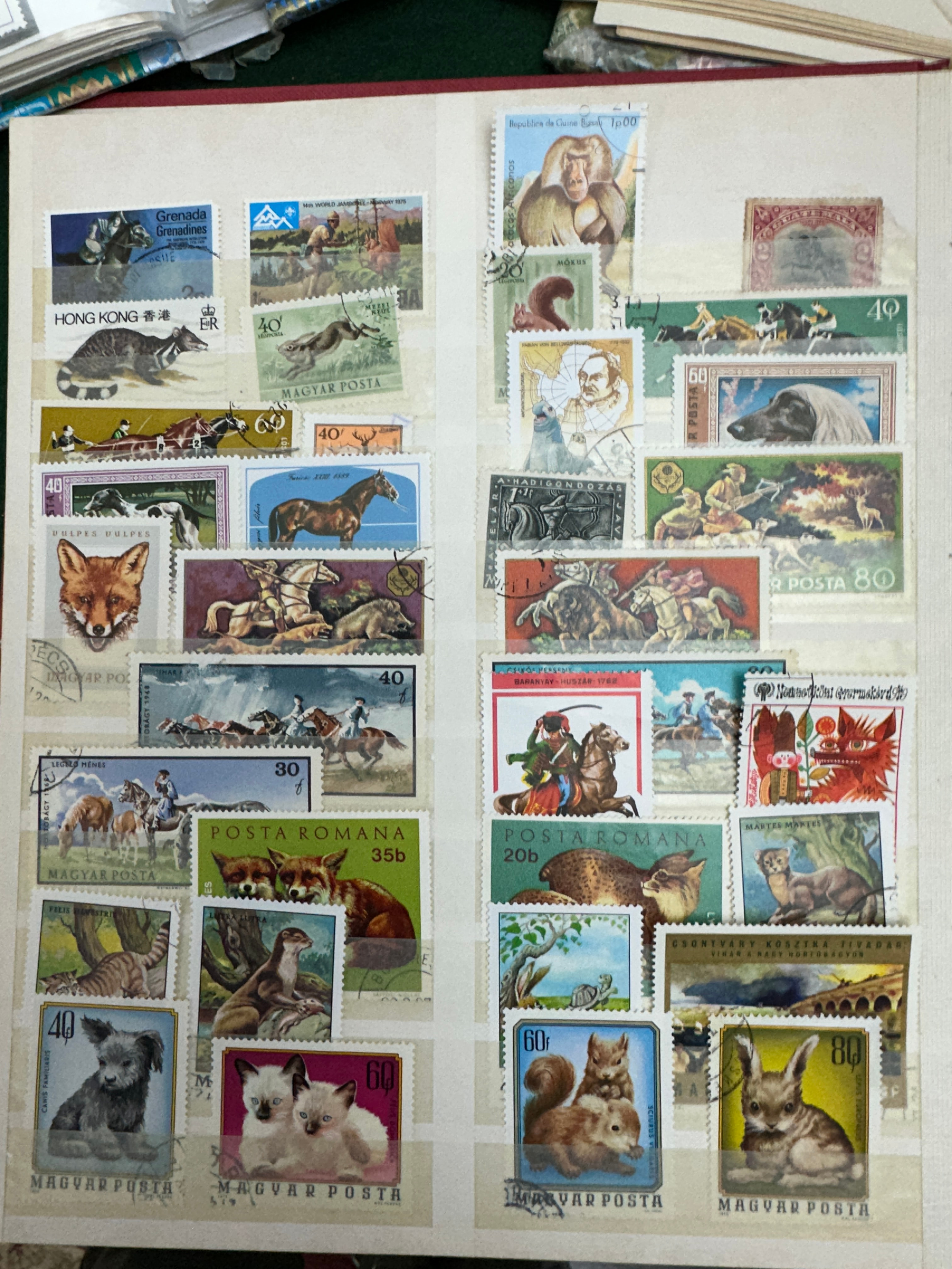 This substantial collection comprises international postage stamps primarily dating from the mid to late 20th century, with visible issue years including 1954, 1955, 1974, 1977, 1978, and 1979. The stamps are presented in various formats, including a plastic-sleeved album, loose stock sheets, and individual album pages. Identified countries and postal entities include Poland (Polska), France, German States, Hungary (Magyar Posta), Romania (Posta Romana), Republic of Cuba, USSR (Почта СССР), Costa Rica, Nicaragua, Hong Kong, Nigeria, North Borneo, and Sweden. The visible designs feature a diverse range of subjects such as various animals (mammals, birds, reptiles), historical figures, architecture, transportation (trains, ships), and commemorative events.
