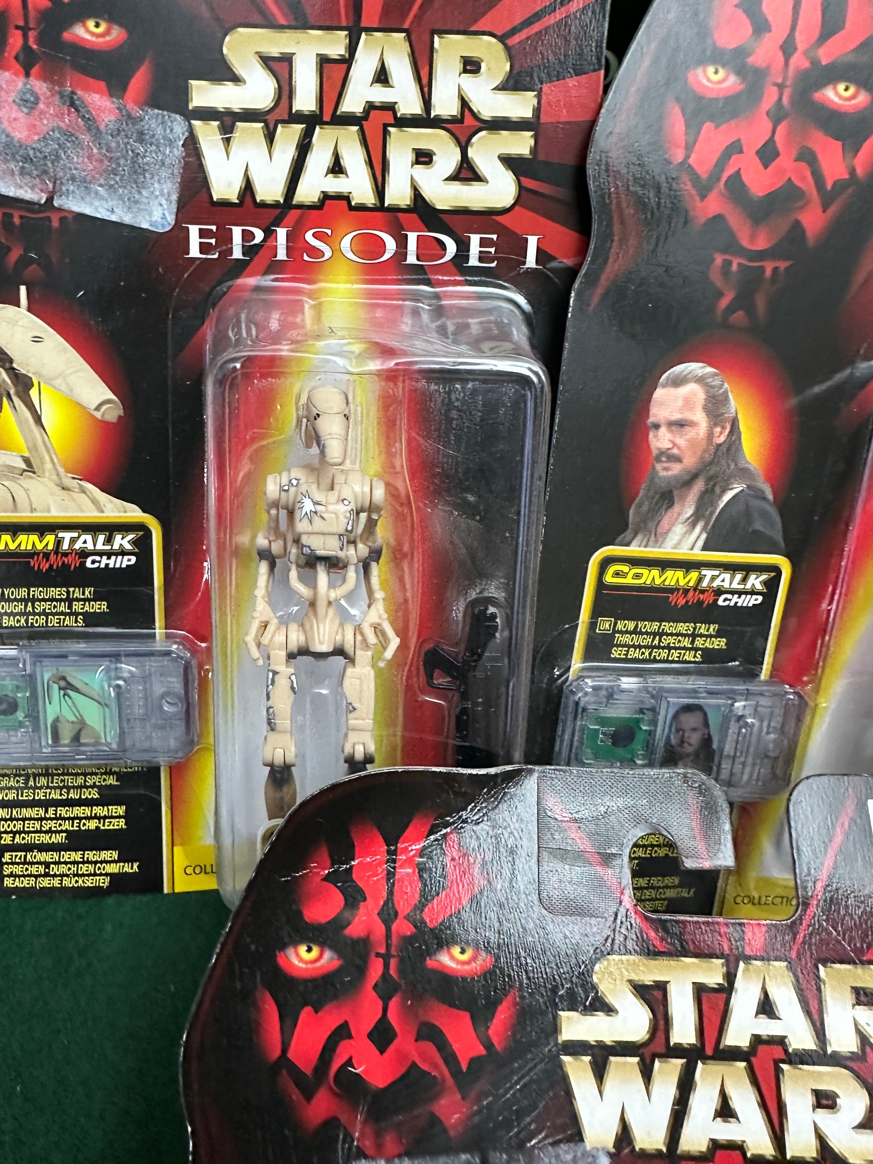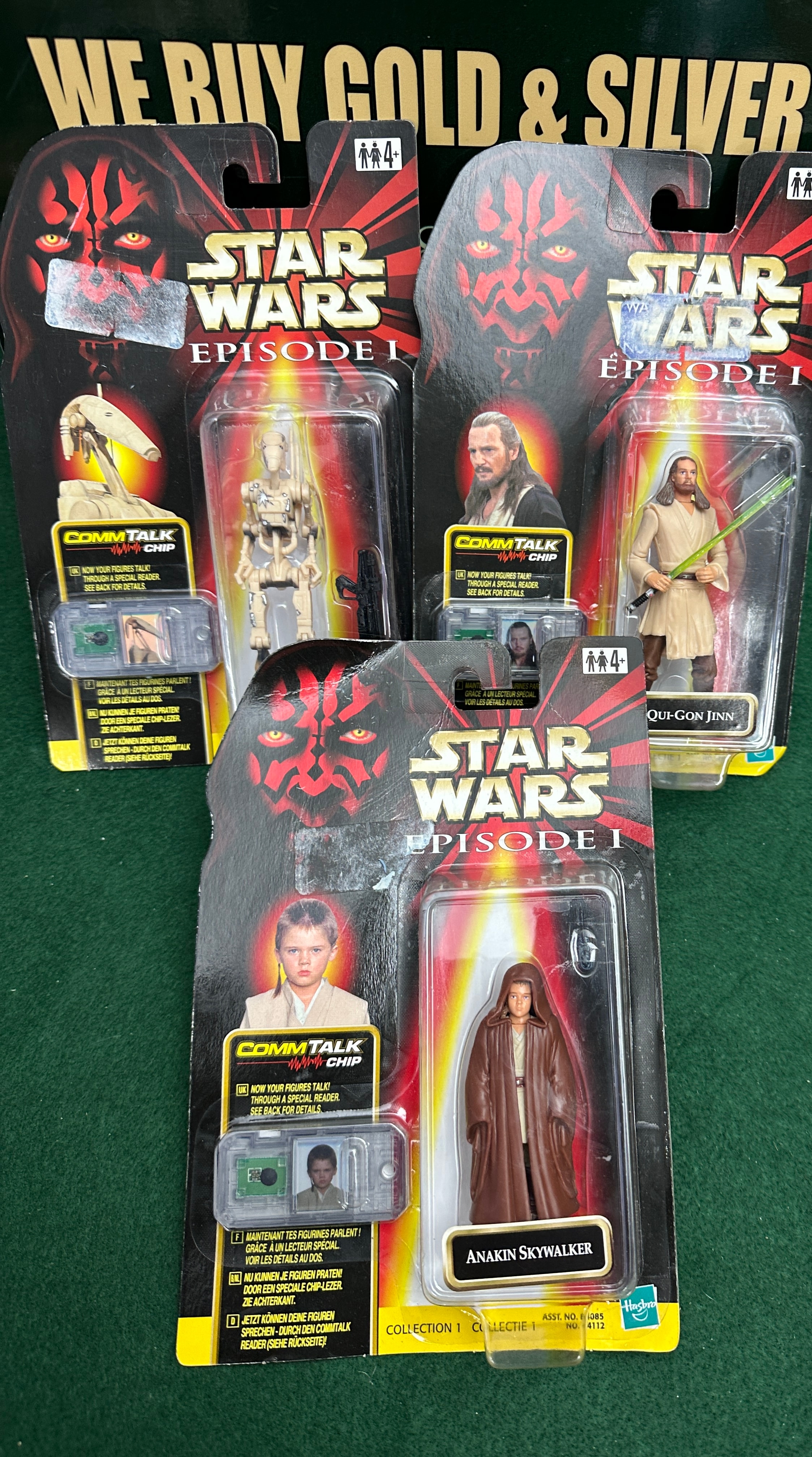 A group of three Hasbro Star Wars Episode I CommTalk Chip action figures, released circa 1999 in conjunction with ‘The Phantom Menace.’ Each figure is presented in New Old Stock (NOS) condition, sealed within its original carded blister packaging. The lot includes a Battle Droid, Qui-Gon Jinn, and Anakin Skywalker, each accompanied by visible accessories. The cardboard backing prominently features ‘STAR WARS EPISODE I,’ a ‘COMMTALK CHIP’ feature banner with multilingual instructions, a ‘4+’ age rating, and the ‘HASBRO’ manufacturer logo, alongside a 1998 Lucasfilm copyright. The ‘COMMTALK CHIP’ banner states: ‘NOW YOUR FIGURES TALK! THROUGH A SPECIAL READER. SEE BACK FOR DETAILS.’