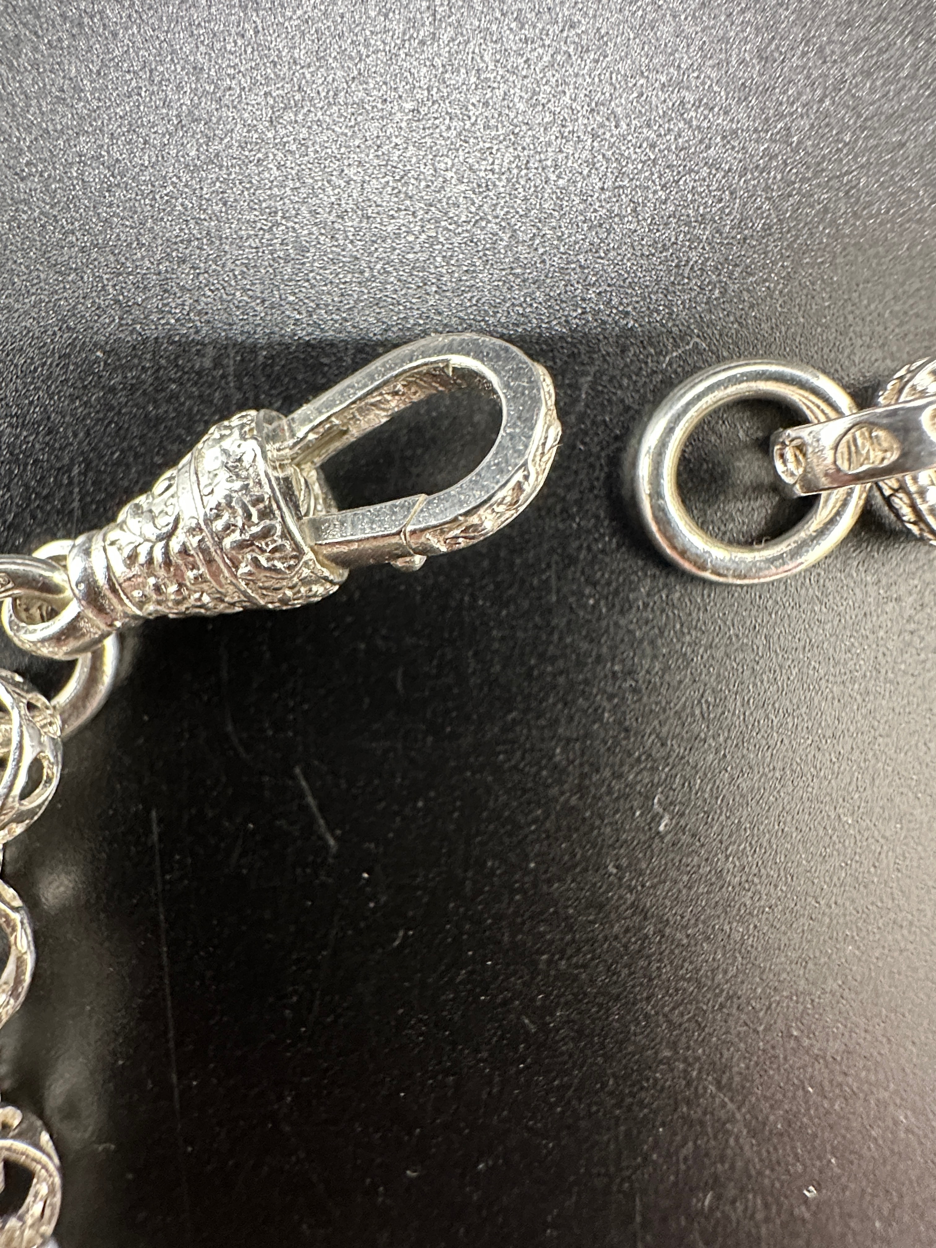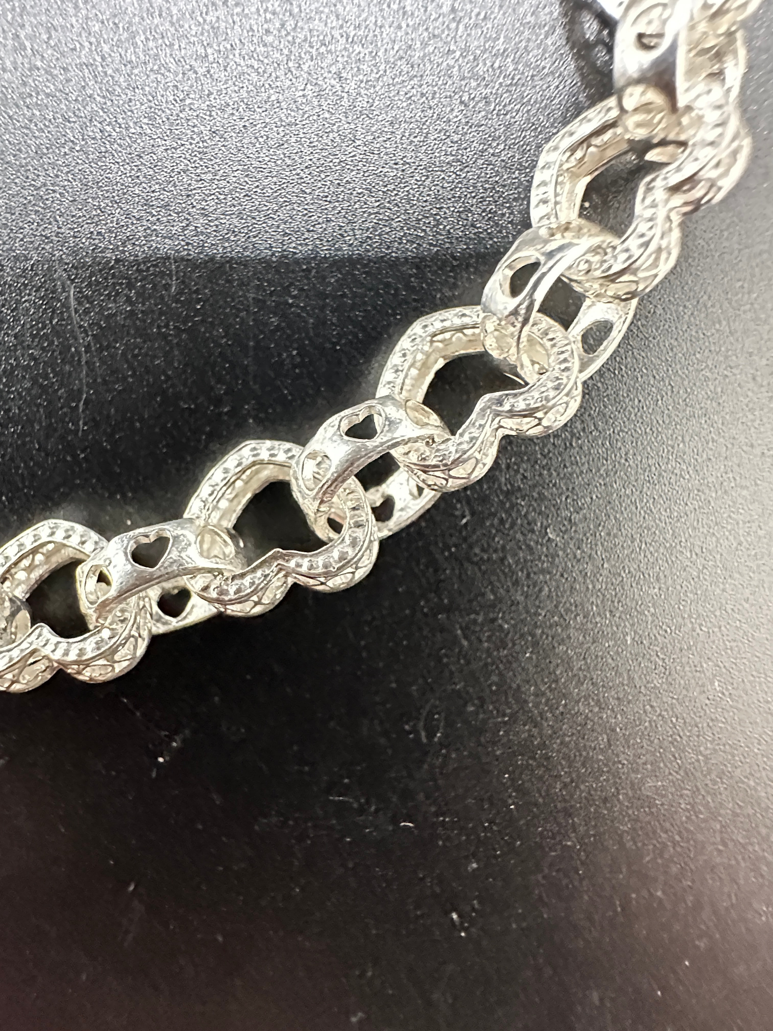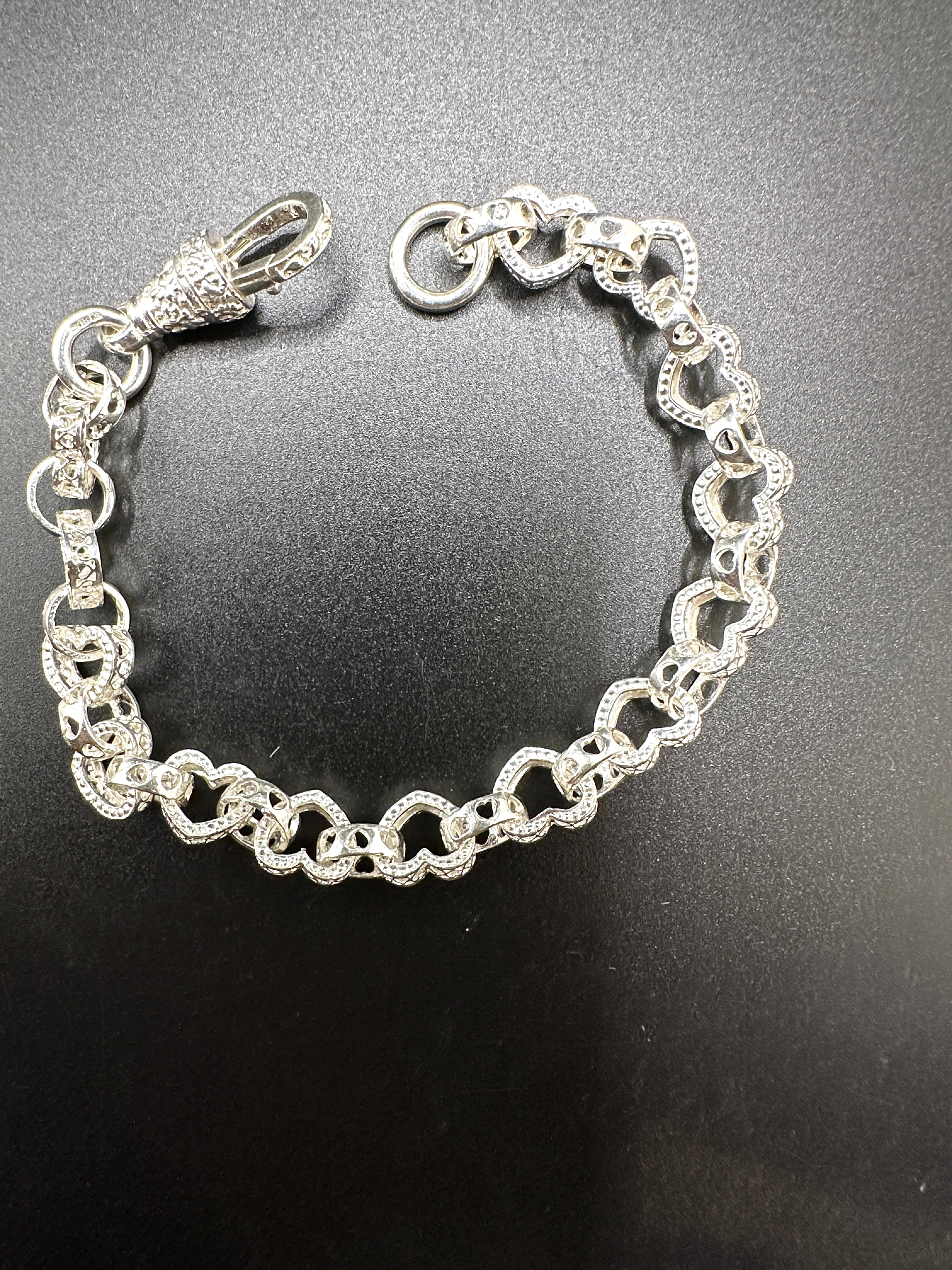 A sterling silver link bracelet featuring a series of interlocking, openwork links, each formed from two stylized heart shapes. The links are detailed with textured or granulated edges. The bracelet is secured by an ornate swivel lobster claw clasp, which is decorated with an intricate, possibly filigree or repoussé-style pattern on its barrel, connecting to a simple jump ring. This design is characteristic of contemporary sterling silver jewelry.