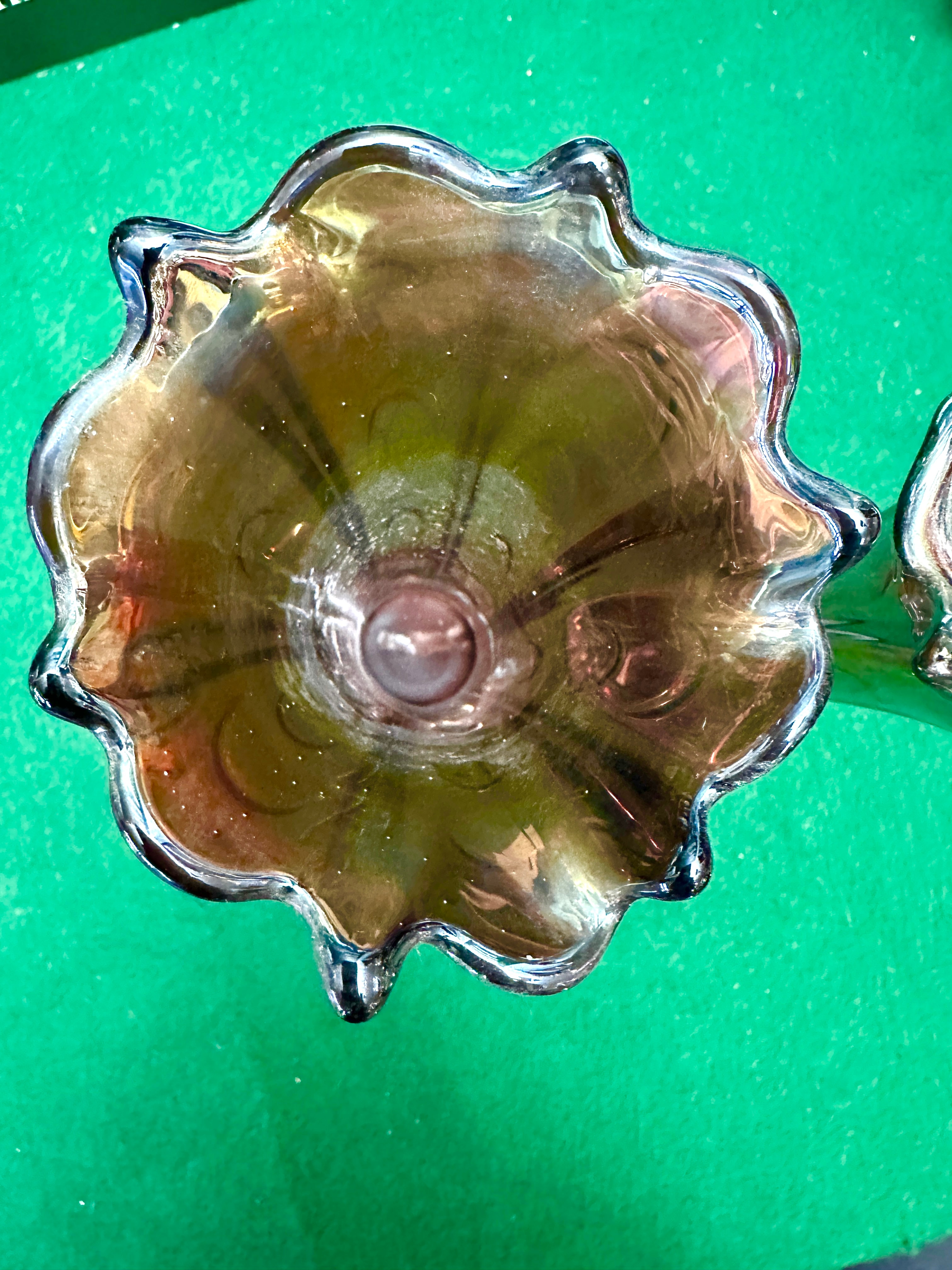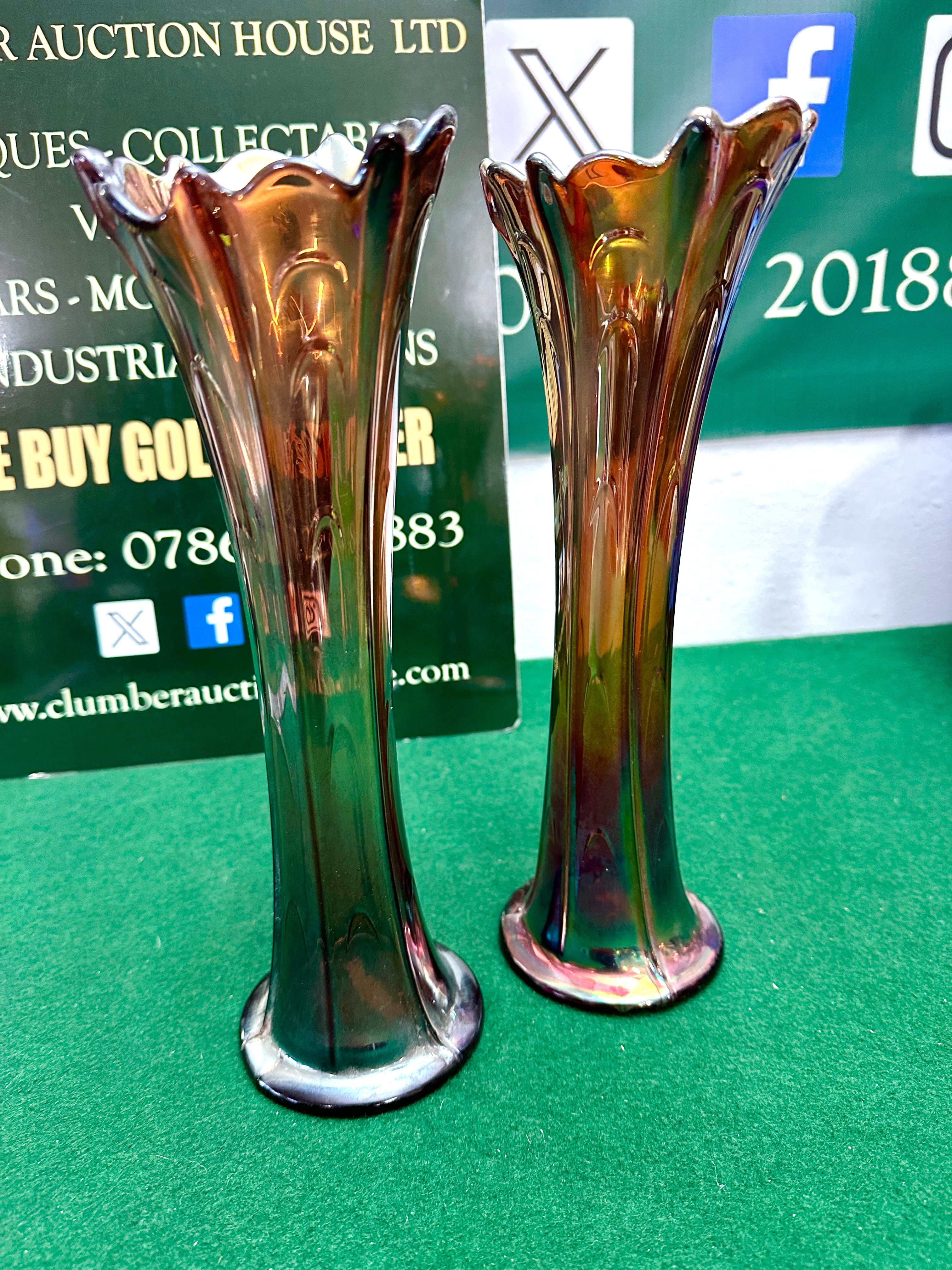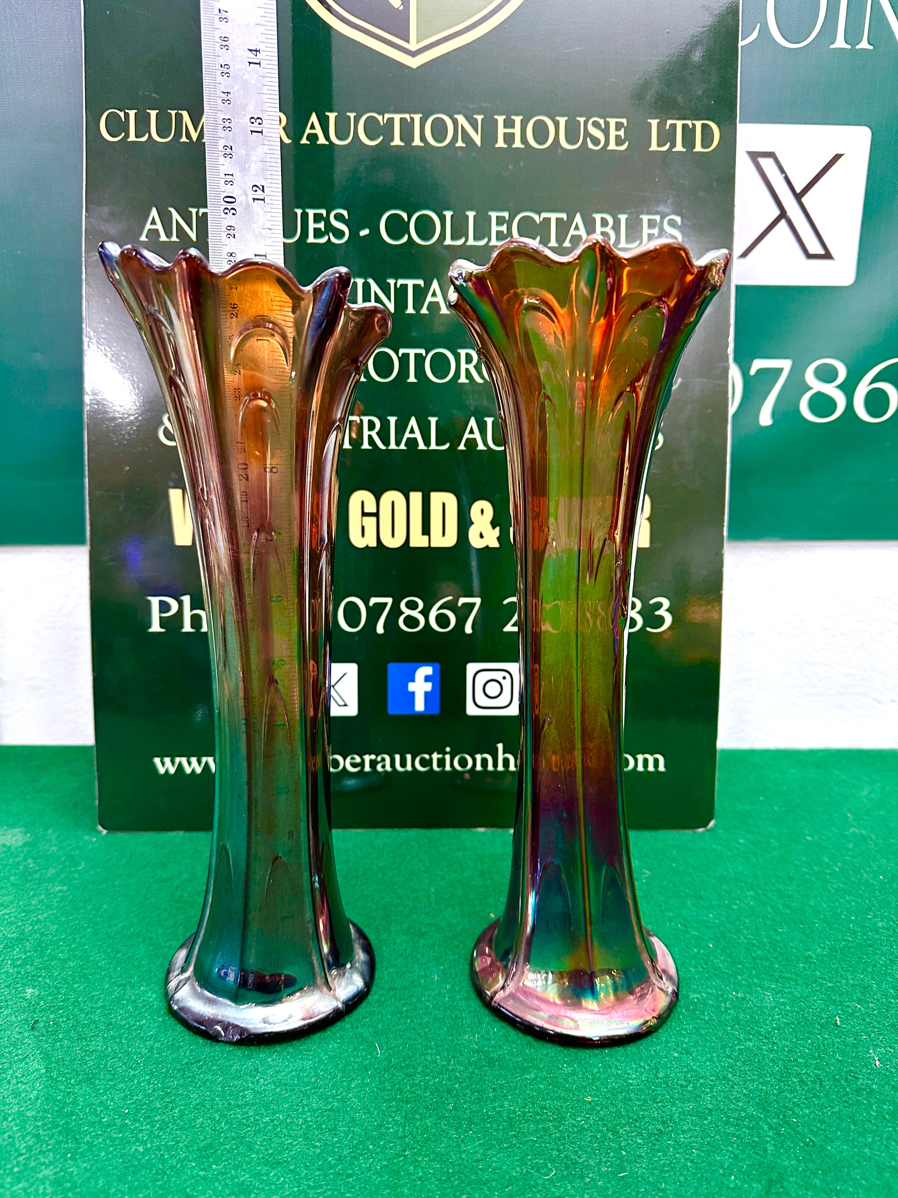 A pair of Fenton Carnival Glass vases, each featuring a flared, scalloped, or ruffled rim and a trumpet-shaped body that gradually widens towards a circular foot. The glass exhibits a multi-tonal, shimmering iridescence, displaying hues of amber, green, purple, and gold. The base of at least one vase is detailed with a molded starburst pattern.