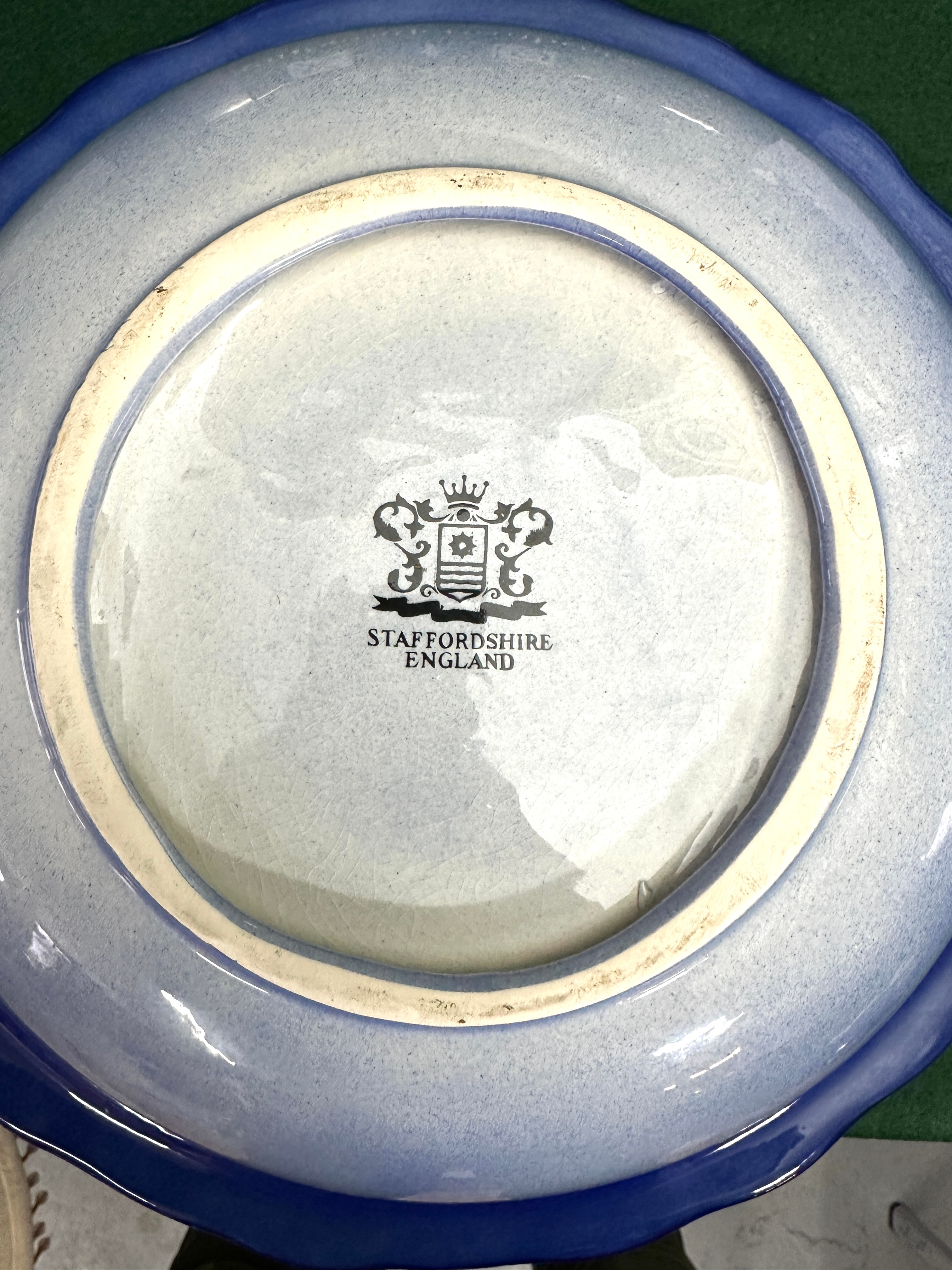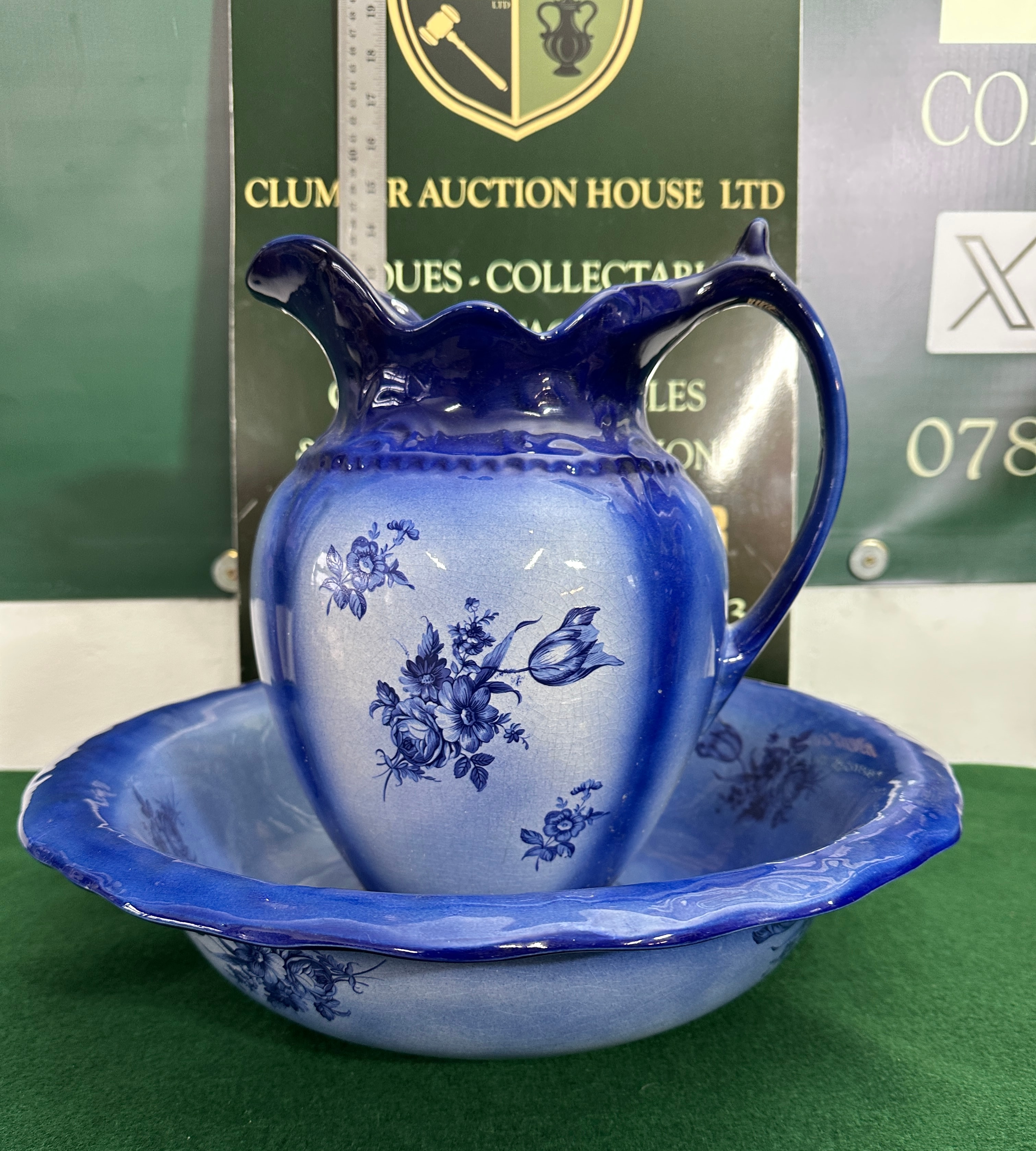 A two-piece ceramic washbasin set, identified as Empress Ironstone Staffordshire. The set comprises a pitcher with a scalloped rim and a matching fluted basin. Both items feature a distinctive cobalt blue and white ombré glaze, transitioning from dark blue to lighter tones, adorned with blue floral transferware designs depicting roses, tulips, and other blossoms. The bases of both pieces bear a black printed maker’s mark: a crest featuring a crown and shield above the text “STAFFORDSHIRE ENGLAND.”