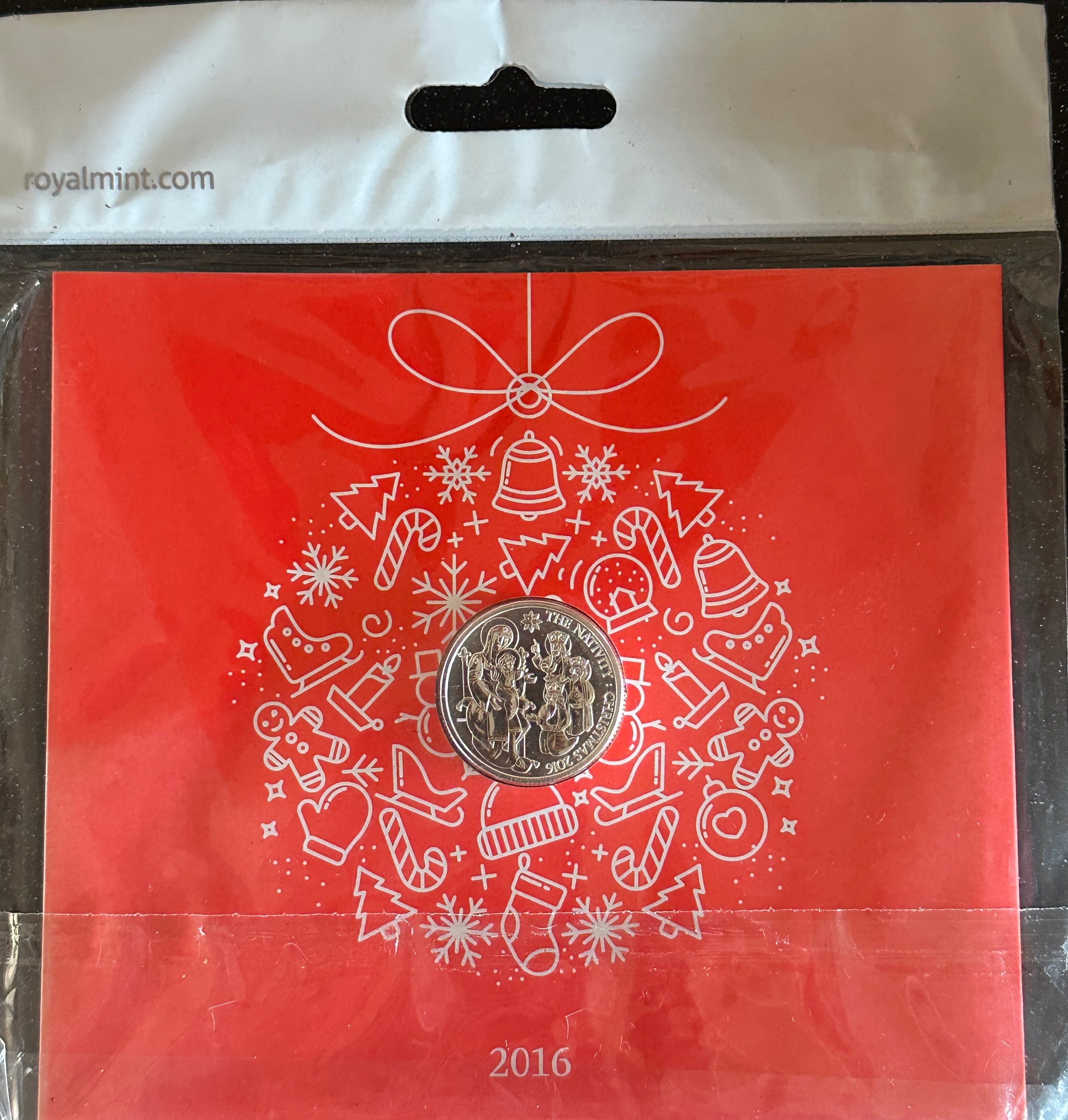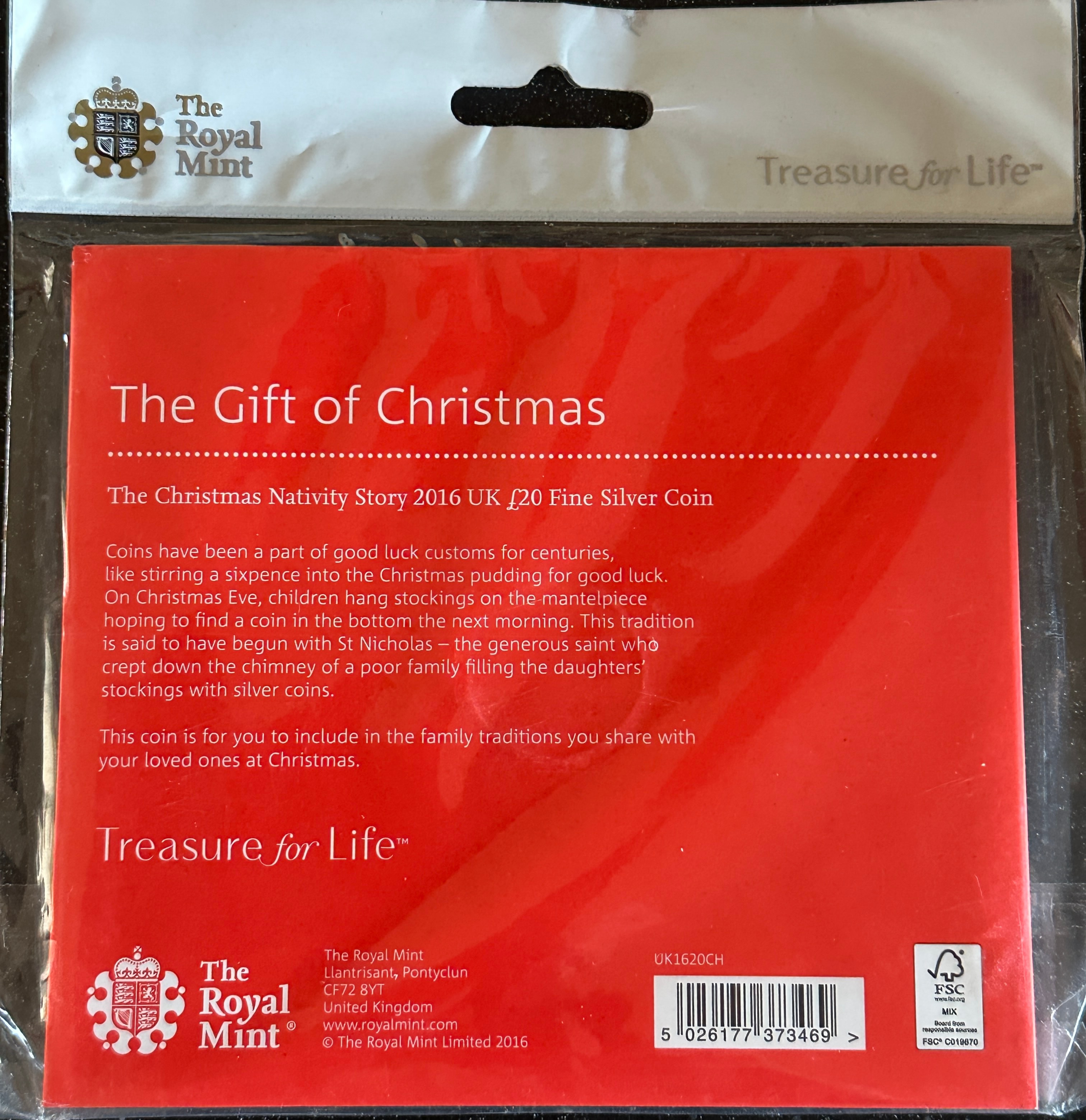 A modern, uncirculated commemorative coin set by The Royal Mint, titled ‘The Christmas Nativity Story’ from 2016. The set comprises a silver-colored £20 Fine Silver Coin, presented in its original sealed retail packaging. The coin is mounted within a festive red card featuring white line art depicting a large Christmas bauble with various holiday motifs and the year “2016”. The coin itself depicts “THE NATIVITY” scene with three figures and is inscribed “CHRISTMAS 2016”. The item is protected by a clear plastic sleeve with a white header. The reverse of the packaging details the item as “The Christmas Nativity Story 2016 UK £20 Fine Silver Coin” under the title “The Gift of Christmas,” complete with descriptive text, “The Royal Mint” branding, copyright information “© The Royal Mint Limited 2016,” a product code (UK1620CH), and a barcode.