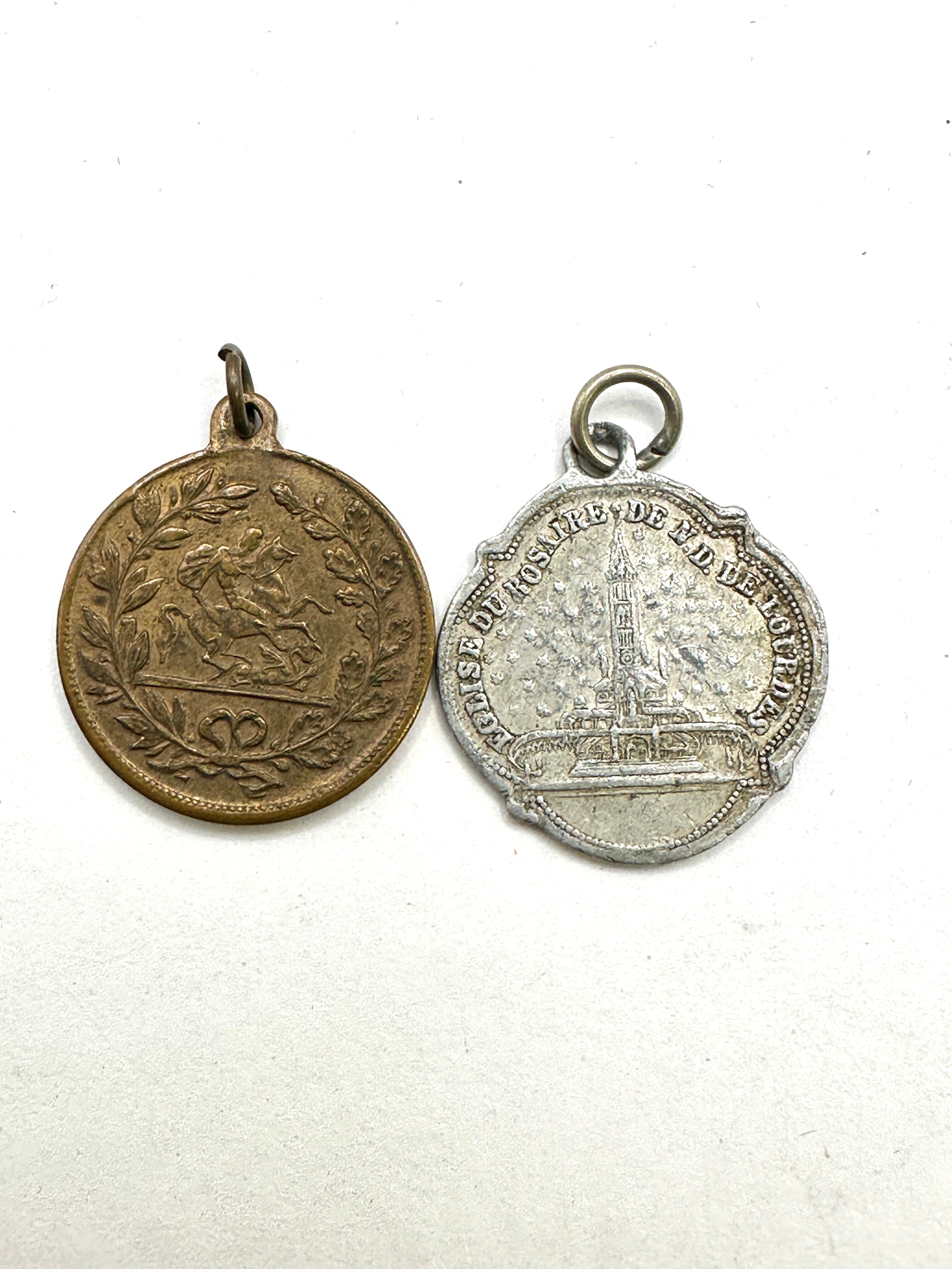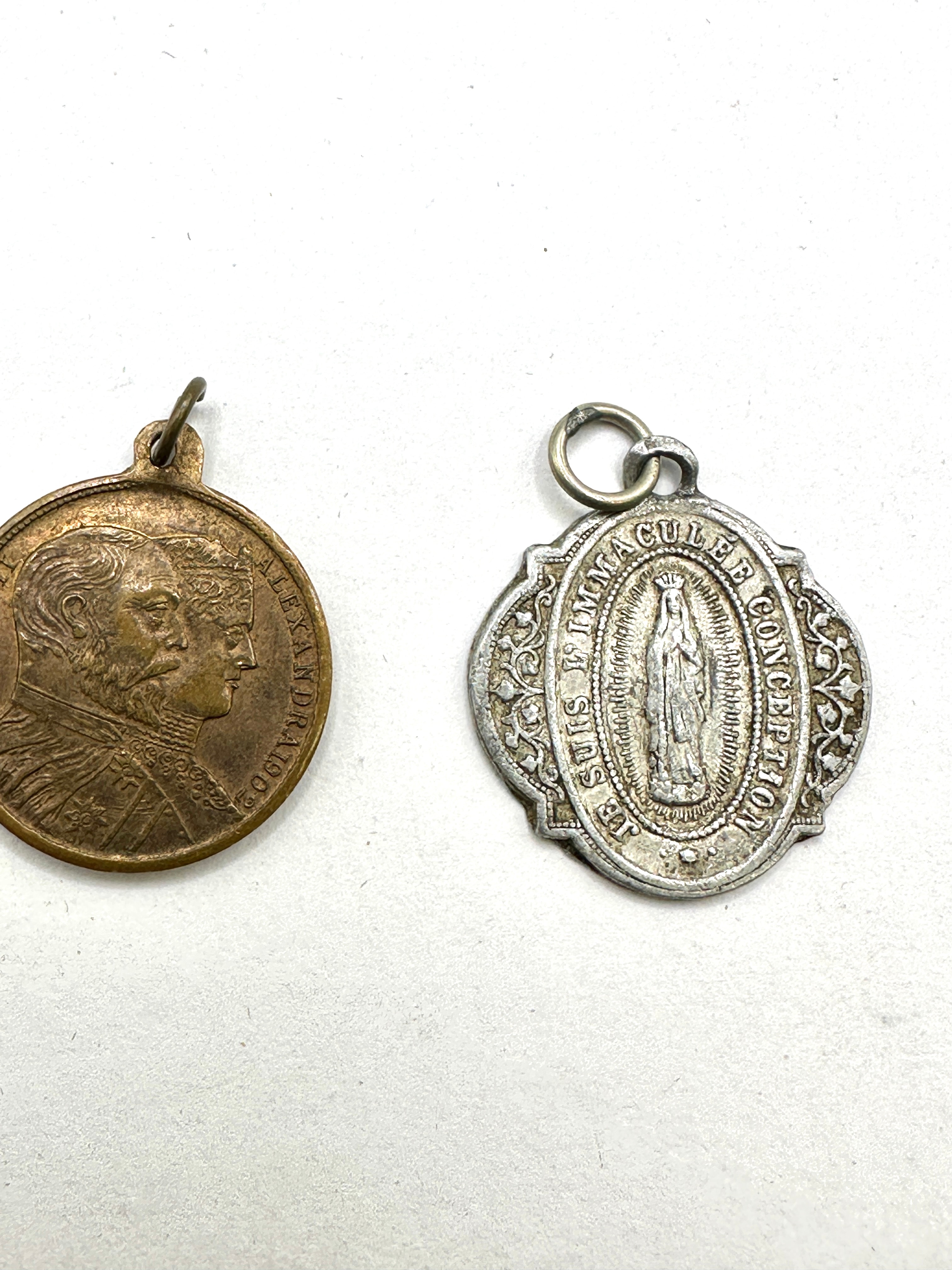 Also included is a circular bronze-toned medal. Its obverse displays two male busts in profile, one appearing older and bearded, the other younger, with partially legible text “ALEXANDROS” and “ET”. The reverse depicts a figure on horseback, possibly St. George, within a laurel wreath, above a stylized “2”.