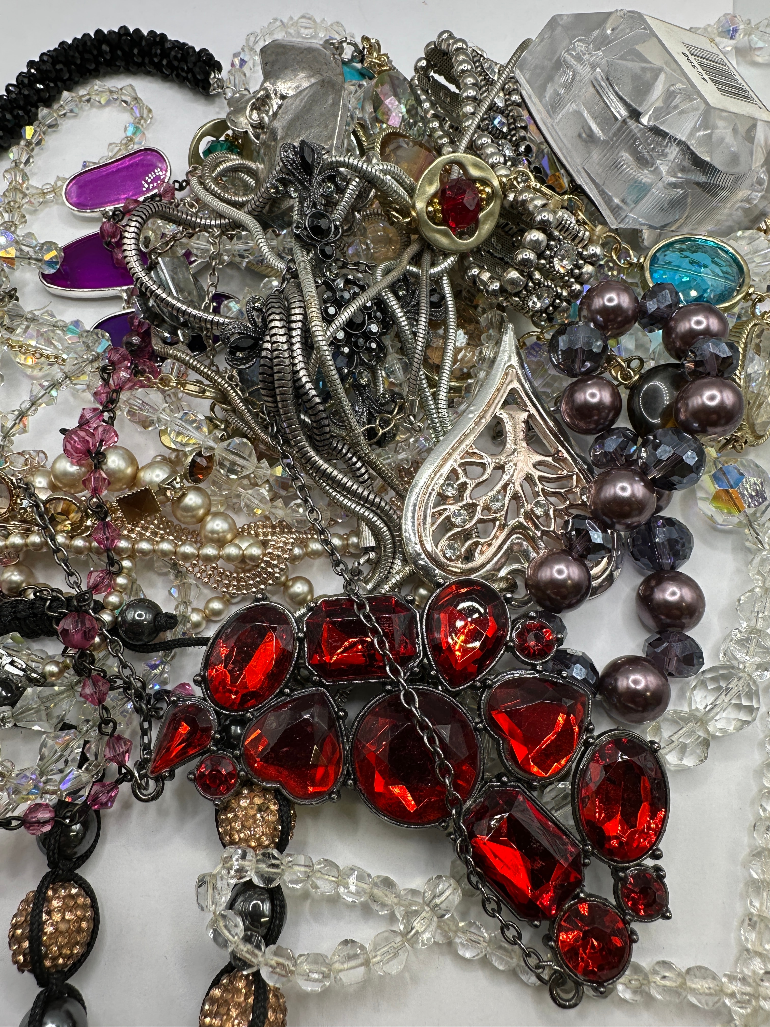 A substantial quantity of assorted costume jewelry, predominantly comprising necklaces and bracelets, in a diverse range of styles and materials. Visible materials include various base metals (silver-tone and gold-tone), numerous types of beads such as clear faceted glass or plastic, opaque colored beads (purple, grey, black), faux pearls, and black seed beads. Many pieces incorporate colored glass stones or rhinestones in hues of red, pink, purple, and blue, highlighted by a prominent item featuring large faceted red ‘gems’ in a silver-tone setting and a large silver-tone openwork heart pendant with a tree motif. The collection appears to encompass items from various periods, from vintage to more contemporary designs. A clear plastic container with a white barcode label displaying the number “89046” is also observed within the accumulation.