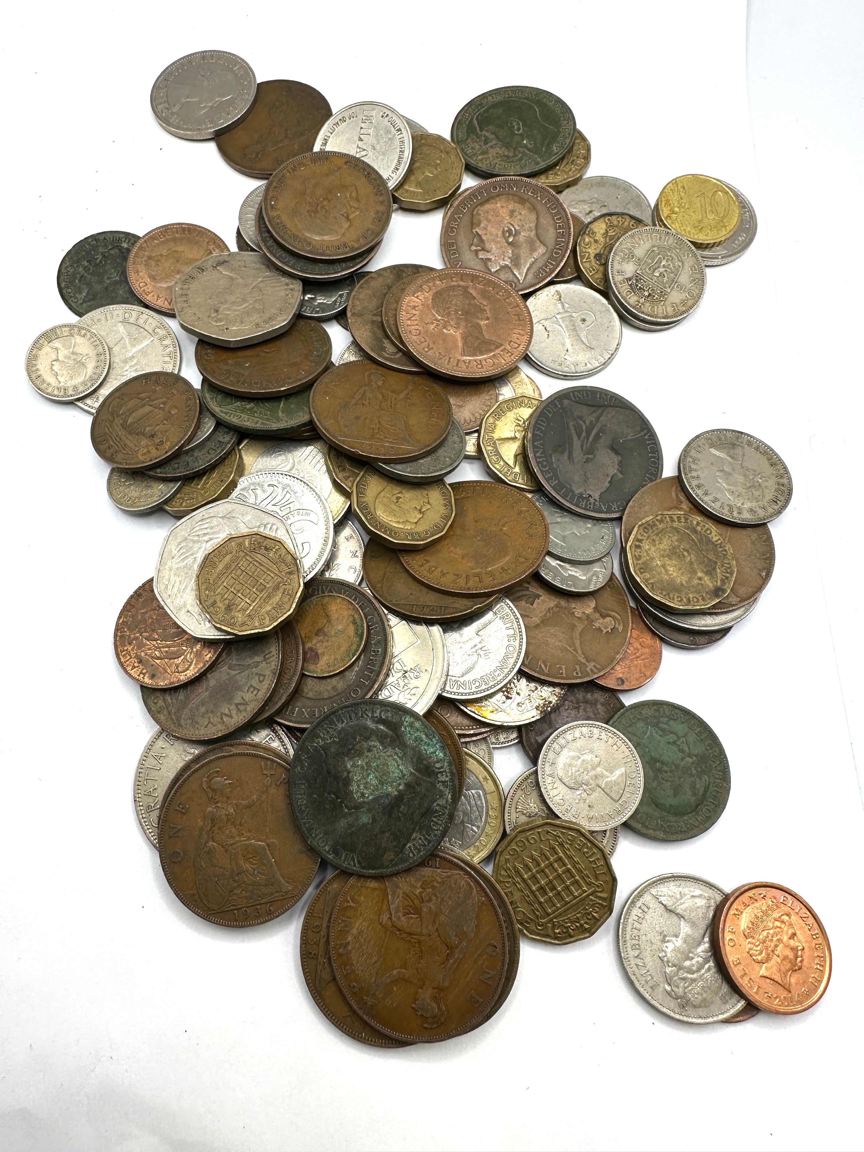 This lot comprises a large collection of assorted coins, predominantly British coinage, contained within and spilling from a small, greyish-brown fabric drawstring pouch. The coins vary significantly in size, denomination, and metallic composition, featuring both copper/bronze and silver-toned alloys. Observable dates range from the early 20th century (e.g., 1921, 1936) through to the early 21st century (e.g., a 2001 Euro cent). Visible inscriptions include “ONE PENNY,” “PENNY,” portraits of “ELIZABETH II” and “GEORGIVS V D G BRITT OMN REX F D IND IMP” (George V, by the Grace of God, King of all Britons, Defender of the Faith, Emperor of India), and “10 EURO CENT”.