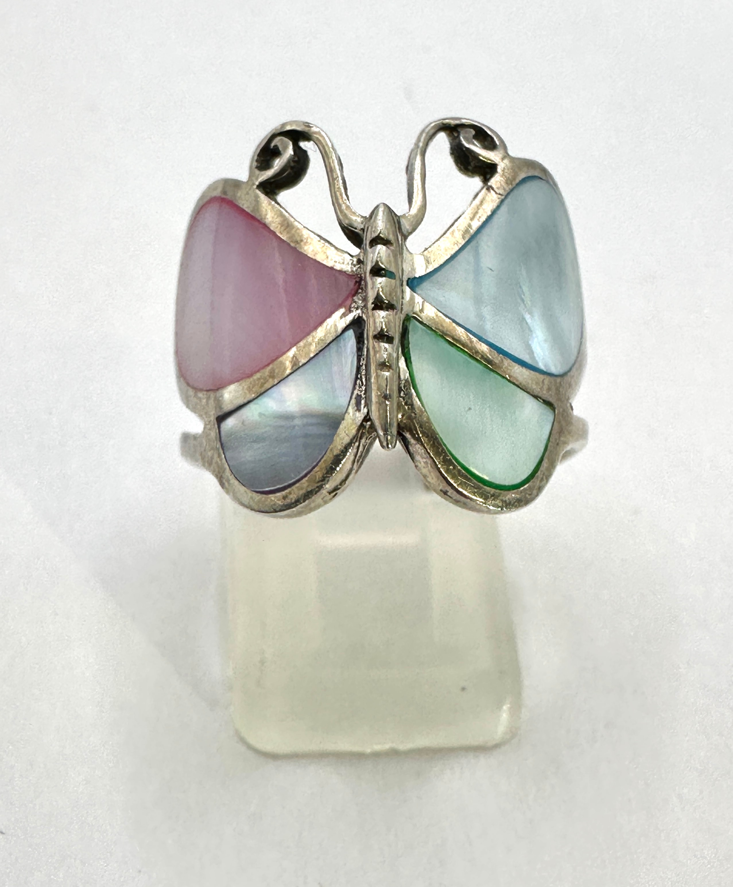 A ring crafted from 925 silver, featuring a butterfly motif. The wings are adorned with four distinct, iridescent shell inlays: one pink, one pale blue, one light green, and one natural pearlescent white/grey. No specific metal hallmarks or maker’s marks are visible on the ring itself.