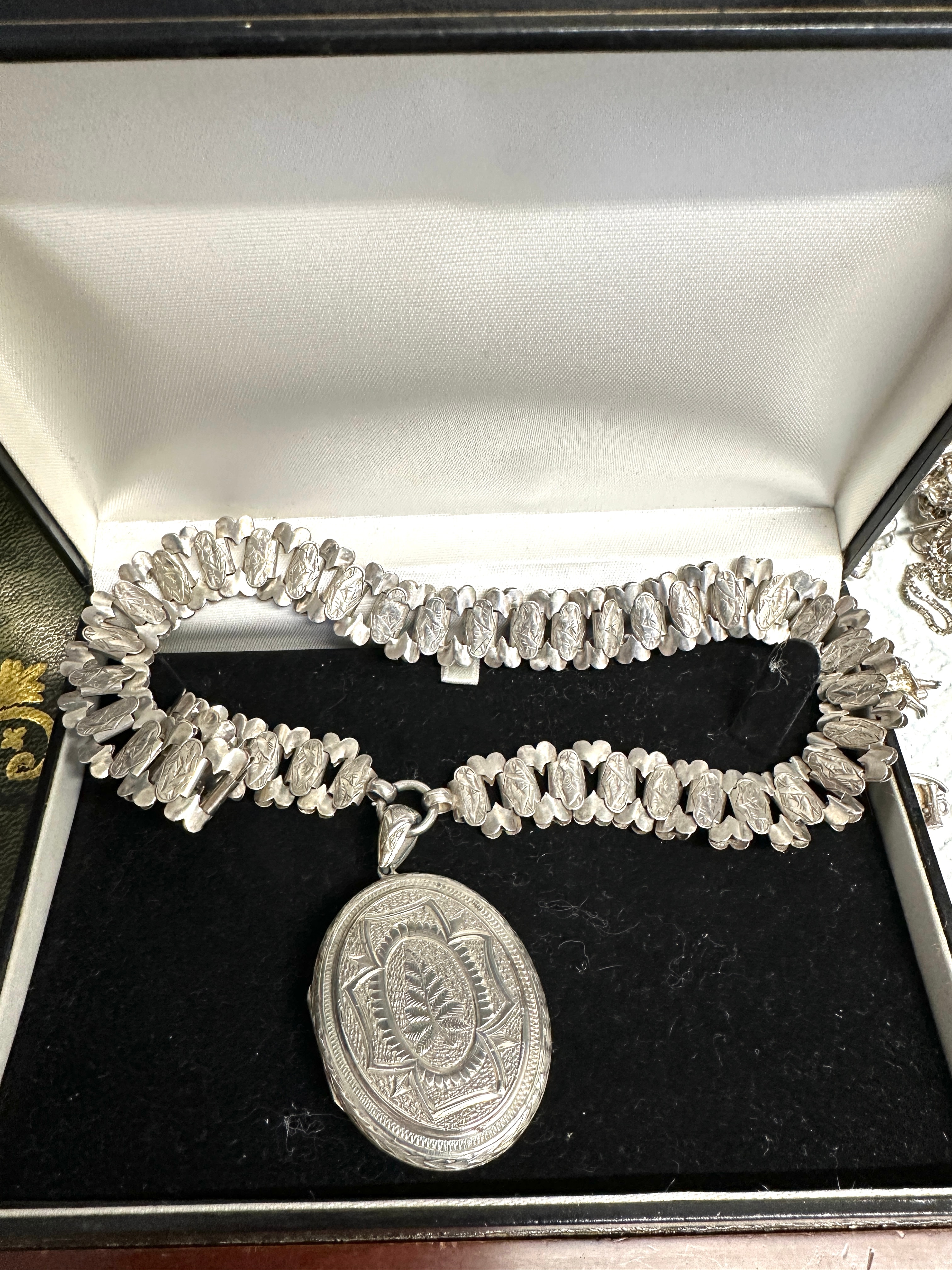 A 925 silver Hip Hop Santa Barbara pendant necklace, featuring an ornate design. The chain is composed of numerous individual, textured, leaf-shaped links forming a substantial, flexible band. A large, circular pendant is centrally suspended, adorned with intricate, engraved geometric and stylized foliate patterns, including a prominent central motif resembling a leaf or feather within decorative borders. No distinct maker’s marks or textual engravings are visible.