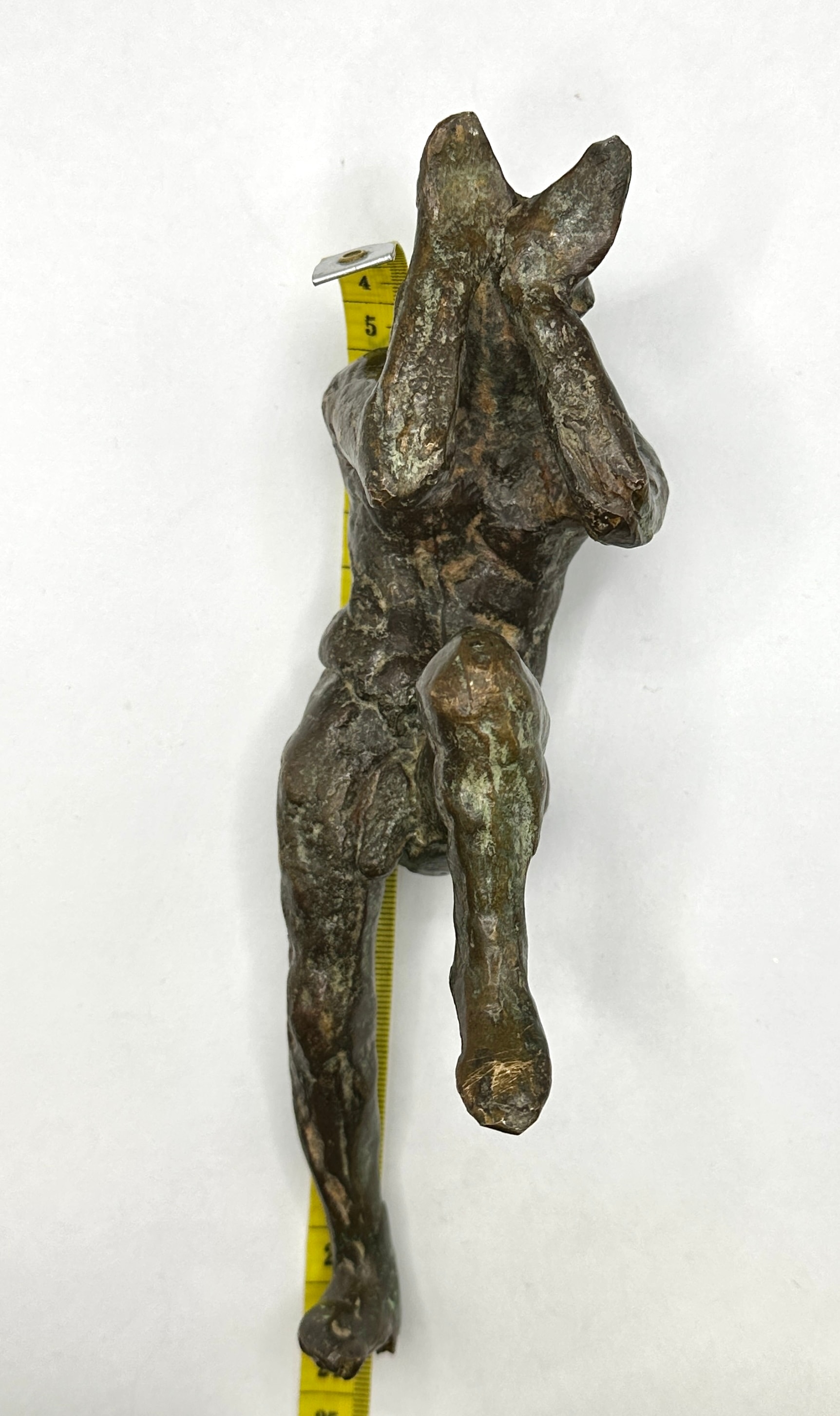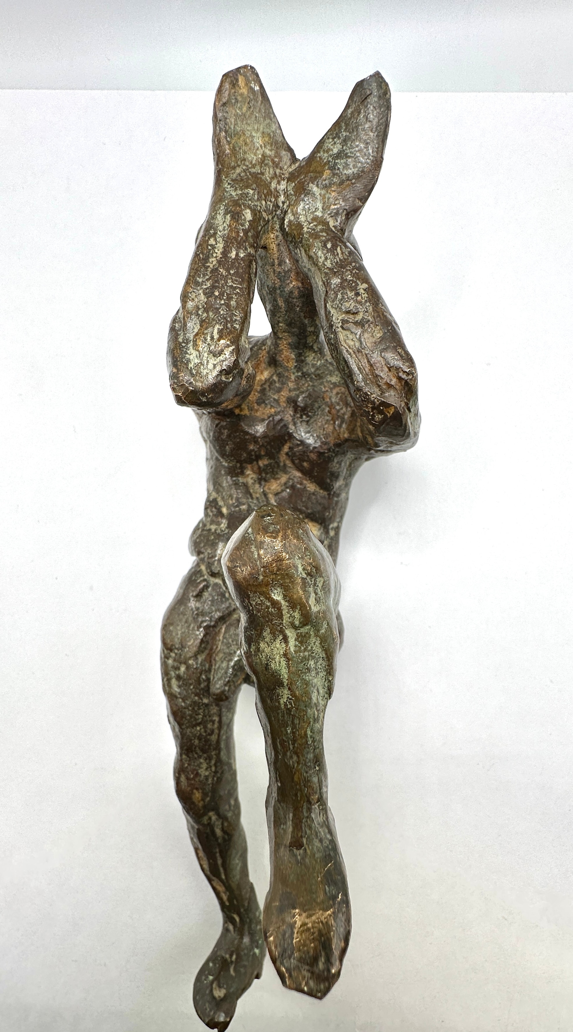 A small, modern abstract bronze sculpture depicting an abstracted human figure. The figure is rendered in a dynamic, possibly struggling or shielding pose, with both arms raised towards the head. The surface is heavily textured and exhibits a varied dark brown and greenish-blue patination. No artist’s signatures or identifying markings are visible on the sculpture.
