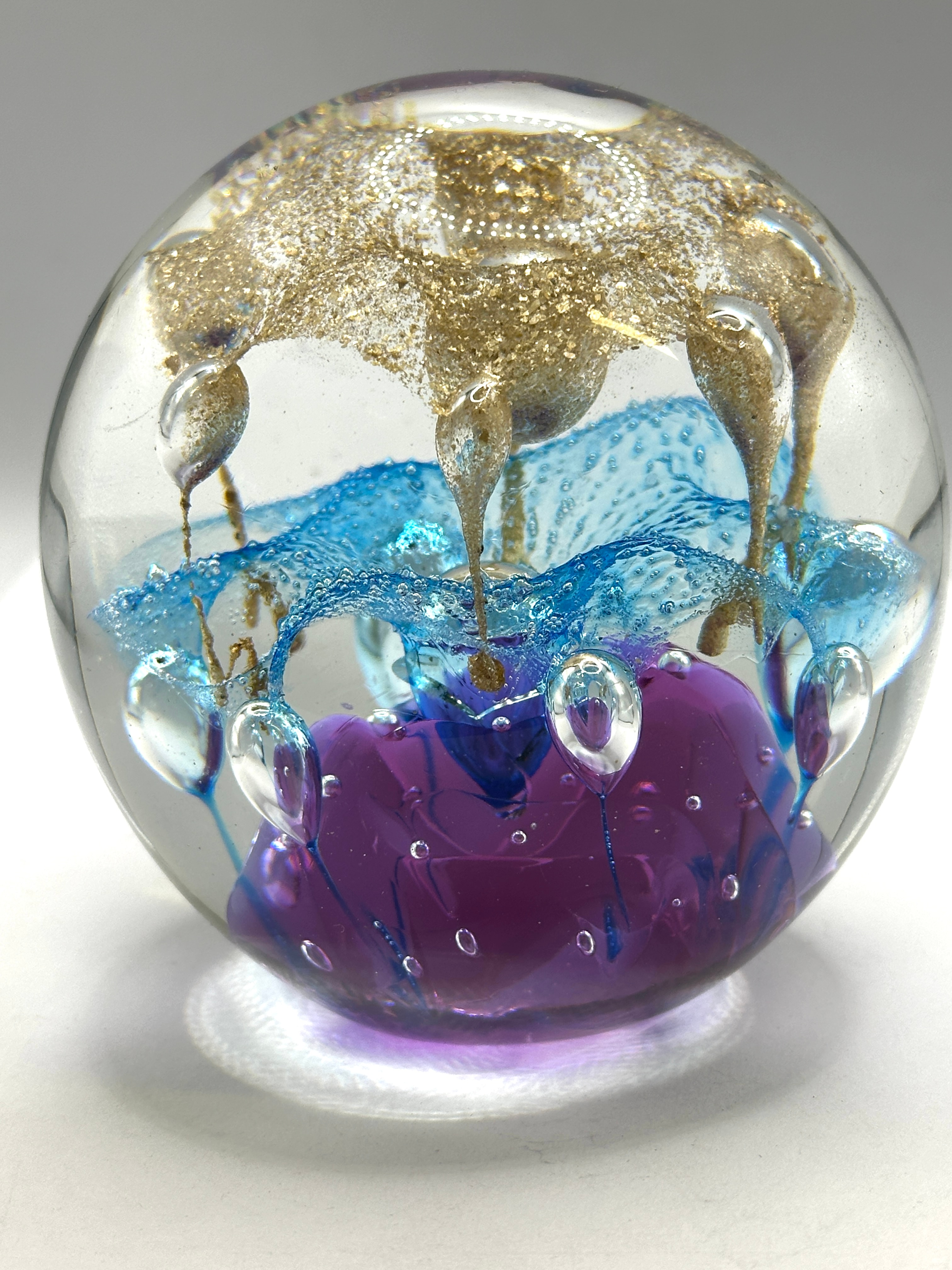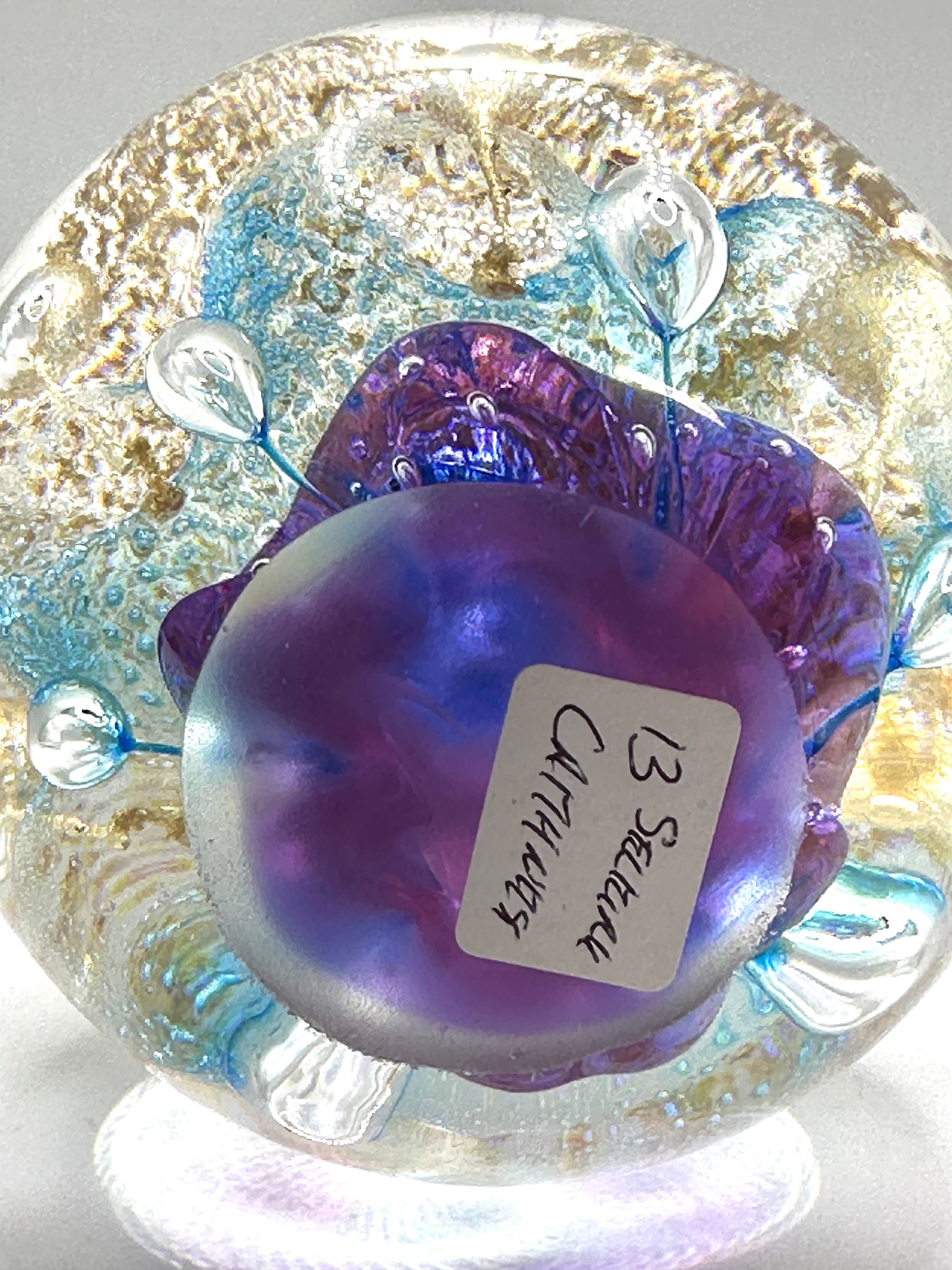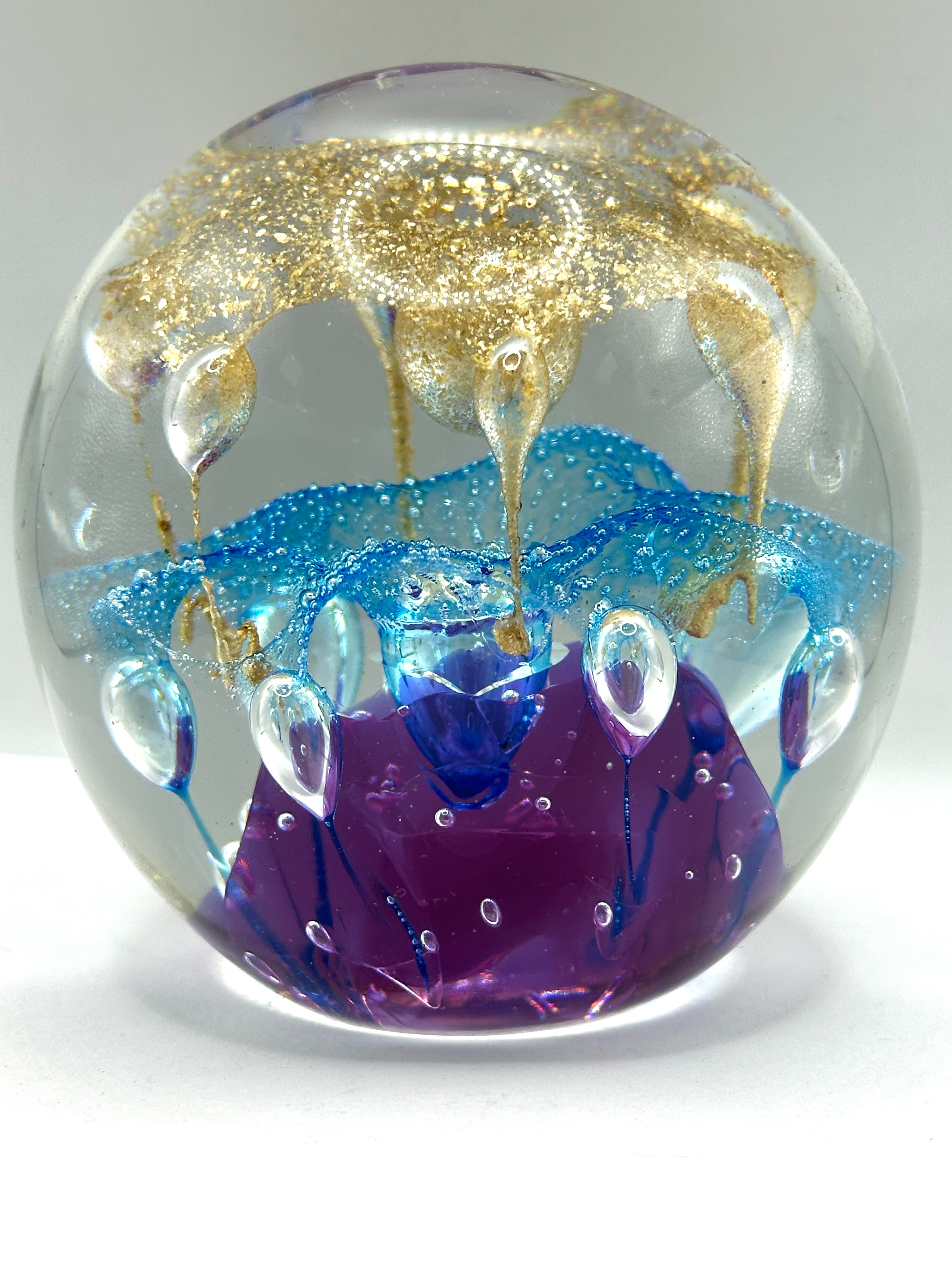 A spherical art glass paperweight featuring a complex internal composition. The clear glass dome encases an abstract design with a textured, shimmering gold frit or aventurine layer at the top, creating a cloud-like effect with drips extending downwards. Beneath this, a wavy mass of translucent bright blue glass with numerous encapsulated air bubbles forms a mid-layer. The base of the internal design consists of an organically shaped mass of translucent purple glass, also containing trapped air bubbles, from which several clear glass teardrop-like elements extend. A white label affixed to the flat base bears the handwritten inscription “13 Salena CATTANEO.”