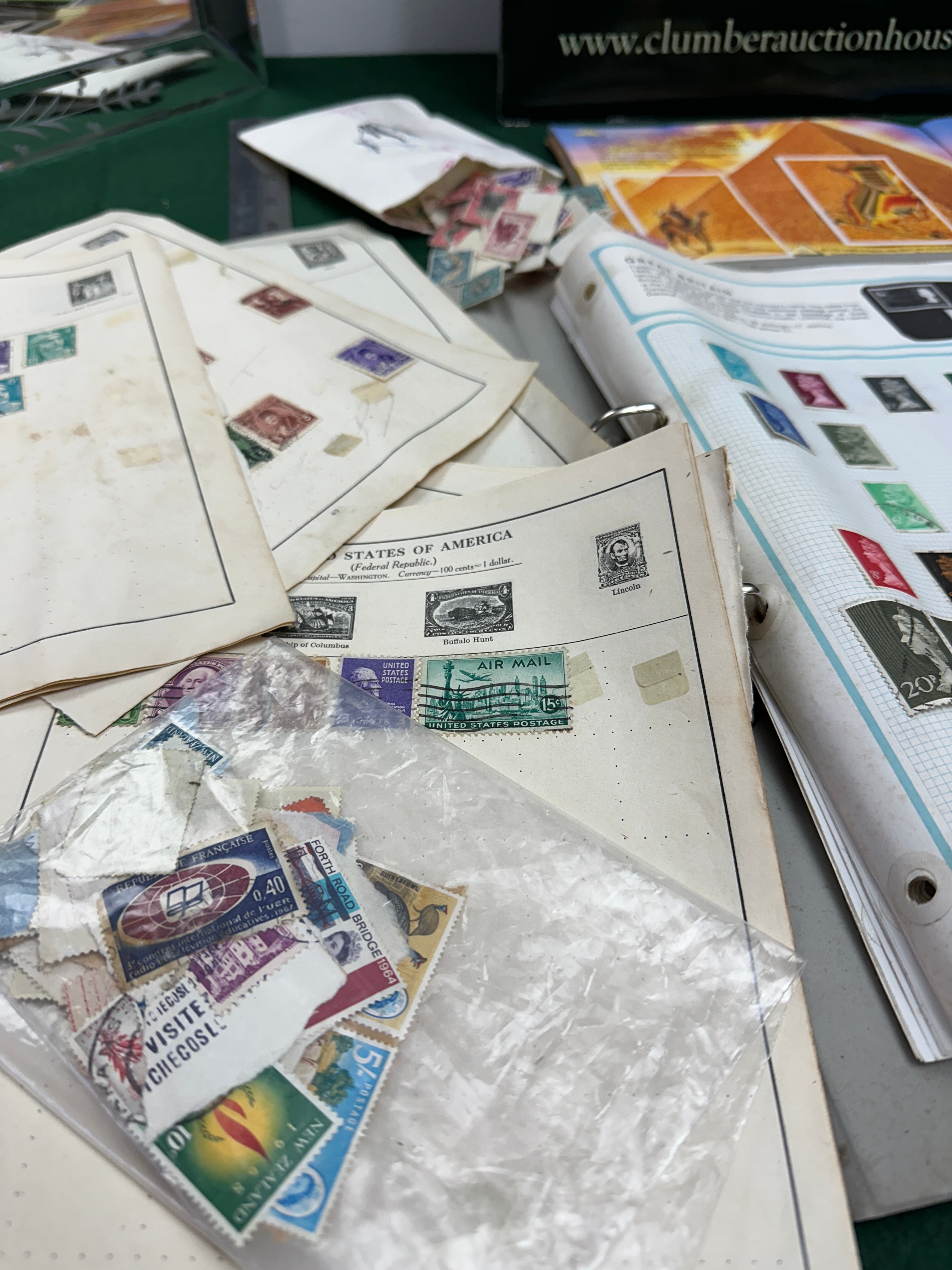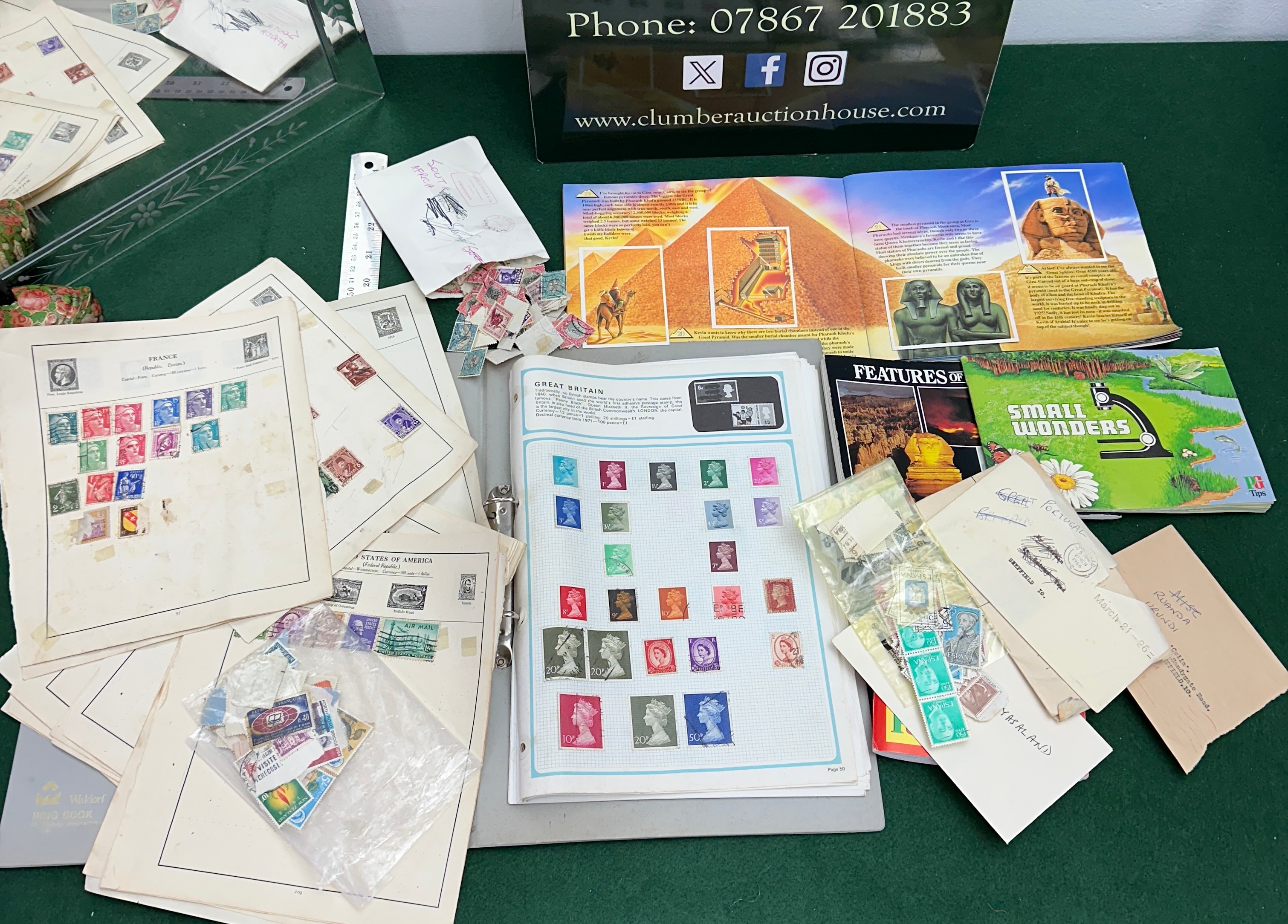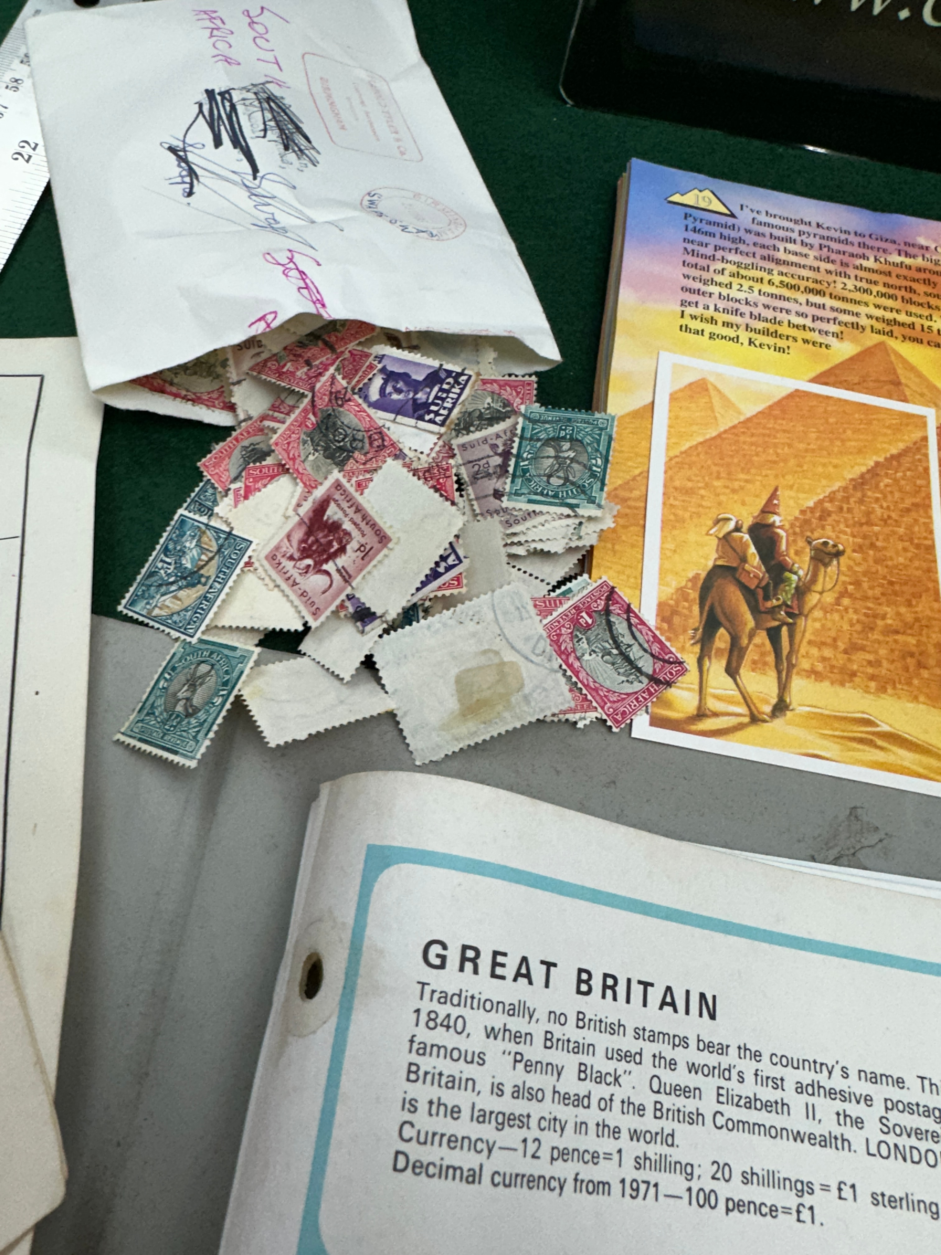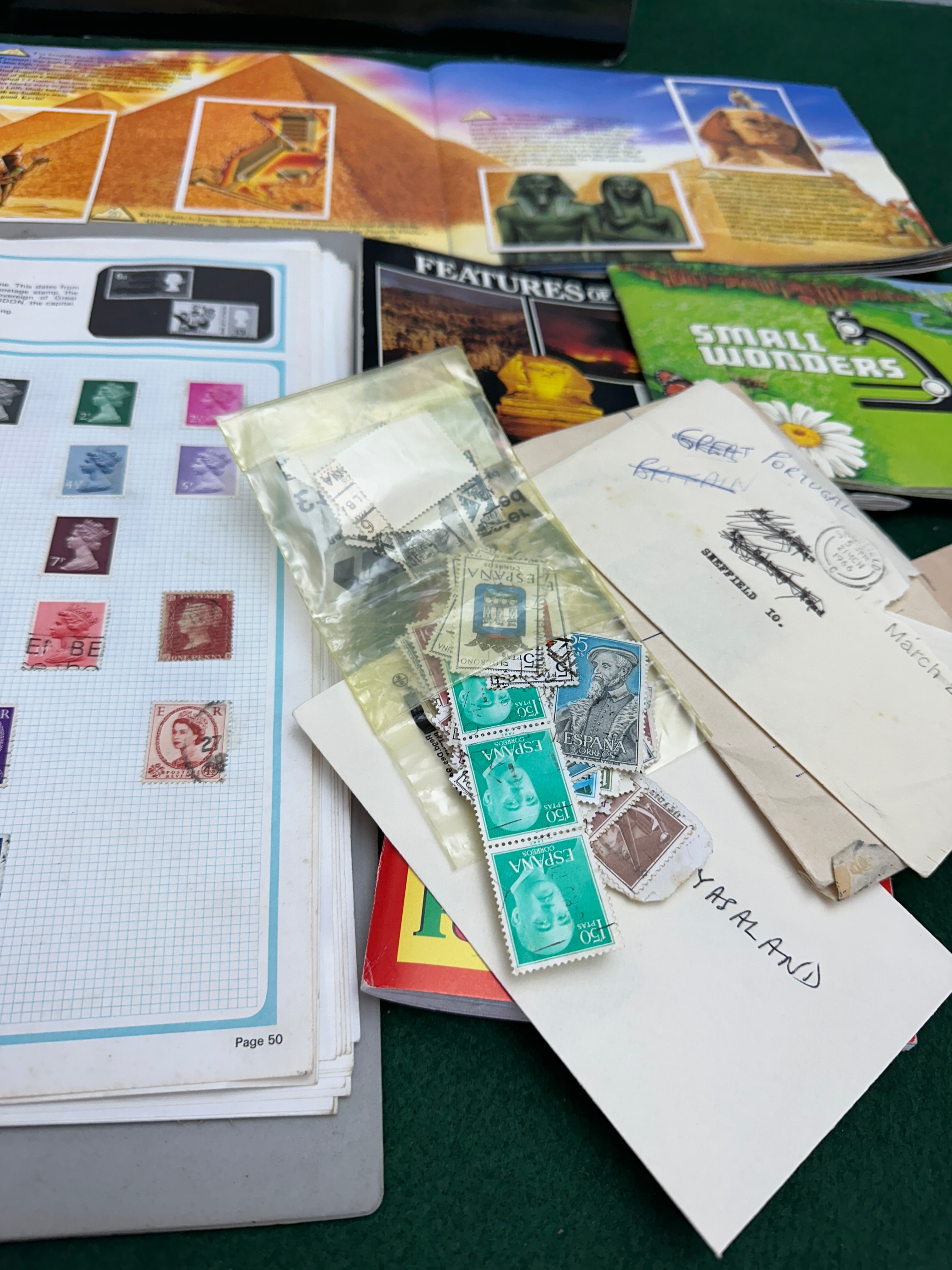A diverse collection of international postage stamps, presented in various formats. Key visible origins include Great Britain, United States of America, France, Czechoslovakia, Spain (ESPAÑA), and New Zealand, with examples featuring monarchs such as Queen Elizabeth II, as well as historical figures and landmarks, indicating a span from potentially the mid-20th century onwards. The stamps are found mounted on aged paper album pages, some explicitly labeled “GREAT BRITAIN” and “STATES OF AMERICA (Federal Republic)”, alongside loose stamps contained within small plastic bags or spilling from handwritten envelopes marked with geographic names like “NYASALAND” and “SHEFFIELD 10.”. Supplemental items include several small, illustrated paper books, one open to display images of Egyptian pyramids and a sphinx, and additional handwritten envelopes.
