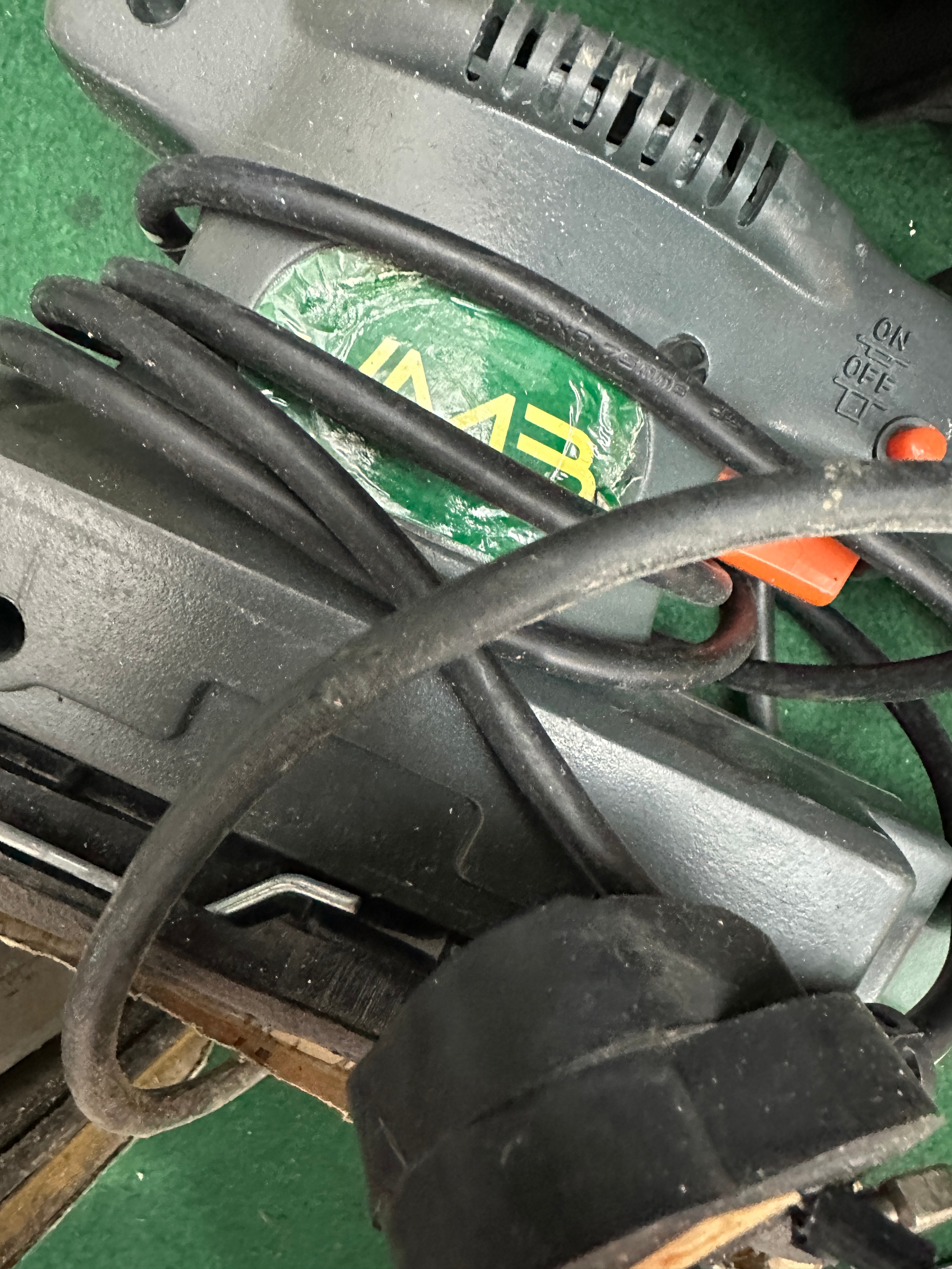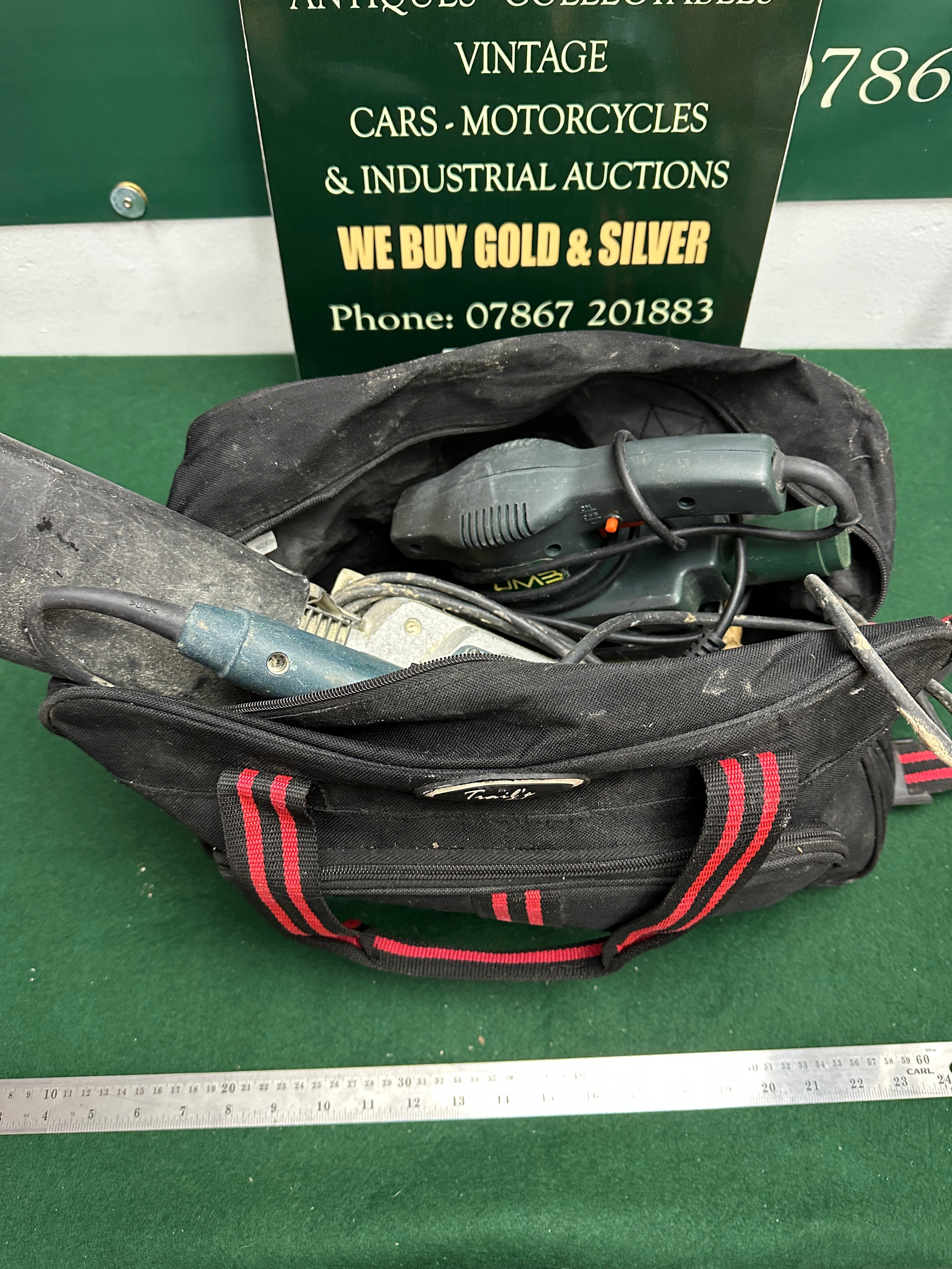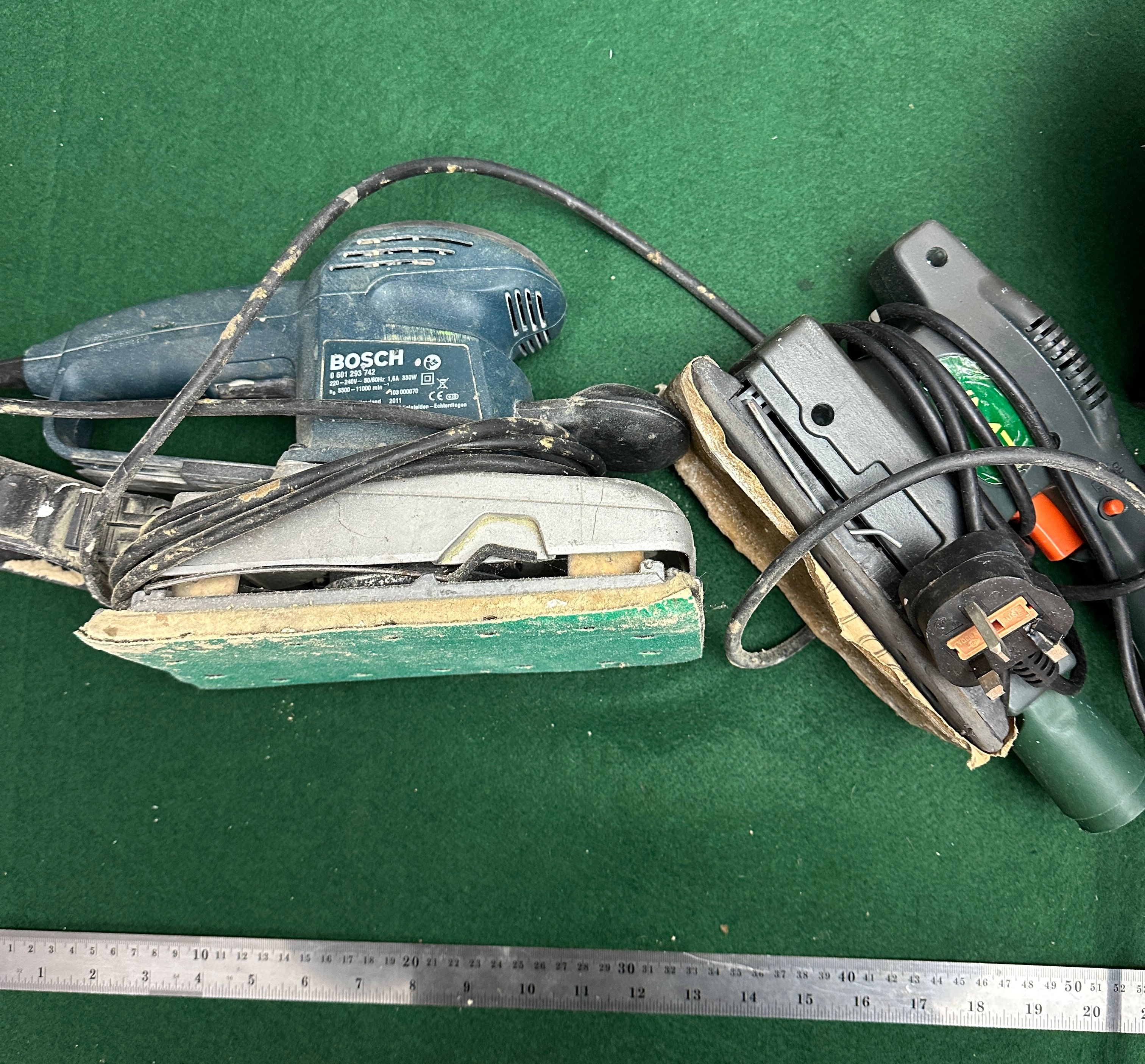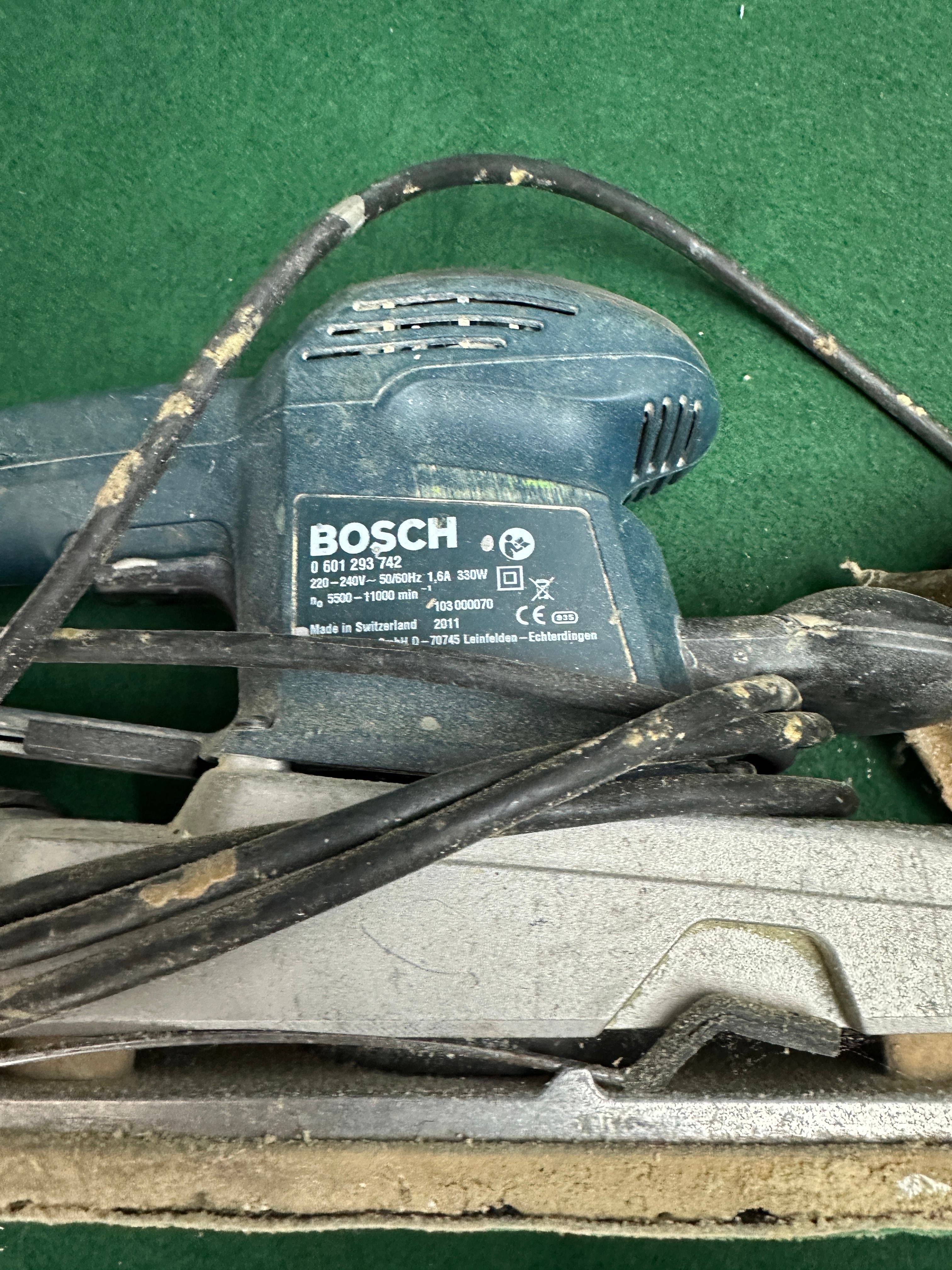 A Bosch GSS 28A Orbital Sander, model 0 601 293 723, of blue plastic and metal construction. It is marked ‘BOSCH’ with power specifications ‘230V 50/60Hz 1.6A 330W’ and an RPM range of ‘5500 – 11000 min⁻¹’. The tool is noted as ‘Made in Switzerland’ with a German address, ‘D – 70745 Leinfelden-Echterdingen’. It is accompanied by a dark grey electric sander, also of plastic and metal construction, featuring a partially visible green label suggesting a brand like ‘LIV’ or ‘LM’ and an ‘ON/OFF’ switch. Both tools exhibit signs of heavy use, have worn sanding pads, and are fitted with UK-style three-pin power plugs. They are contained within a dusty black textile carrying bag, possibly branded ‘Travall’, along with a standard metal ruler.